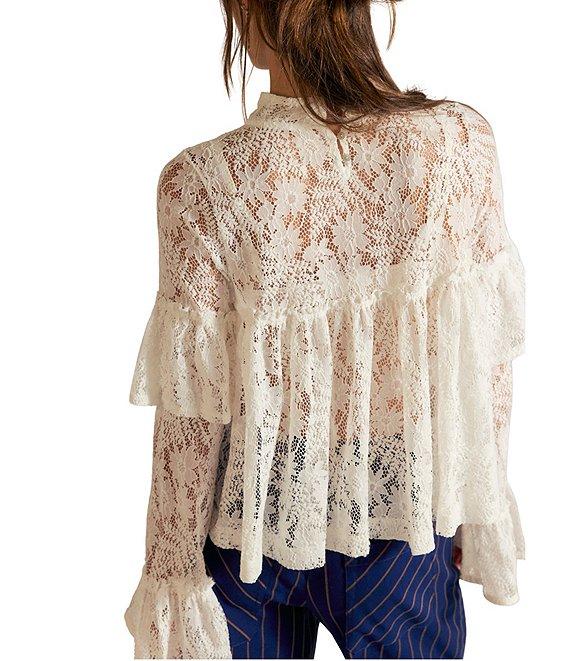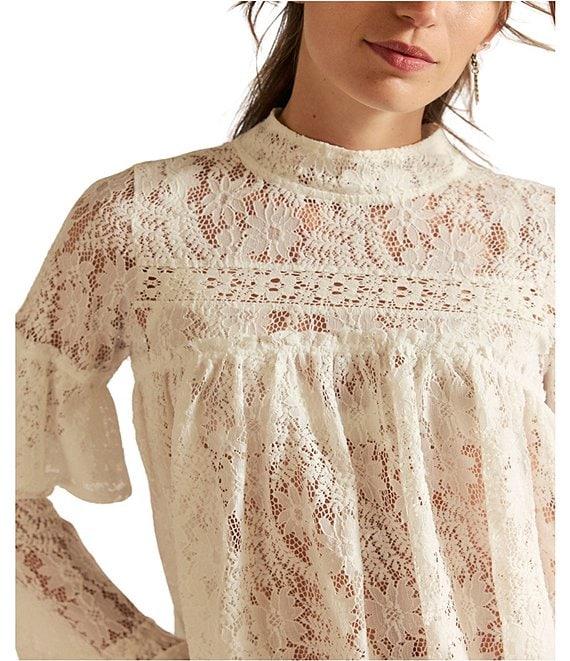 Free People Lilabeth Sheer Lace Mock Neck Long Flared Sleeve Top
