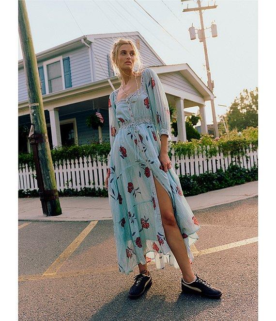 From Free People, this dress features: Floral print Square neckline 3/4 sleeves Button front closure A-line silhouette Tie waist detail Back tie detail Lace detailing Lined Approx. 49.25" length Self: Cotton Lining: Cotton Machine wash cold Imported.
