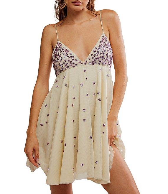 From Free People, this dress features: Tulle fabrication V-neckline Sleeveless Tie back closure Pull over construction Empire waist silhouette Adjustable strap detail Embellished detail Mini length Approx. 25.5" length Polyester Hand wash Imported.