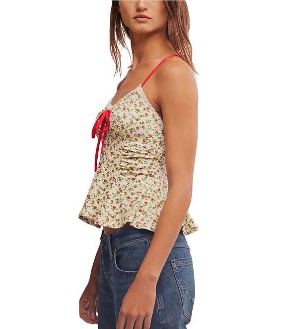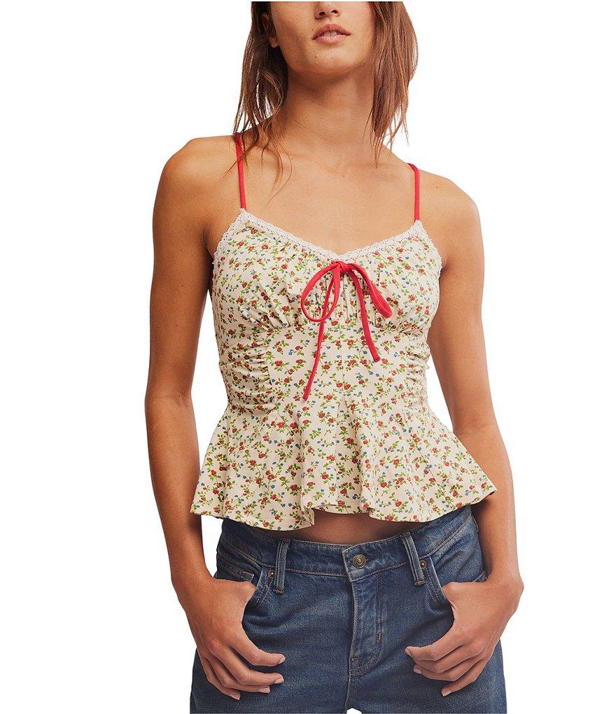 From Free People, this tank features: Floral print Sweetheart neckline Sleeveless Pullover construction Ruched bust detail Lace trim detail Adjustable strap detail Front bow detail Cotton/elastane Machine wash Imported.