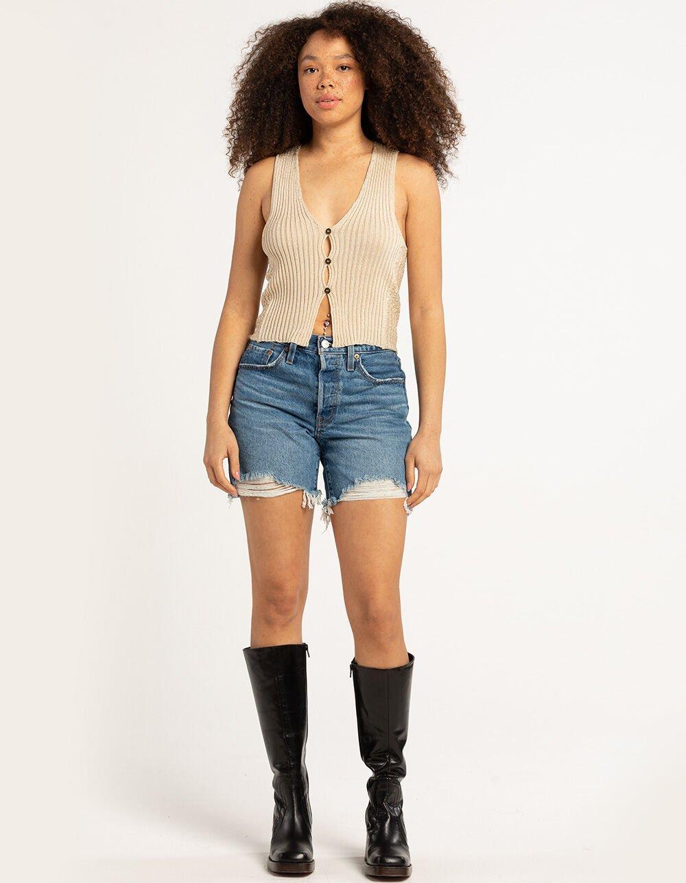 TAN. Free People Seascape Vest. Rib knit construction with contrast lace panels. V-neckline. Button front. Metallic threading throughout. Fixed shoulder straps. Racerback. 95% Viscose, 3% Polyamide, 2% Metallized Fiber. Hand wash. Imported.
