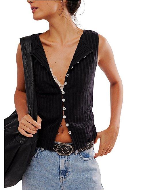 From Free People, this vest features: Ribbed knit fabrication with a stretchy feel fabrication Crew neckline Sleeveless Relaxed fit Straight hem Button/loop closure Approx. 20.5" length Cotton/elastane Machine wash Imported.