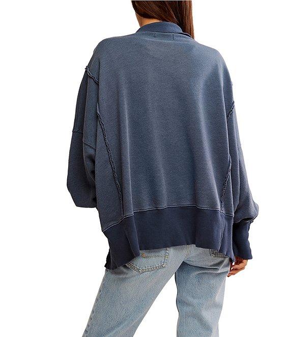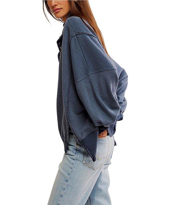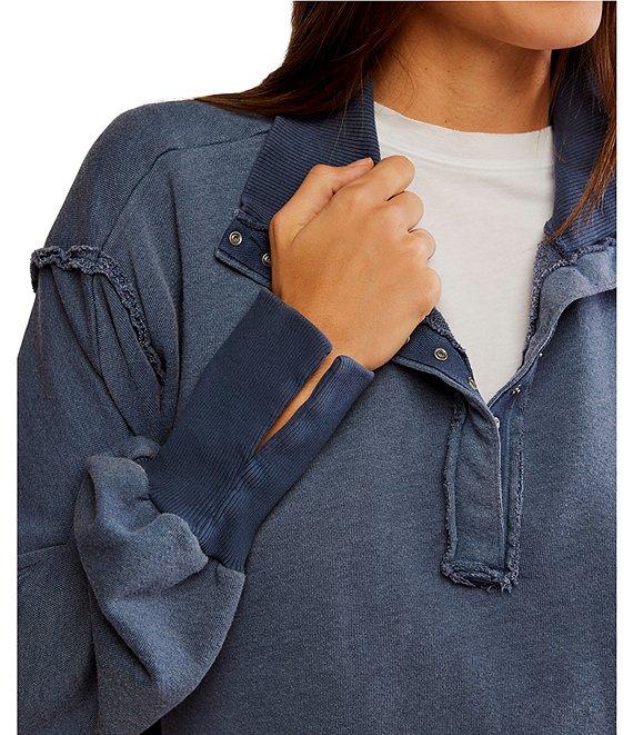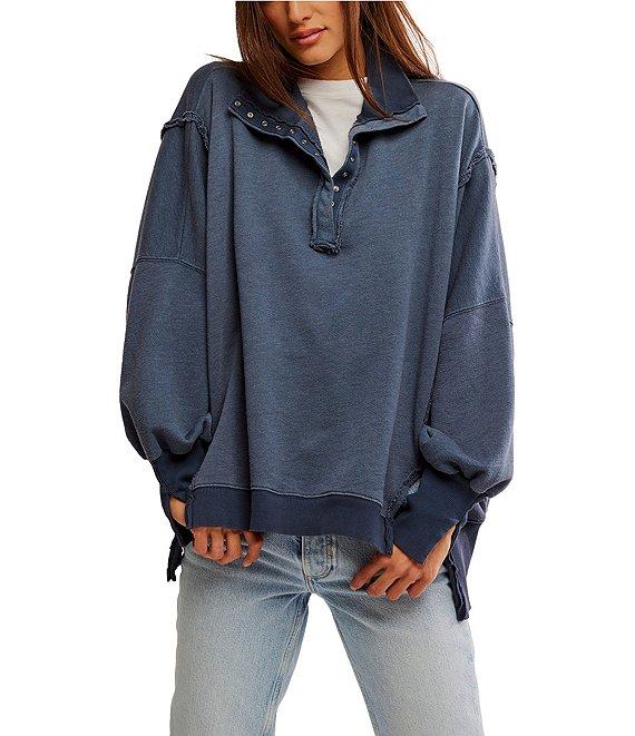 From Free People, this sweatshirt features: Soft fabrication Henley/collar neckline Long sleeves Exposed seam detail Side slit detail Ribbed hemline Snap buttons at neckline Pullover construction Approx. 28.5" length Cotton/polyester Machine wash/dry flat Imported.