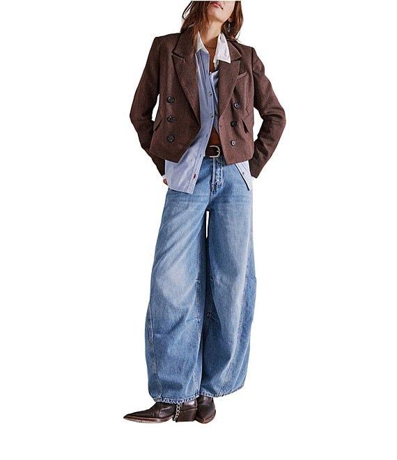 From Free People, these jeans feature: Denim fabrication Mid rise Wide leg Zip fly/button closure 5 pocket jean style Relaxed fit Tucked pleating at the knee Approx. 12.25" rise, 29.5" inseam Cotton/lyocell Machine wash/tumble dry Imported.