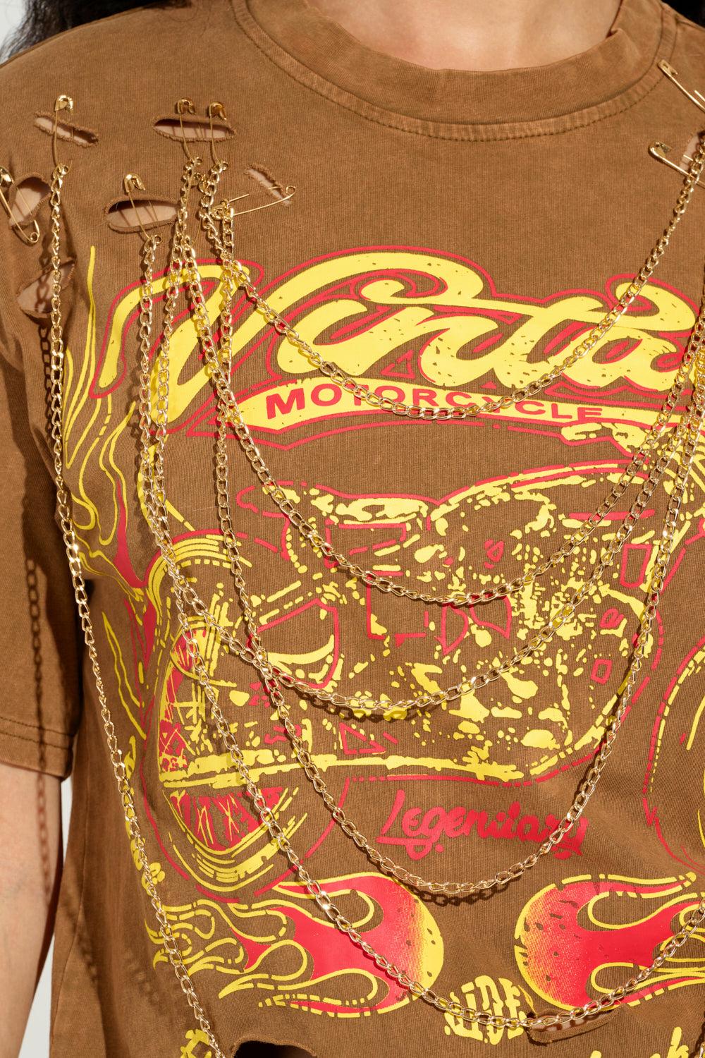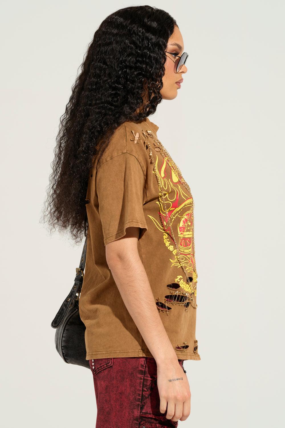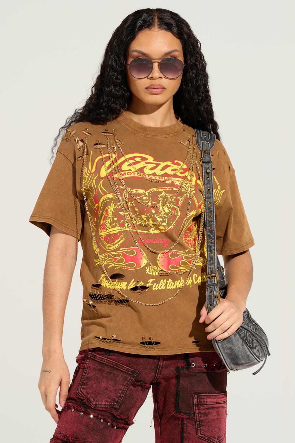 Live life by your own rules in The AKIRA Label Freedom Oversized Tee. This grunge style is crafted from a stretchy cotton knit base and features a bold contrast graphic print on the front, a crew neckline, short sleeves, subtle distressed detailing scattered throughout the front and back, paper clip embellishments scattered throughout, and layers of faux gold metallic chain link detailing draped across the front. Complete with an oversized, baggy silhouette and a pull-on fit. Pair with a mini skirt and platform booties to radiate fierceness. - Shell: 100% Cotton- Stretchy- Imported (all measurements approximate from size small)- 23” Shoulder to Hem- 7.5” Sleeves- 21” Shoulder to Shoulder- Model is 5’11” and is wearing size smallProduct ID: 435903 (all measurements approximate from size 1X)- 25” Shoulder to Hem- 8.5” Sleeves- 24” Shoulder to ShoulderProduct ID: 435907