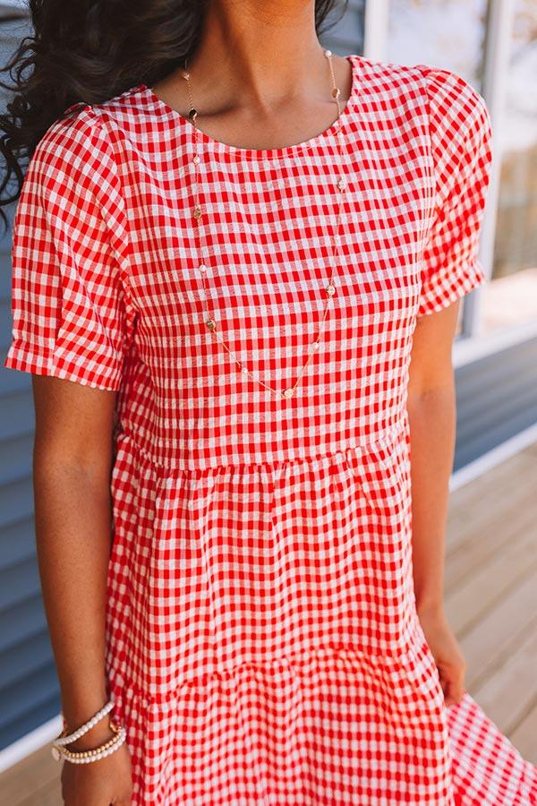 - This stylish dress is giving patriotic vibes! - Lightweight, unlined material with a gingham pattern - A round neckline with back zip closure - A relaxed silhouette that ends in straight midi-length hemlines