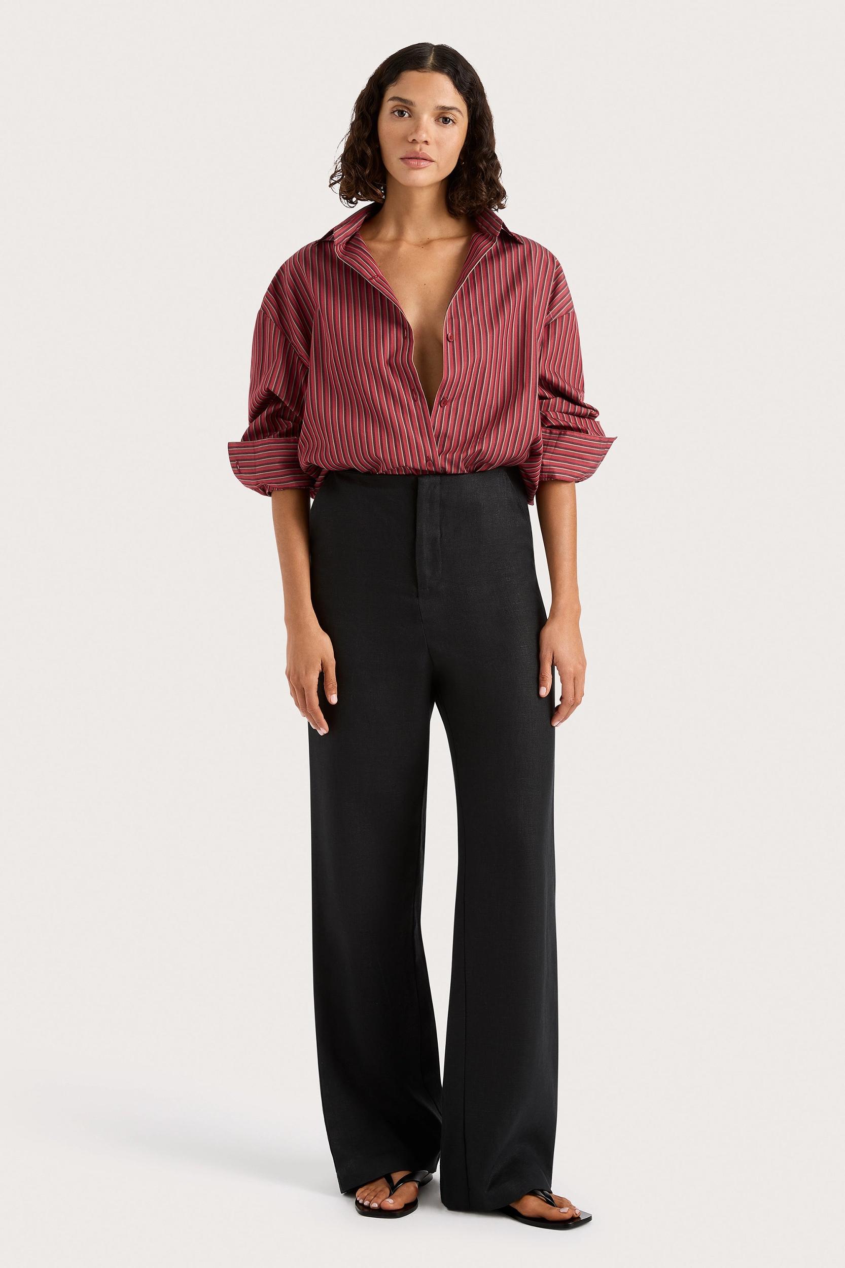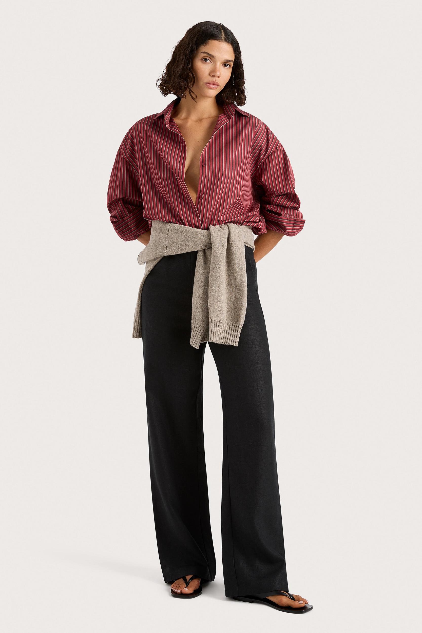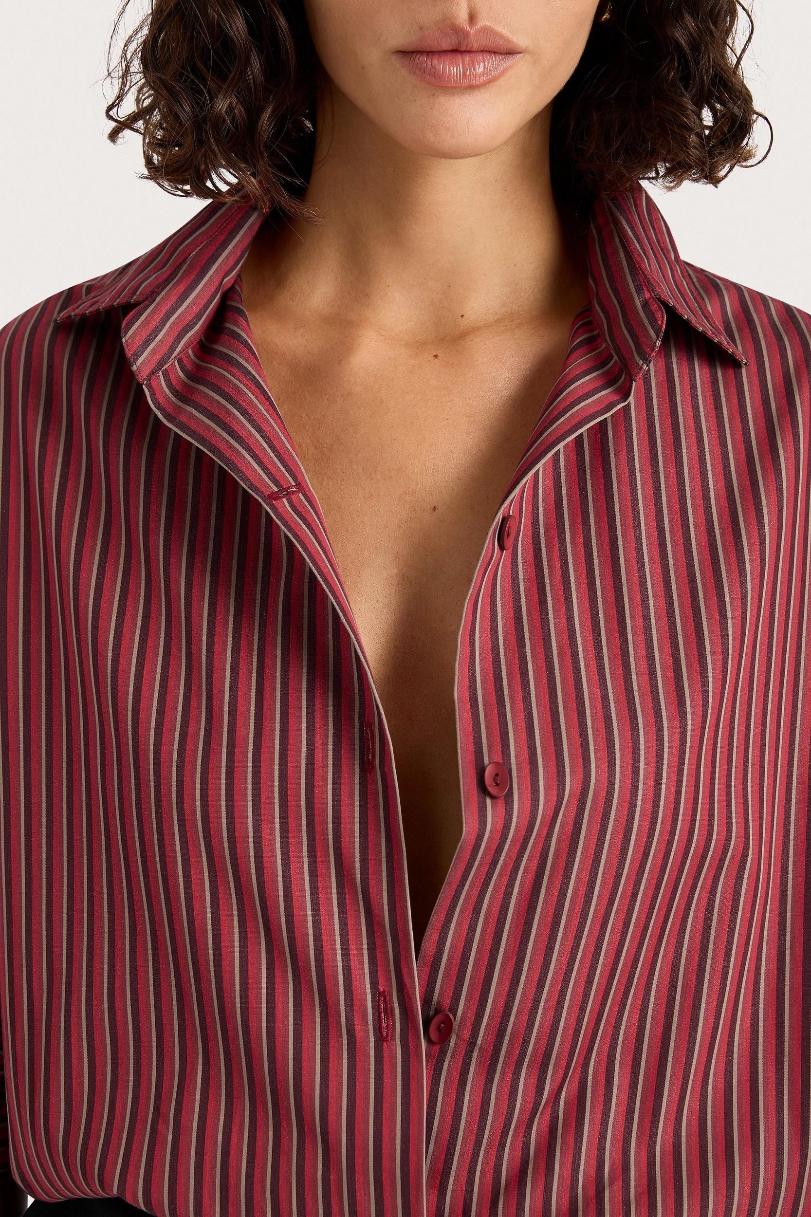 A classic oversized button-up shirt with organic oval shape buttons down the front. Cut from a yarn-dyed wine red stripe in organic cotton, it is both transeasonal and versatile in styling, making for the perfect addition to your capsule wardrobe. Wear with the matching Freja Pant or style over a classic pair of trousers.