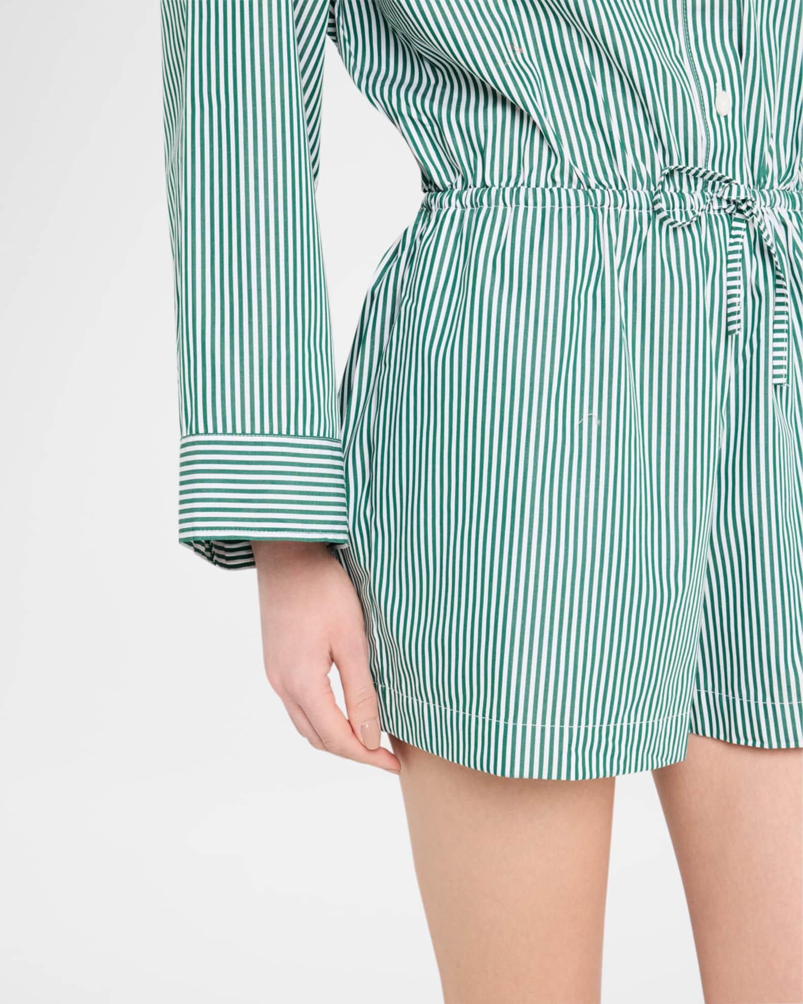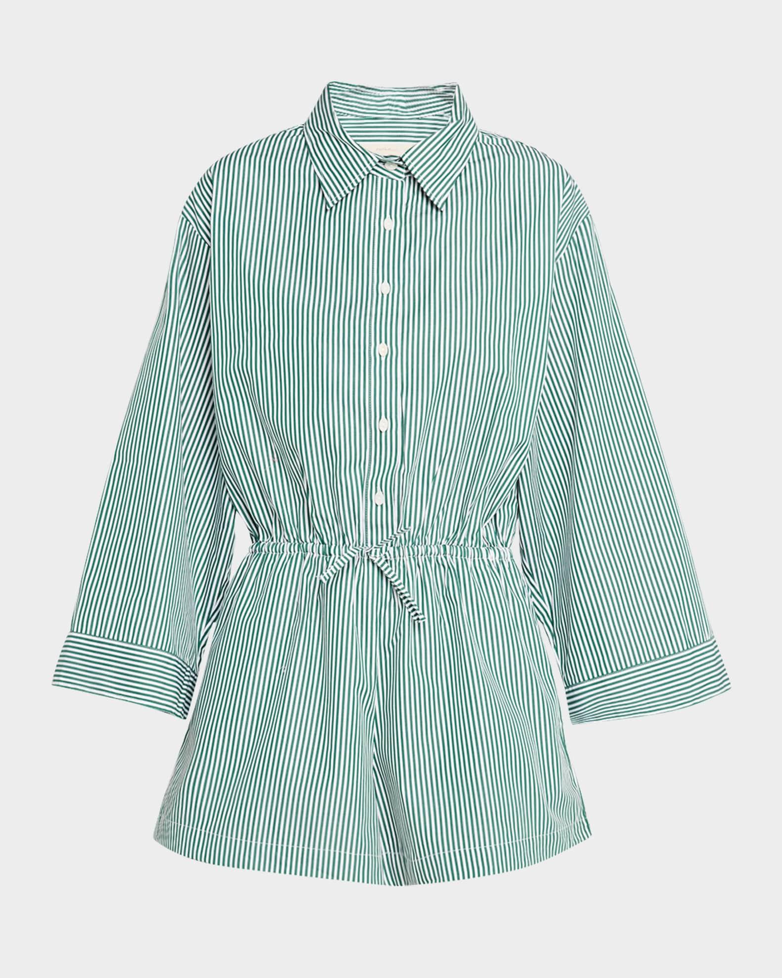 Faithfull the Brand "Freja" playsuit crafted from a stretch cotton fabric in a classic pinstriped design Spread collar; partial button front Dropped shouldes Long flared sleeves; button cuffs Yoked back Self-tie drawstring waistband Relaxed legs Cotton/elastane Hand wash, wash inside out, wash separately Imported