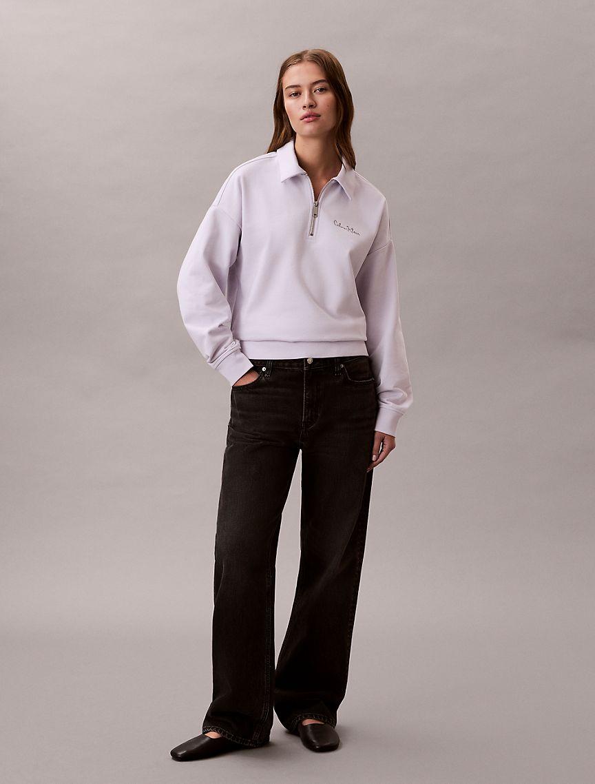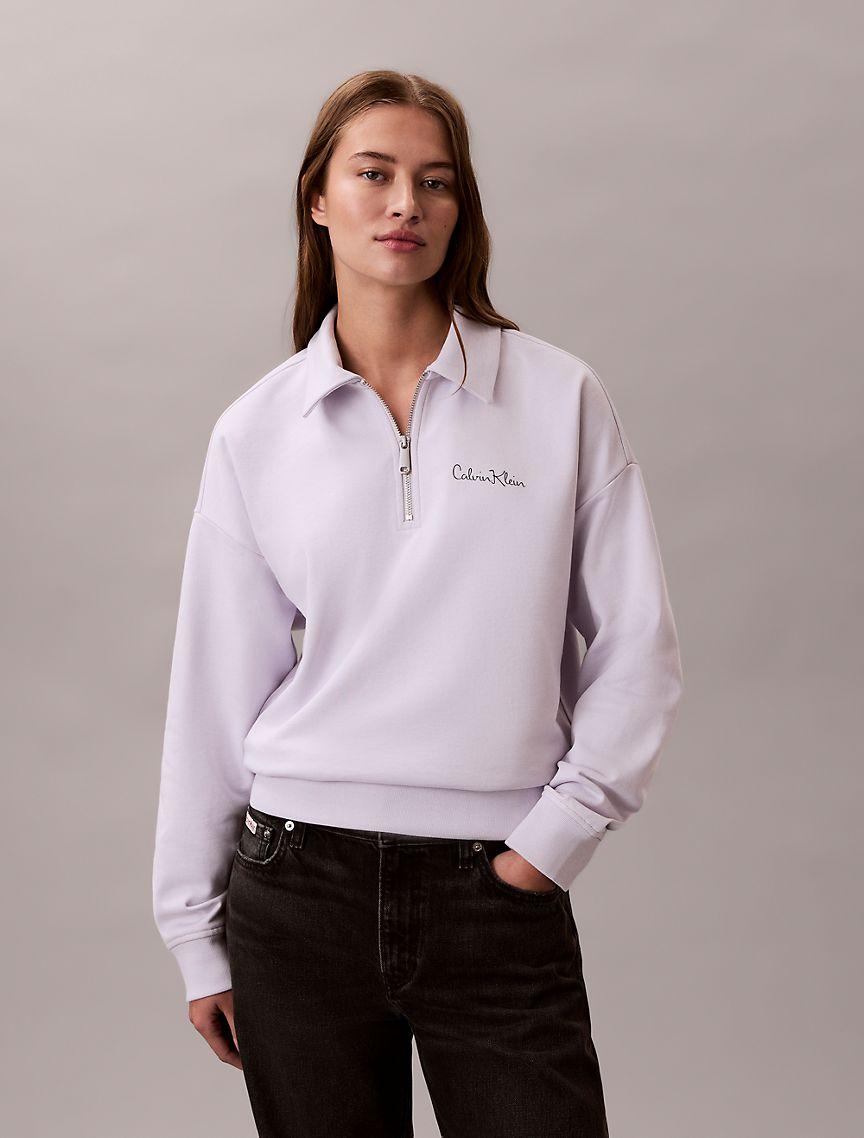 A relaxed quarter zip sweatshirt embroidered with a logo detail at the upper chest. This sweatshirt is made from soft French terry for lounge comfort. Ribbed at the sleeve cuffs and hem.