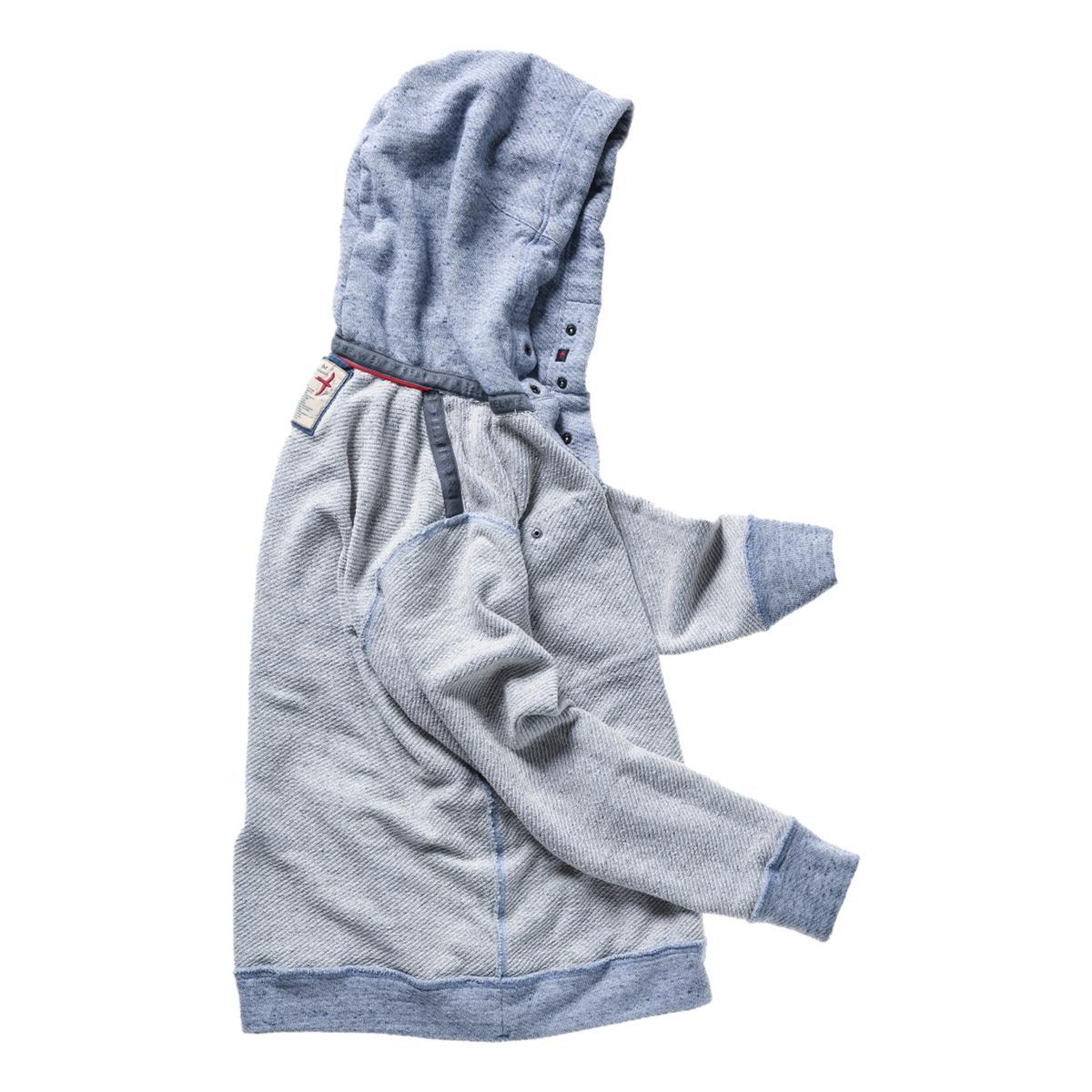 Is there anything more comfortable than a naturally textured french terry garment? Their latest knit of 94% organic cotton has a very unique hi-low texture of 2-color yarn that, in combination with the knitted grain, yields a rugged look that's distinctly Relwen. fit: relaxed content: 94% organic cotton, 6% polyester, knitted diagonal twill french terry, 370 gsm double layer hood w/ reinforcing tape behind black oxidized 3-snap placket opening reinforced snap closure open patch chest pocket knit polyester tape at interior neck and shoulder seams for clean finish straddle stitch seam construction w/ bartacks at ends of side and underarm seams care: machine wash cold, no bleach, air dry or tumble low imported