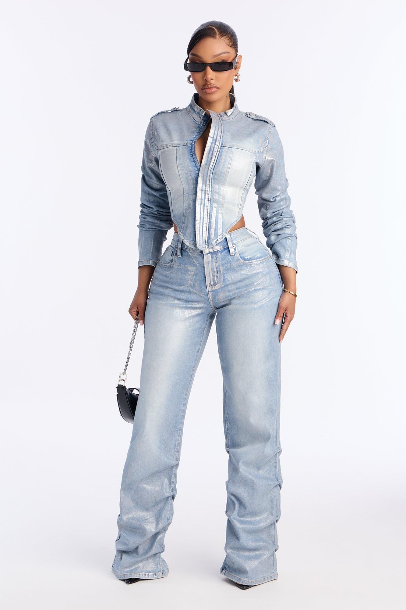 Available In Light Wash. Pair With Frenchie Foil Stacked Straight Leg Jeans Denim Jacket Silver Foil Stacked Scrunchy Sleeves Chest Pockets Cropped Button Closure Medium Stretch Disclaimer: Due To The Specialized Wash, Each Garment Is Unique. 68% Cotton 30% Polyester 2% Spandex Imported California Proposition 65WARNING: Cancer and Reproductive Harm - www.P65Warnings.ca.gov.