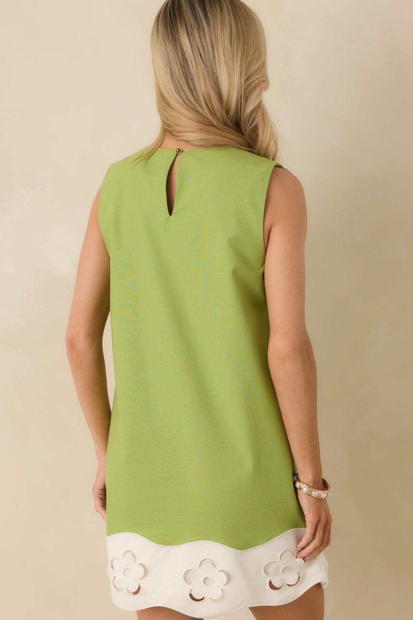 The Fresh Cut Flowers Apple Green Floral Detail Sleeveless Mini Dress is the kind of dress that makes getting dressed feel instantly easy. The crisp apple green hue brings a bright, upbeat feel, while the clean sleeveless silhouette keeps things simple and flattering. Finished with a floral cutout hem for a playful twist, it’s perfect for sunny days, casual plans, and anything that calls for an effortless pop of color. This green mini dress features a round neckline, sleeveless design, and a relaxed shift silhouette. Finished with a white contrast hem showcasing floral cutout detailing and a back keyhole with button closure. 50% Cotton, 30% Linen, & 20% PolyesterContrast: 50% Cotton, 30% Linen, & 20% Polyester Lining: 100% Rayon Hand Wash Cold Manufactured in China Designed in The USA Model is 5'6" and Wearing a Size Small, Clipped, Model is a True X-Small