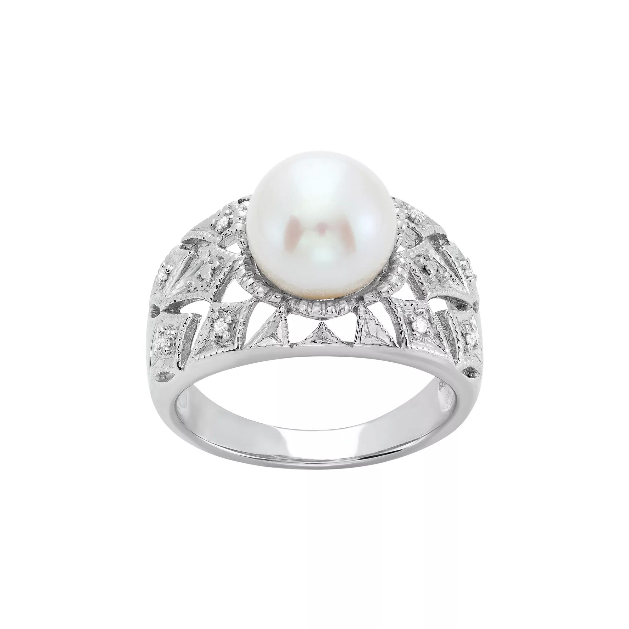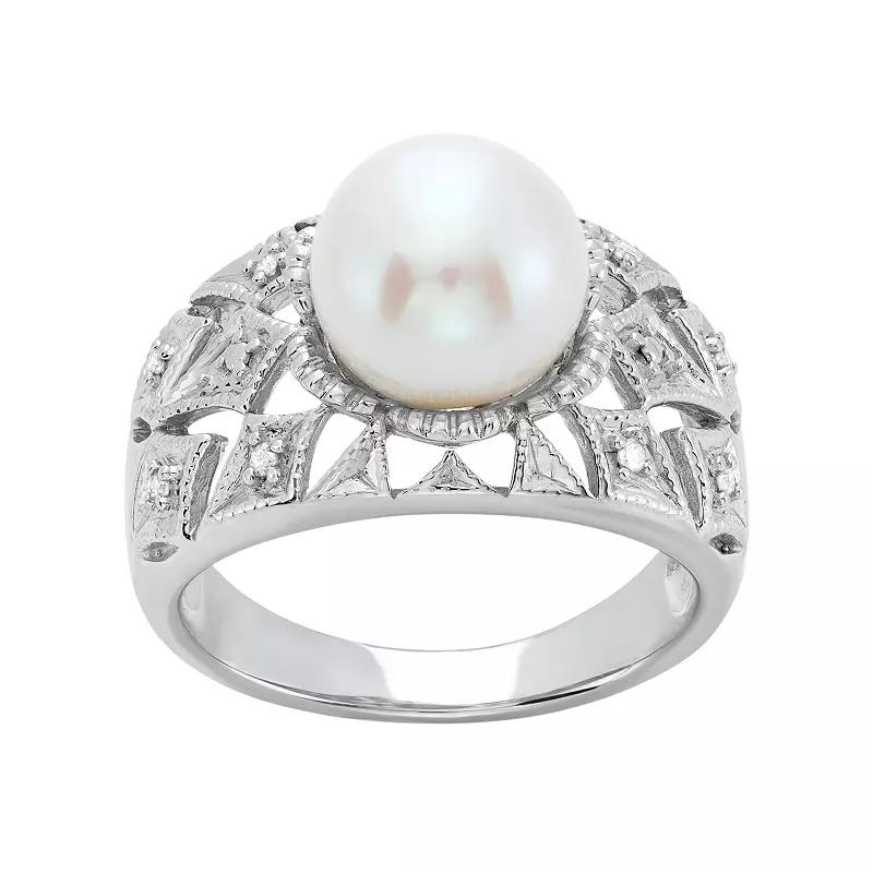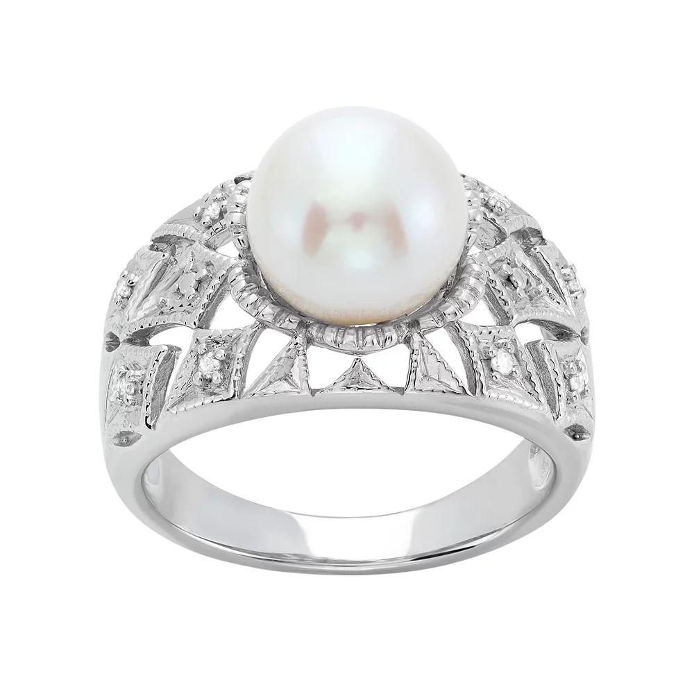 Enchanting beauty is effortless with this sterling silver ring. A freshwater cultured pearl and diamond-accented open-worked band make it a lovely choice. Comes in a gift box.RING DETAILS Width: 1 in. Metal: rhodium-plated sterling silver CULTURED PEARL DETAILS Type: freshwater Shape: round Size: 8-9 mm Color: white DIAMOND DETAILS Total weight: less than 1/10 ct. Cut: round Color grade: G-I Clarity: I2-I3 Setting: prong Image(s) may be enlarged to show detail.Diamond weights are approximate. Diamond total weights may vary between .01 and .08 ct. Some diamonds have fewer than 17 facets.Gemstones may have been treated to enhance their appearance. Special care may be required. Please visit our Gemstone Treatment & Special Care Guide for more information. Gender: female. Age Group: adult.
