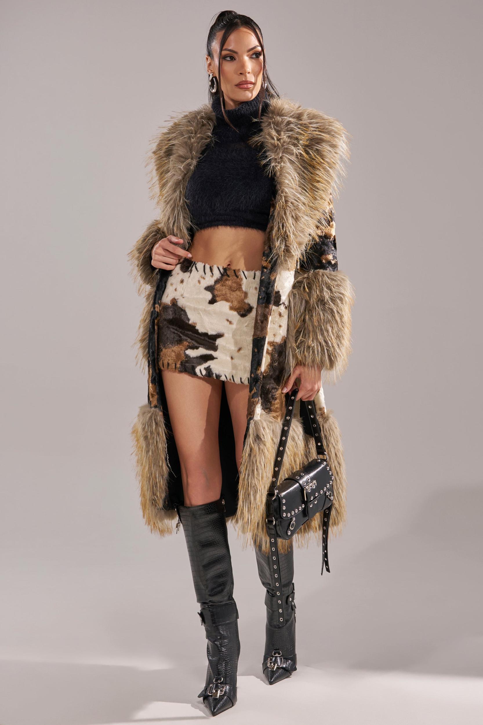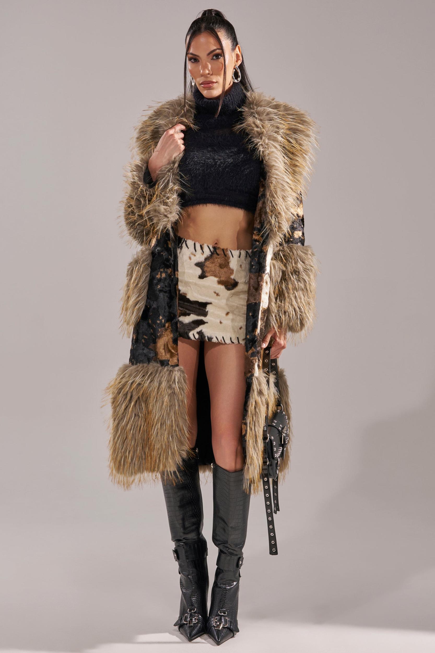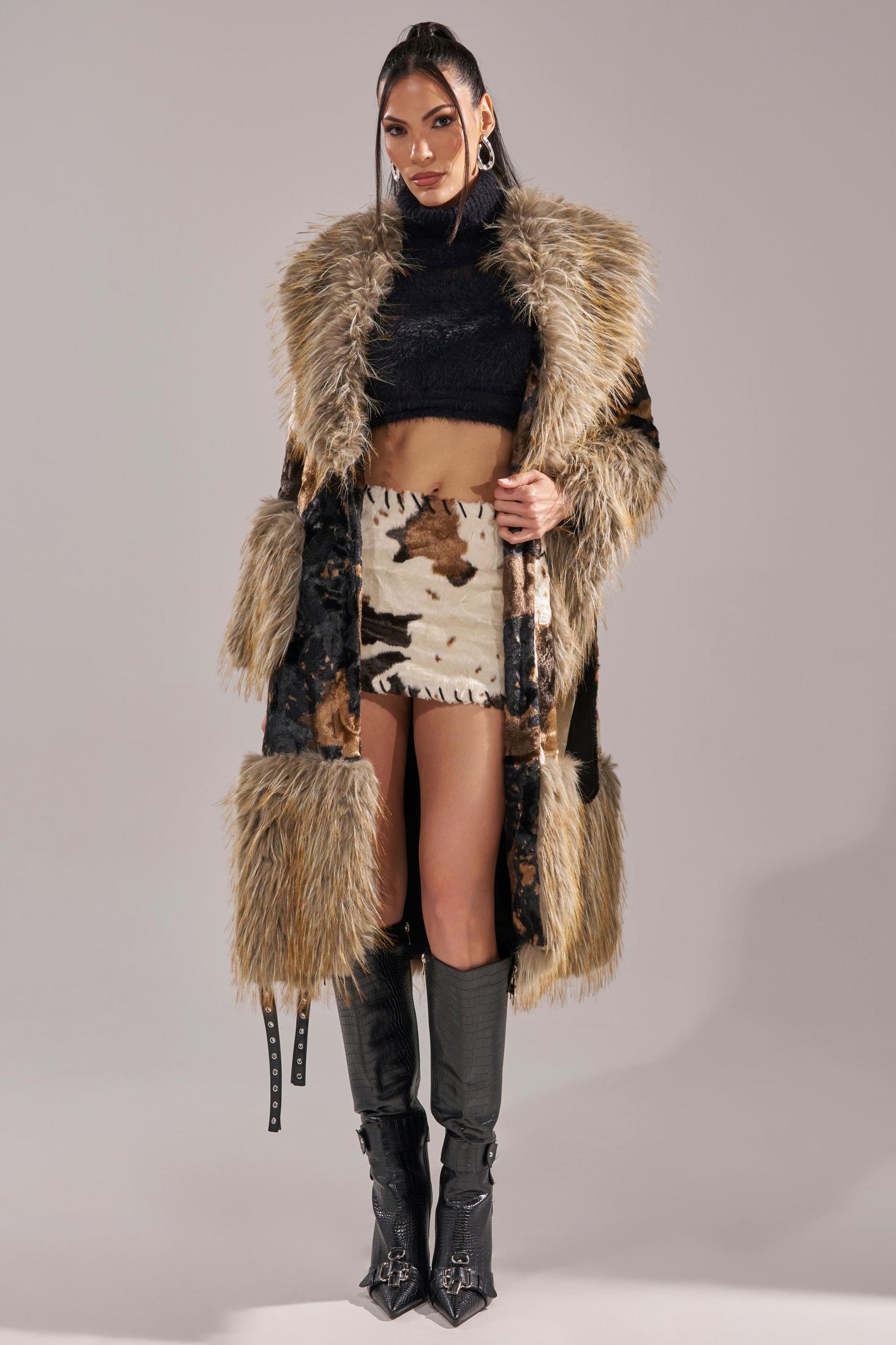 The AKIRA Label Freya Fur Trim Trench is crafted from a lavish faux fur with a split, two-tone cow print throughout. It features ultra-plus faux fur trim hemlines including on the oversized collar, long sleeves with coordinating fur cuffs, a matching adjustable waist belt, dual waist pockets lined with fur, and button front closures. Complete with a longline silhouette. - Main: 100% Polyester, Trim: 100% Polyester, Lining: 95% Polyester 5% Spandex- Spot Clean Only- No Stretch- Imported (all measurements approximate from size small)- 45” Shoulder to Hem- 16” Shoulder to Shoulder- 23” Sleeves- Model is 5’11” and is wearing size smallProduct ID: 1070951 (all measurements approximate from size 1X)- 48” Shoulder to Hem- 18” Shoulder to Shoulder - 24” SleevesProduct ID: 1070955