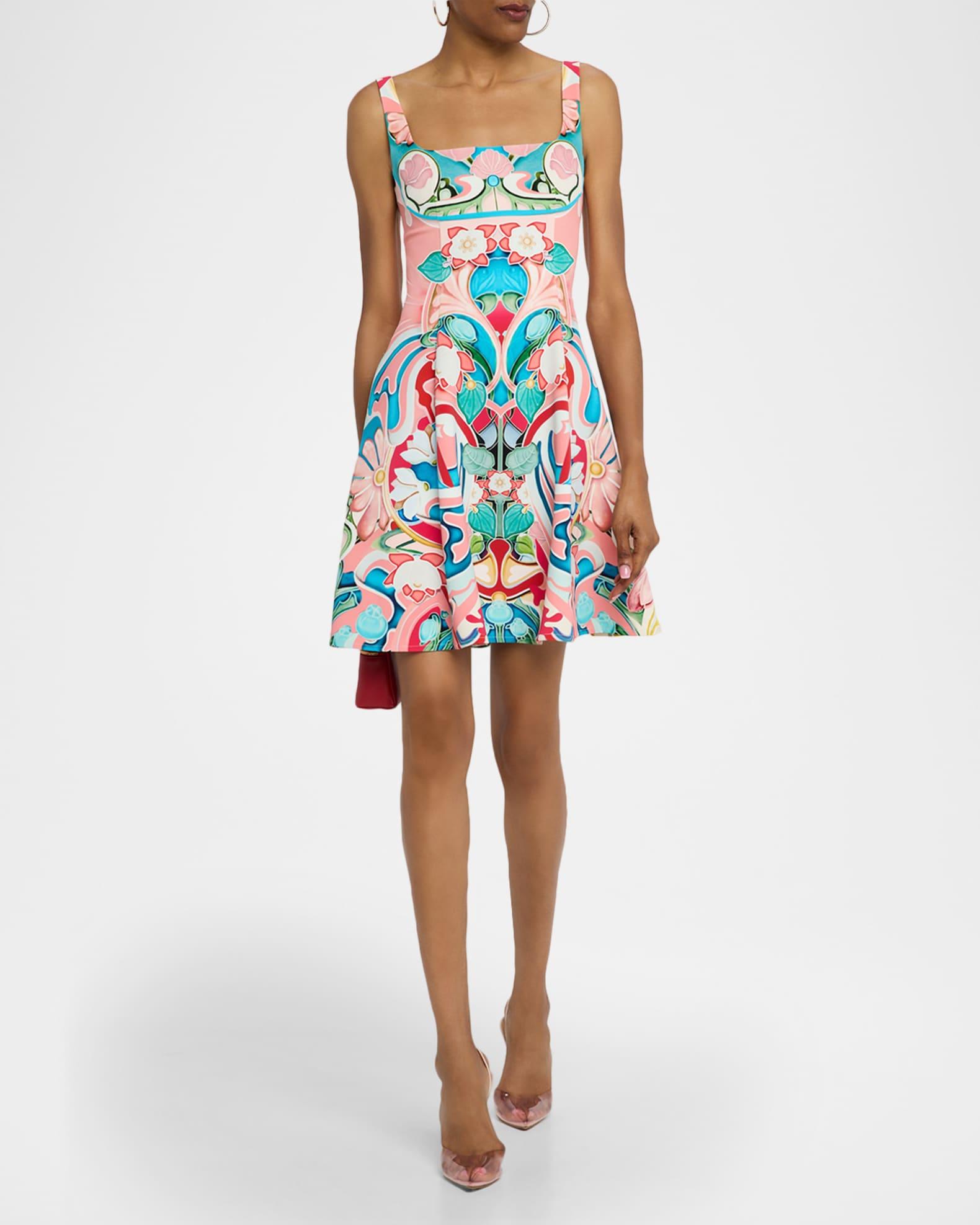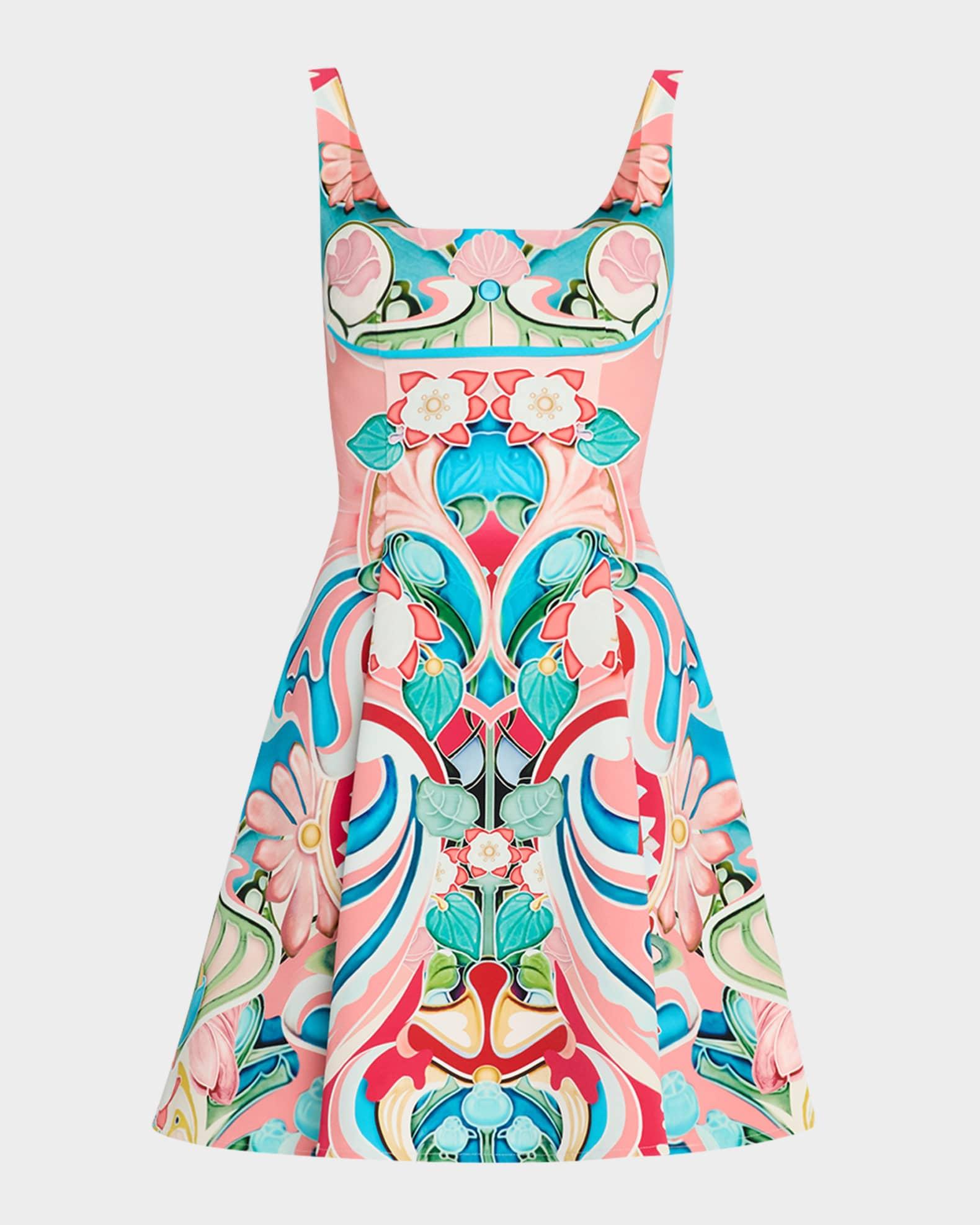 Mary Katrantzou "Freya" dress featuring an abstract print Square neckline; low back Sleeveless Fit-and-flare silhouette Mid-thigh length Back zip Polyester/elastane Made in Romania