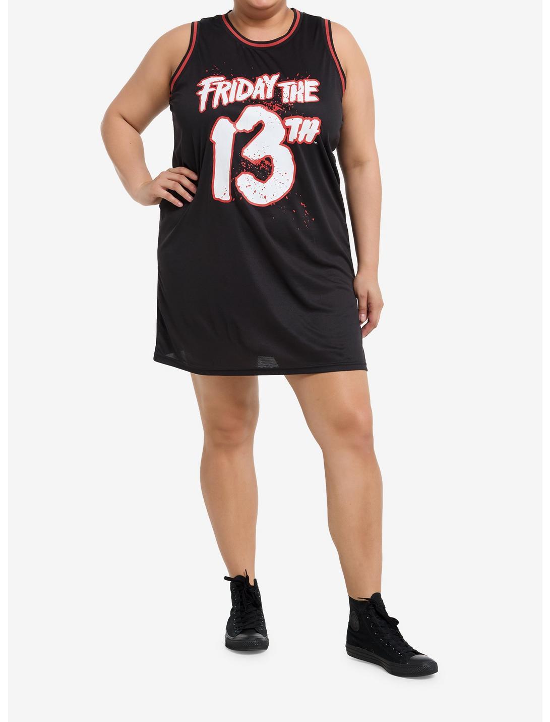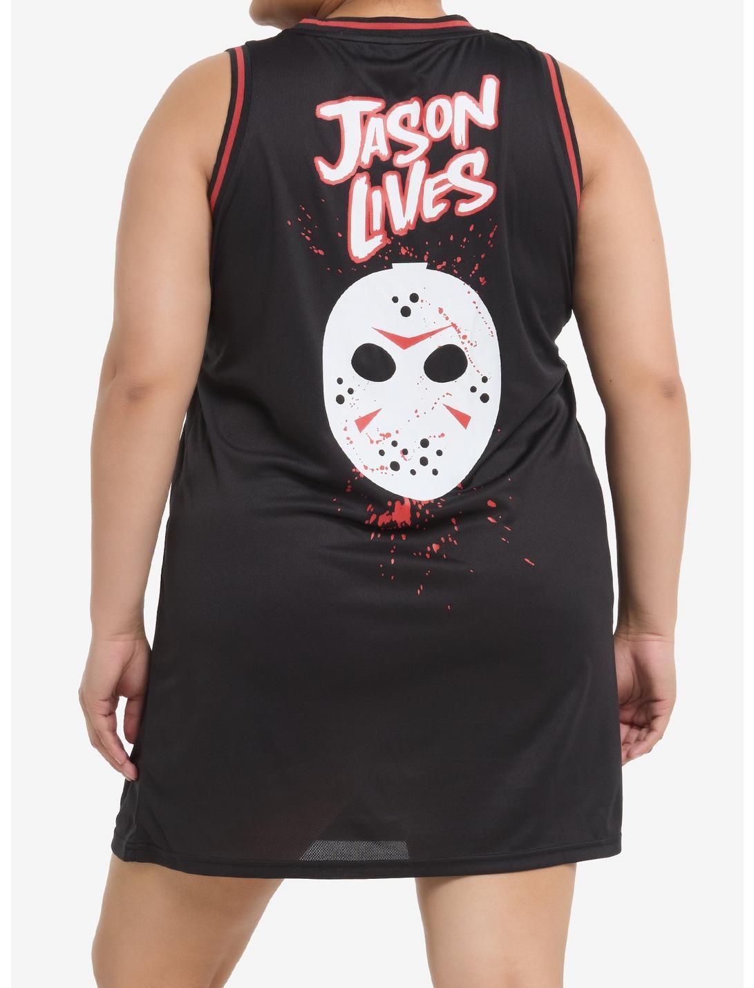 Show everyone you're rooting for Jason Voorhees when you wear this Friday the 13th jersey dress. It's black with red striping at the sleeves and neckline, and shows a blood-splattered film logo on the front, and Jason's mask, blood splatters and text reading, "Jason Lives" on the back.100% polyesterWash cold; dry lowLength: 37"ImportedModel is 5'10"Model wears size 1