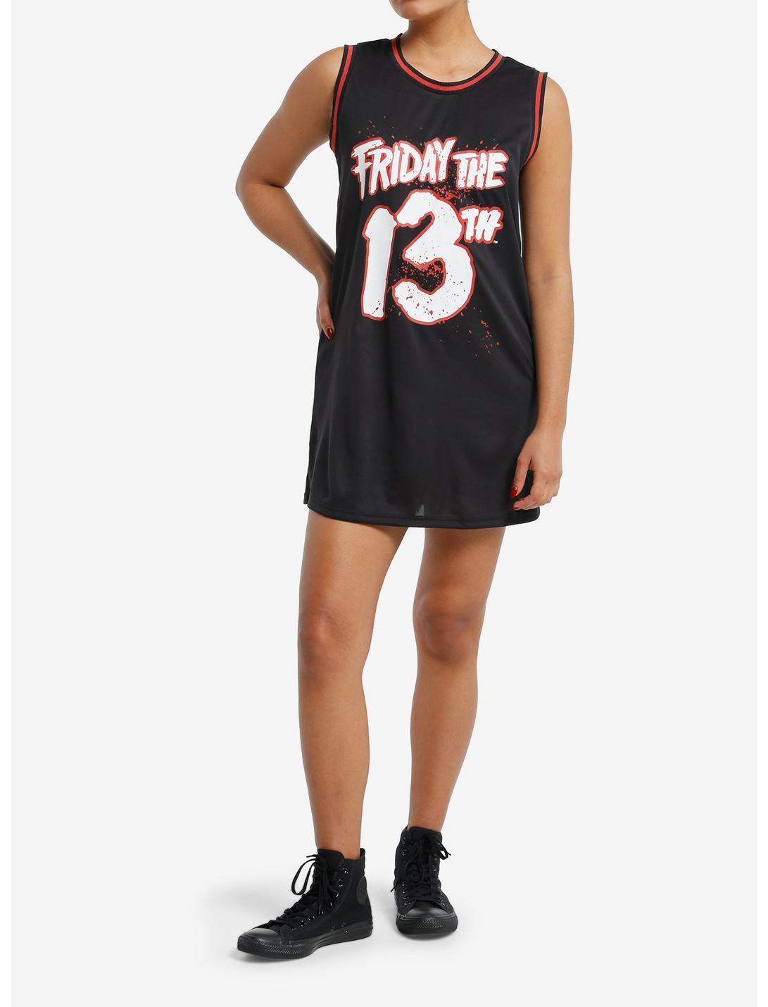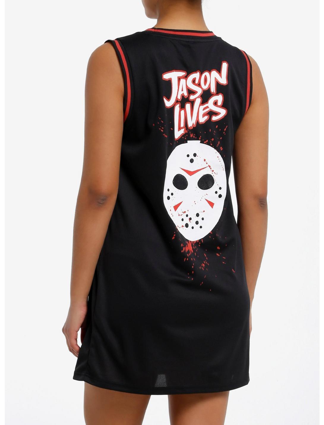 Show everyone you're rooting for Jason Voorhees when you wear this Friday the 13th jersey dress. It's black with red striping at the sleeves and neckline, and shows a blood-splattered film logo on the front, and Jason's mask, blood splatters and text reading, "Jason Lives" on the back.100% polyesterWash cold; dry lowLength: 32 1/2"ImportedListed in junior sizesModel is 5'9"Model wears size Small