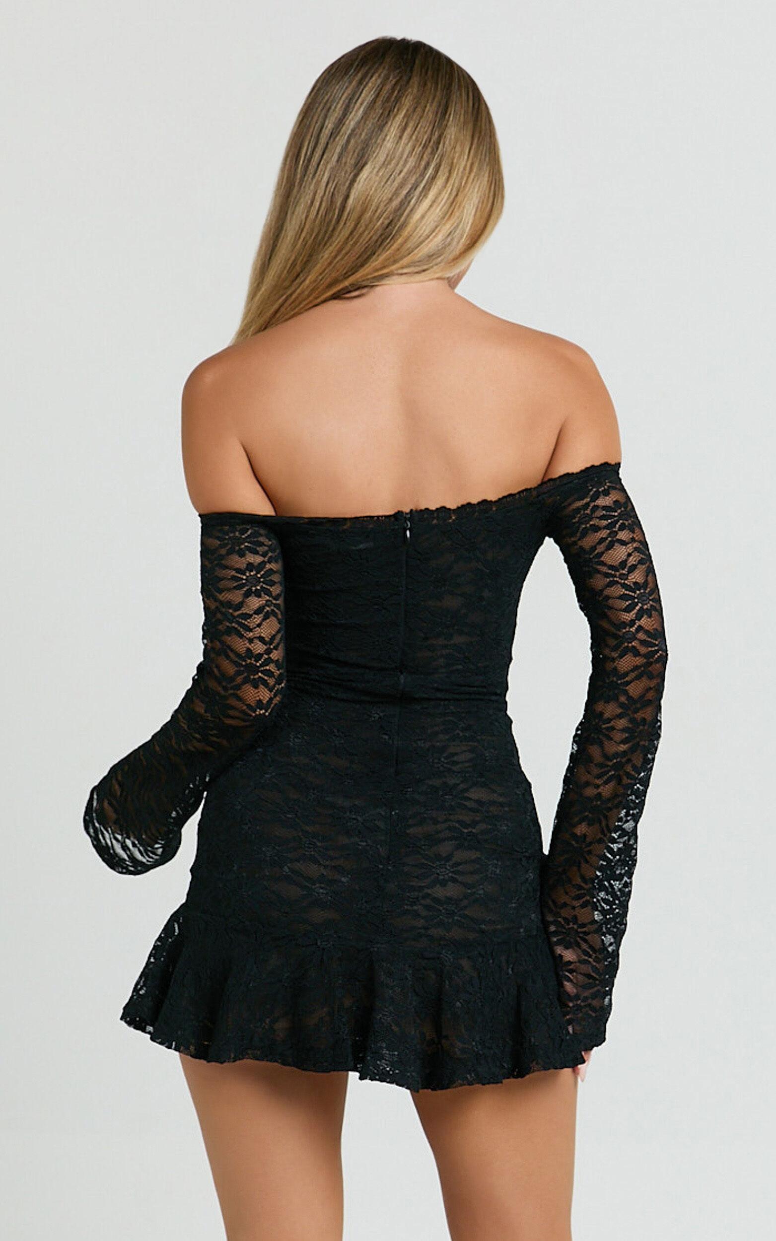 Turn heads at your next party night in our Frieda Mini Dress! This off shoulder bodycon mini channels major flirty vibes with its statement flared long sleeves and luxe stretch lace fabric. The sweetheart neckline gives a romantic touch, while the figure-hugging black lace shows off your shape in style. Whether it’s date night or girls’ night out, this dress is made to make memories (and Insta stories!). Pair with heels and statement earrings for an effortlessly glam party look. A must-have for every party-loving babe’s wardrobe!Product Details:Bodycon mini dressLace outer, nylon liningSweetheart necklineLong sleevesPull-on stylePerfect for partiesSize and FitSize S / 8 length: 66.5cm / 26.18inMaterial and Care93% Nylon, 7% SpandexMedium Stretch