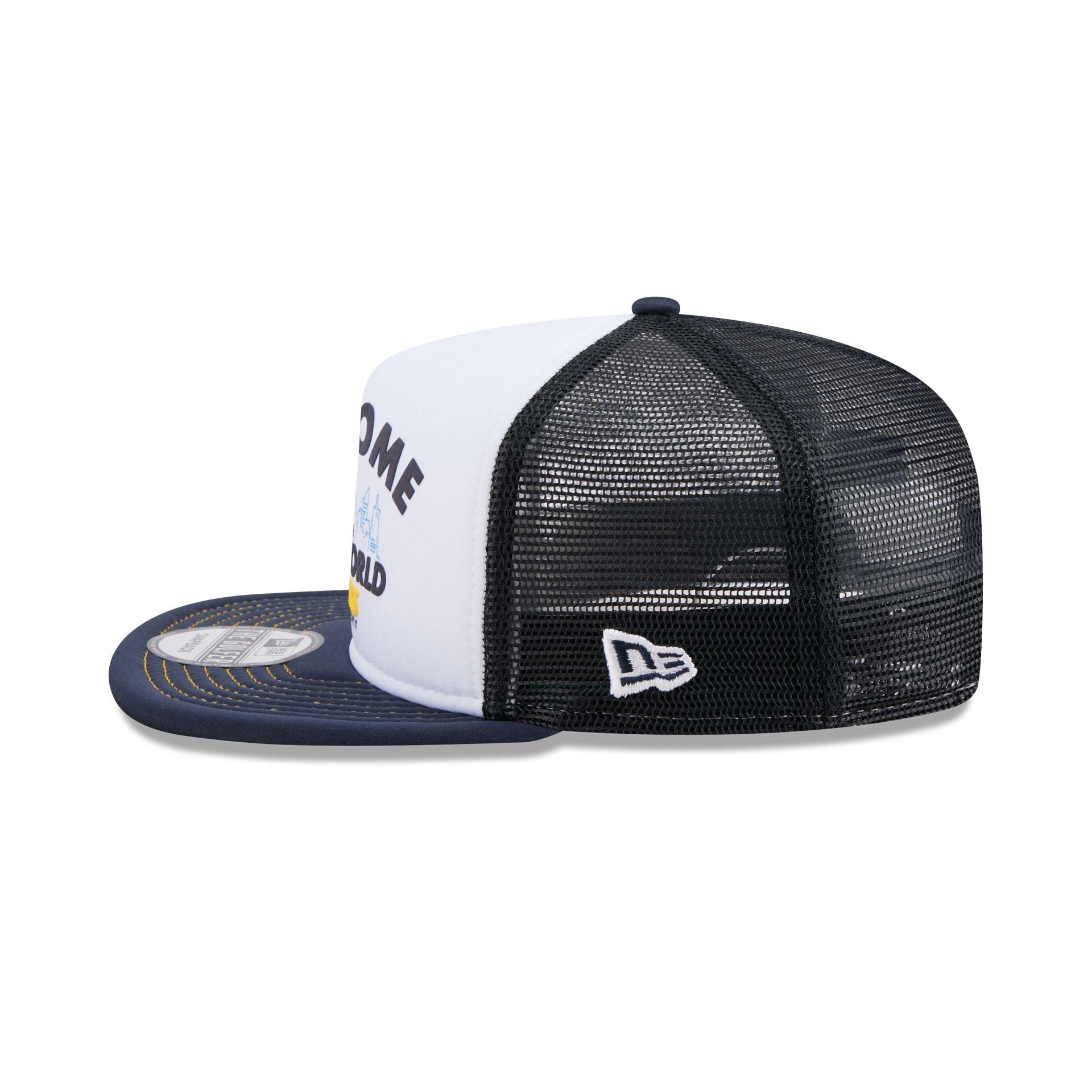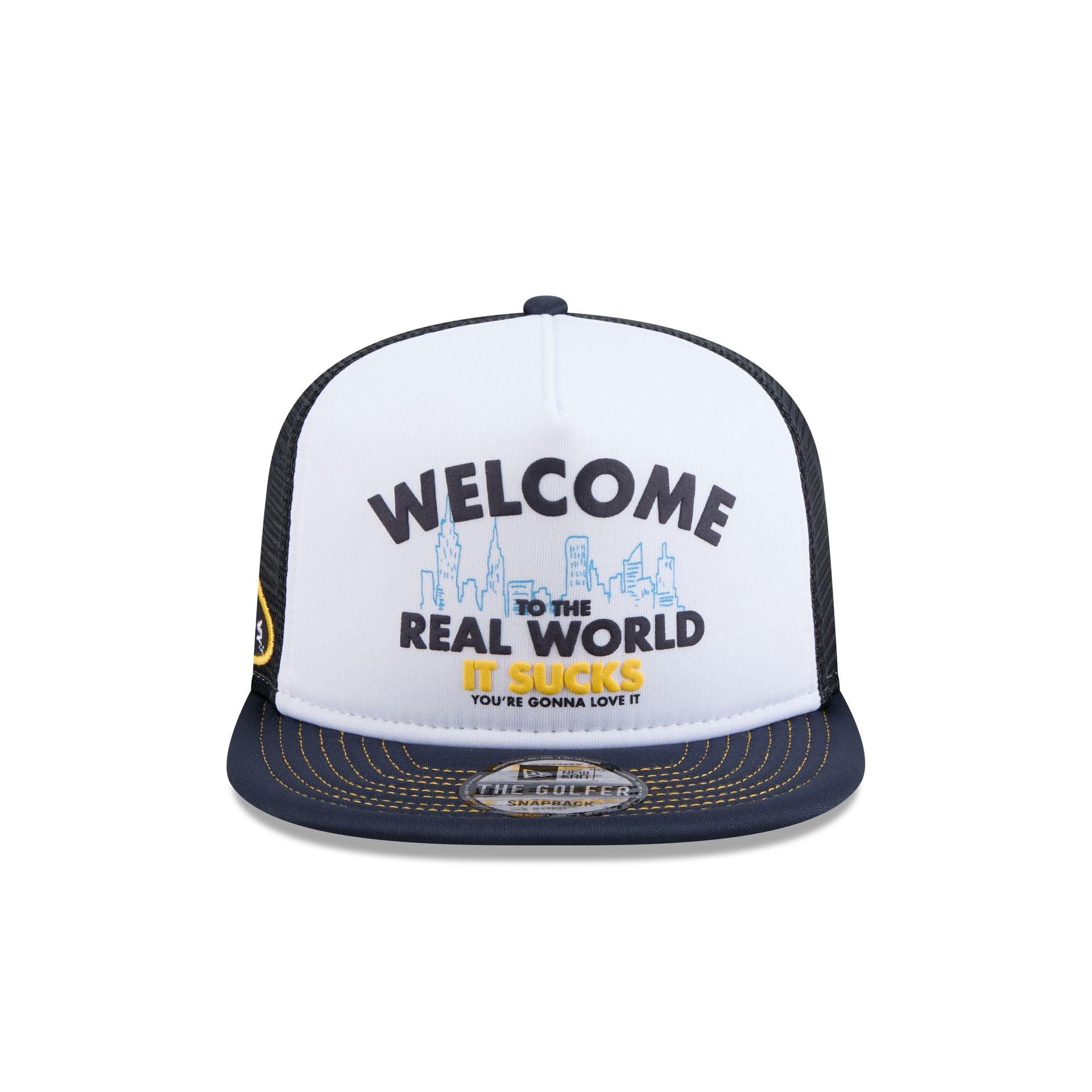 The Friends Real World Golfer features a screen-printed puff paint Friends "Welcome to the Real World" graphic at the front panels with a Friends logo patch at the right-wear side. Additional details include yellow stitching at the visor, a snapback closure at a mesh rear, and a green undervisor.