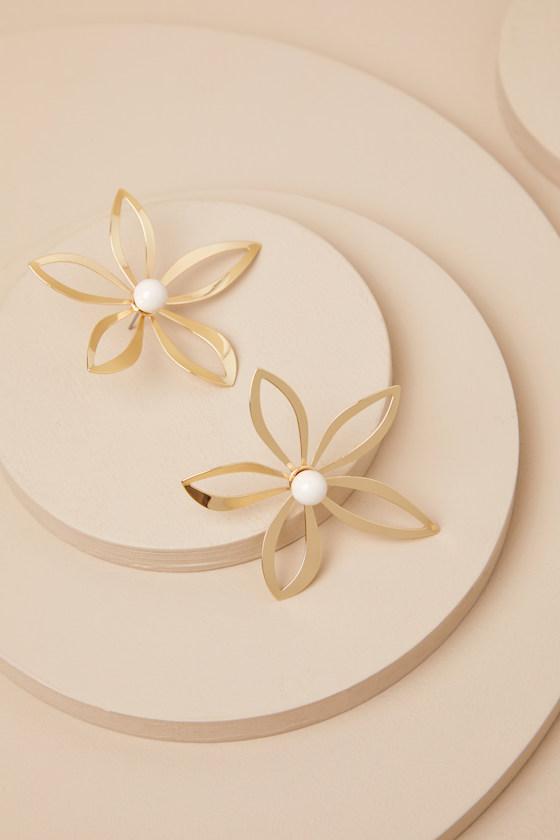 Effortlessly express your fabulous side with these gold-toned earrings, featuring a statement-making presence thanks to an oversized, flower-shaped silhouette with a white beaded detail at the center. Pair with an updo so these accessories can be easily admired.