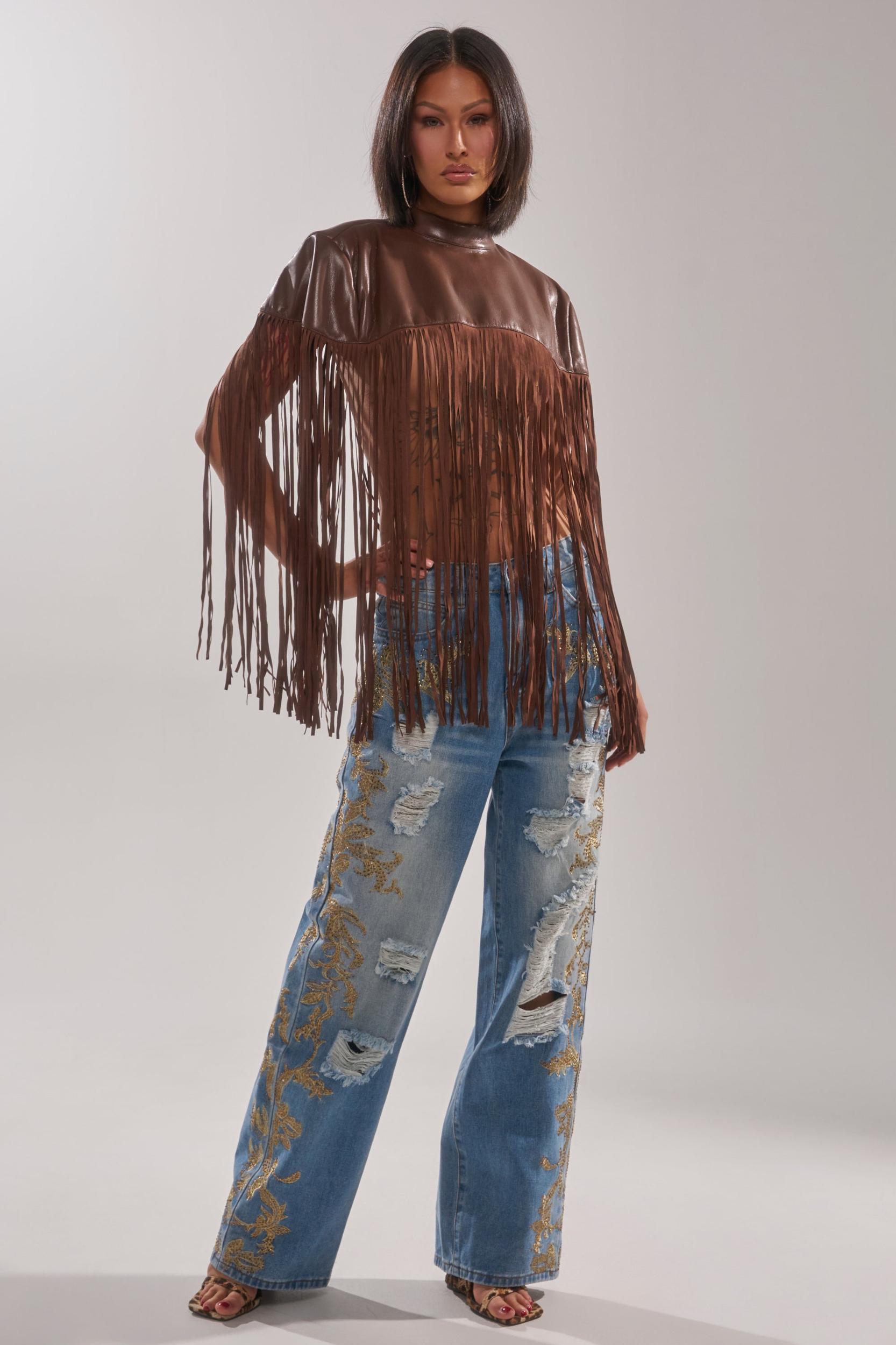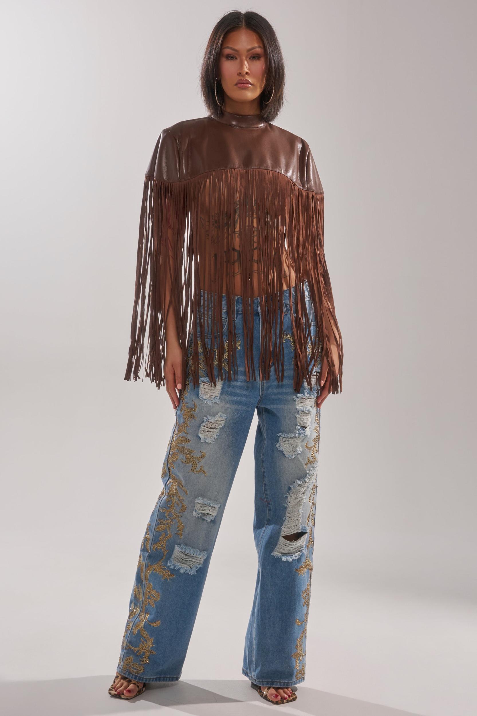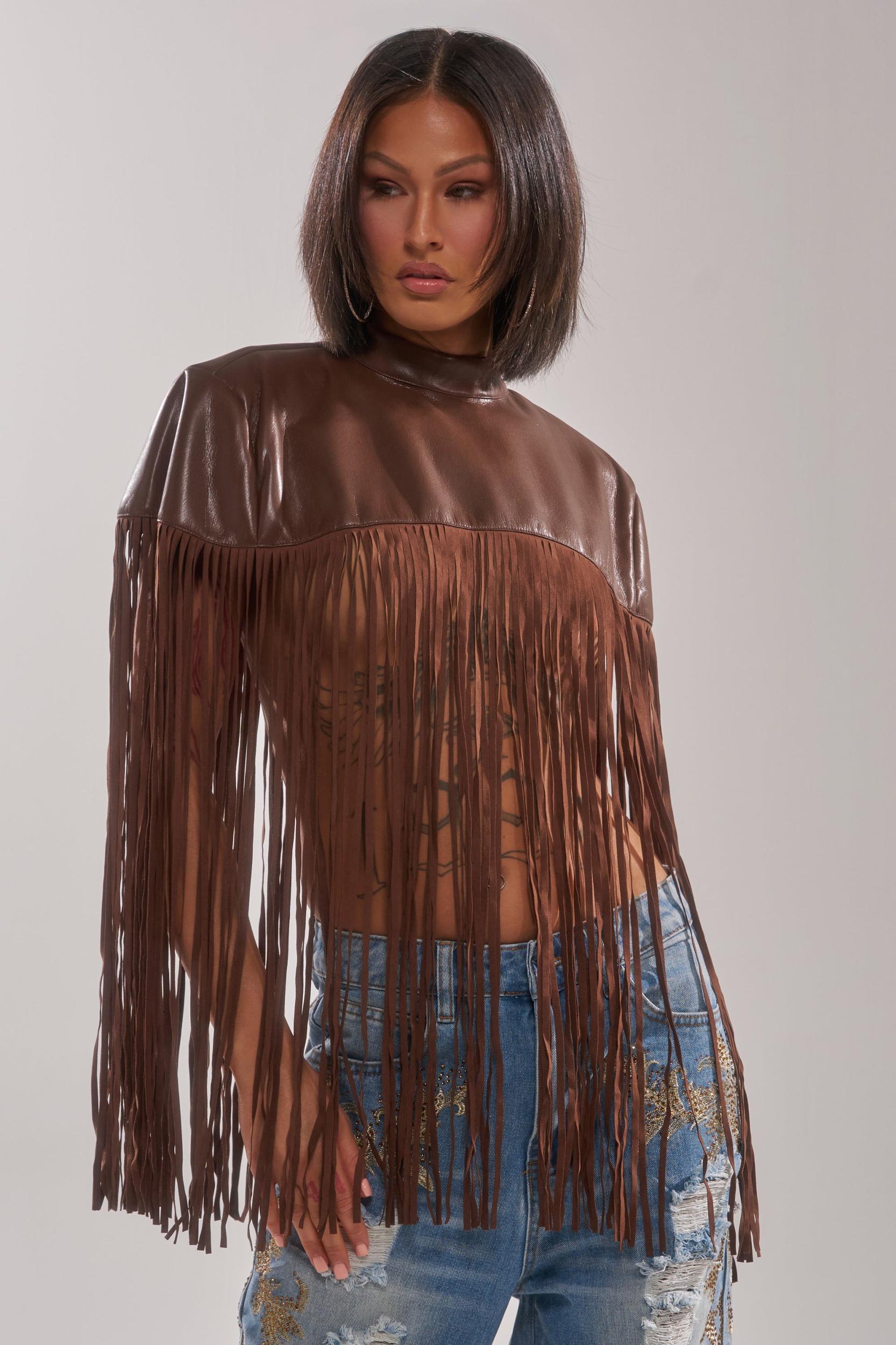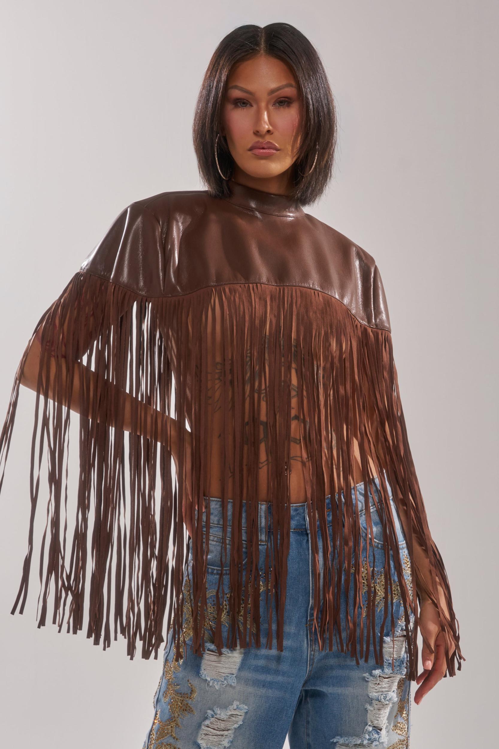 Girls just want to have fringe! The AKIRA Label Fringe For Days Faux Leather Top features a sleek high neckline, smooth structured brown faux leather, and dramatic long fringe panels that cascade from the bustline to below the hips for bold movement and texture. Designed with a top button enclosure and open slit back, this cape top blends Western-inspired flair with modern edge, creating a standout layering piece perfect for festival looks or nights out. Pair with a camisole underneath and a sleek flare jean for a fun, fringe look. - 55% Polyester 45% PU- Spot Clean Only - Stretchy- Imported (all measurements are approximate from size S/M)- 29” Shoulder to Hem (including fringe)- 16” Shoulder to Shoulder- Model is 5’7” and wearing size smallProduct ID: 1074398 (all measurements are approximate from size 1X/2X)- 31” Shoulder to Hem (including fringe)- 18” Shoulder to ShoulderProduct ID: 1074400