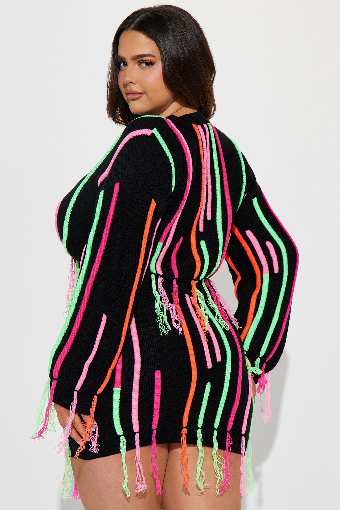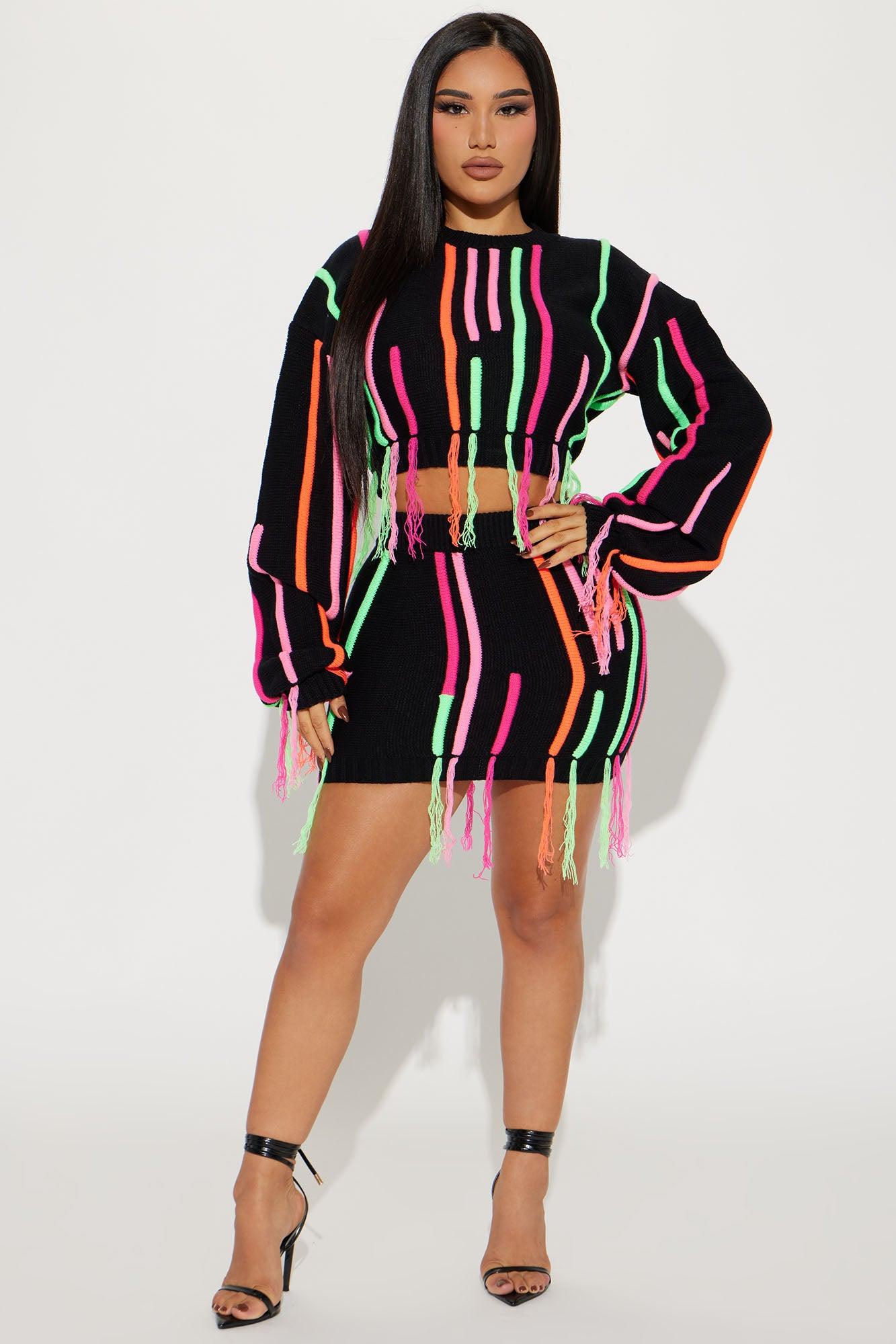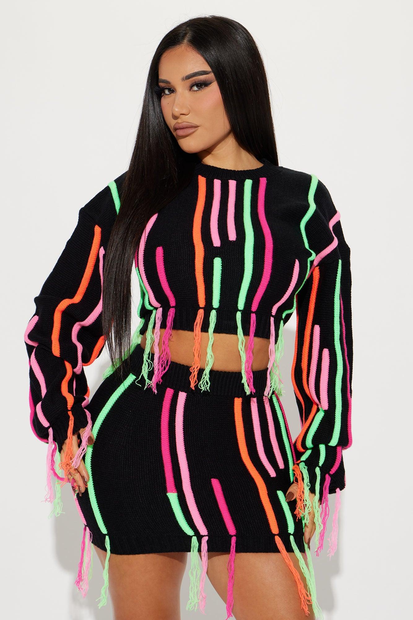 Available In Black. Sweater Skirt Set Sweater Cropped Fringe Detail Mini Skirt Elastic Waistband Stretch 14.5" Skirt Length Disclaimer Pattern Placement May Vary 100% Acrylic Imported California Proposition 65WARNING: Cancer and Reproductive Harm - www.P65Warnings.ca.gov.