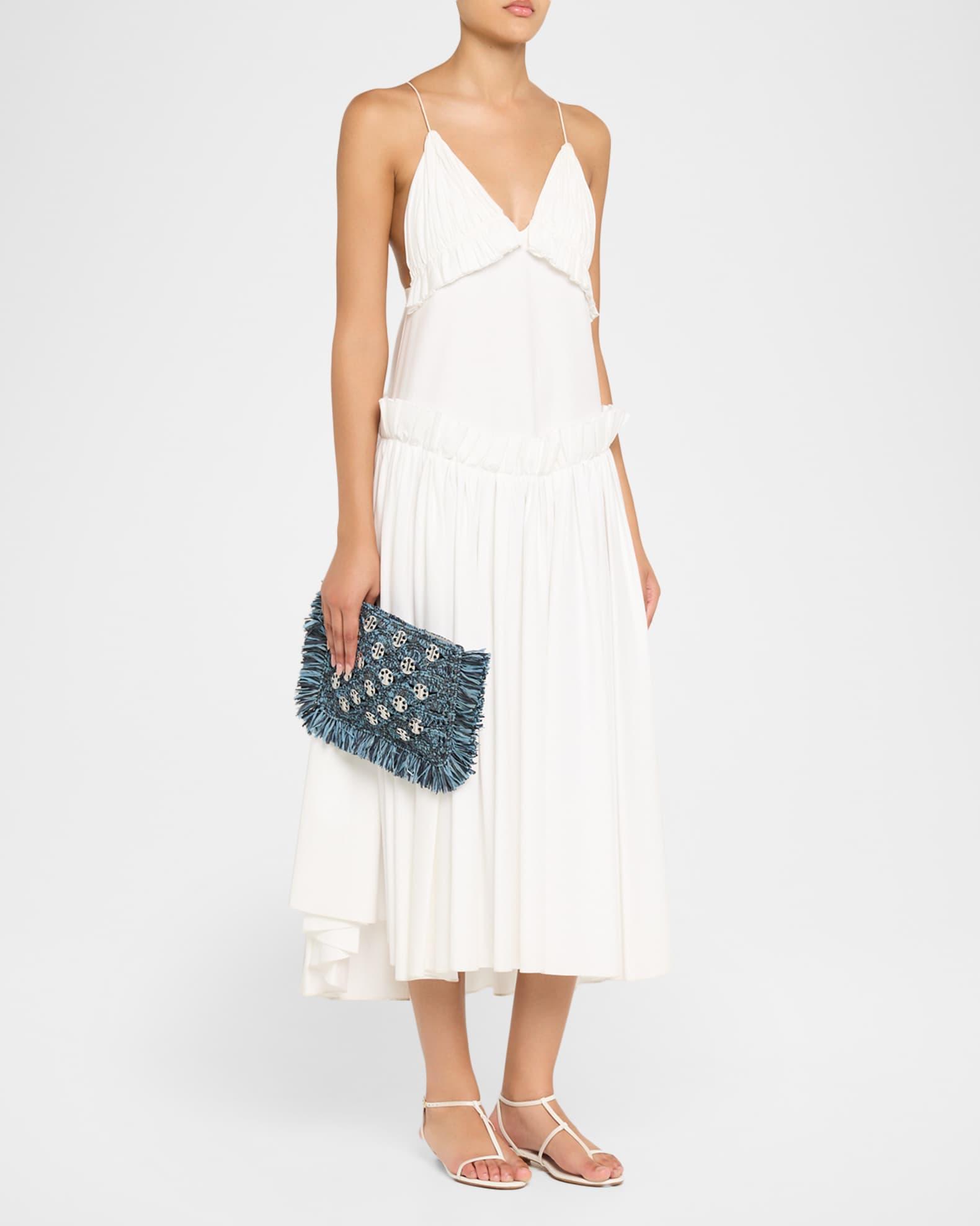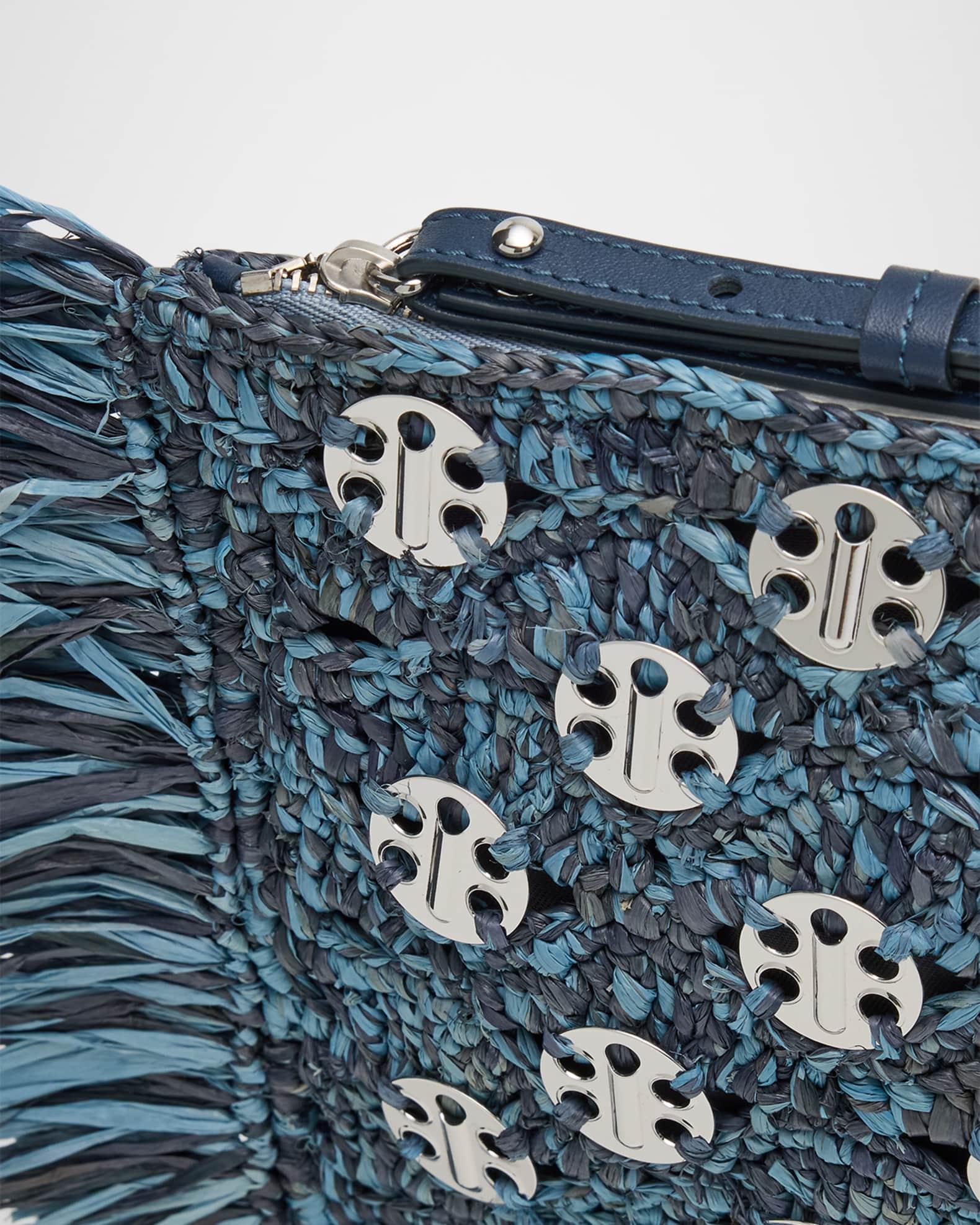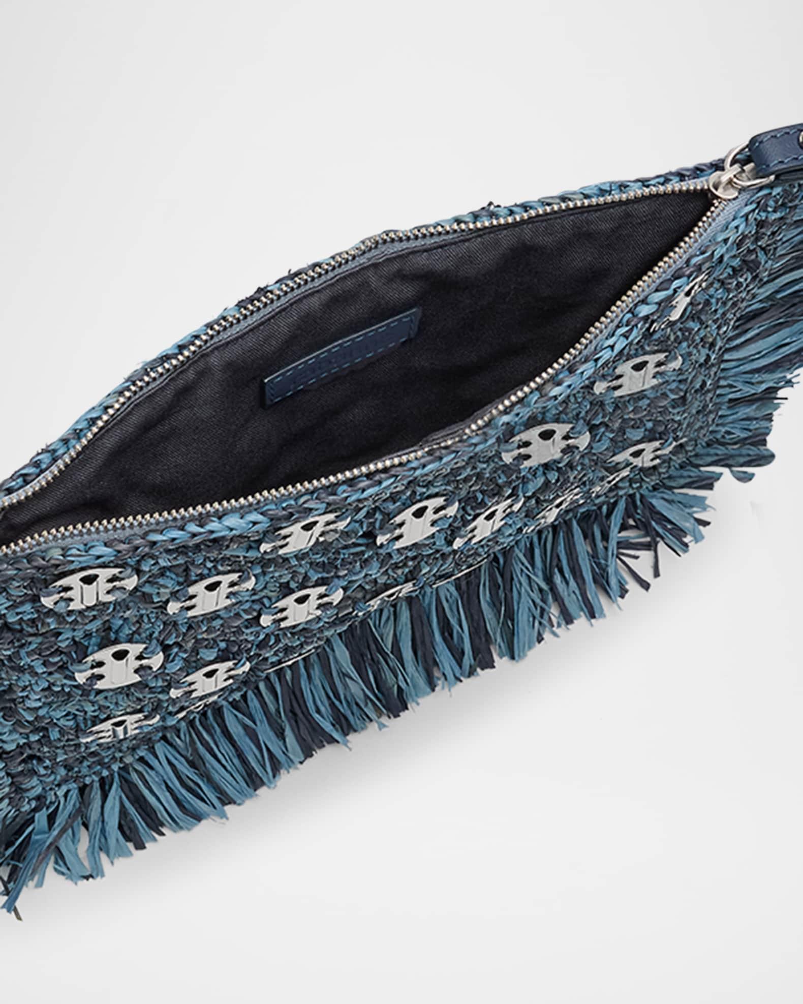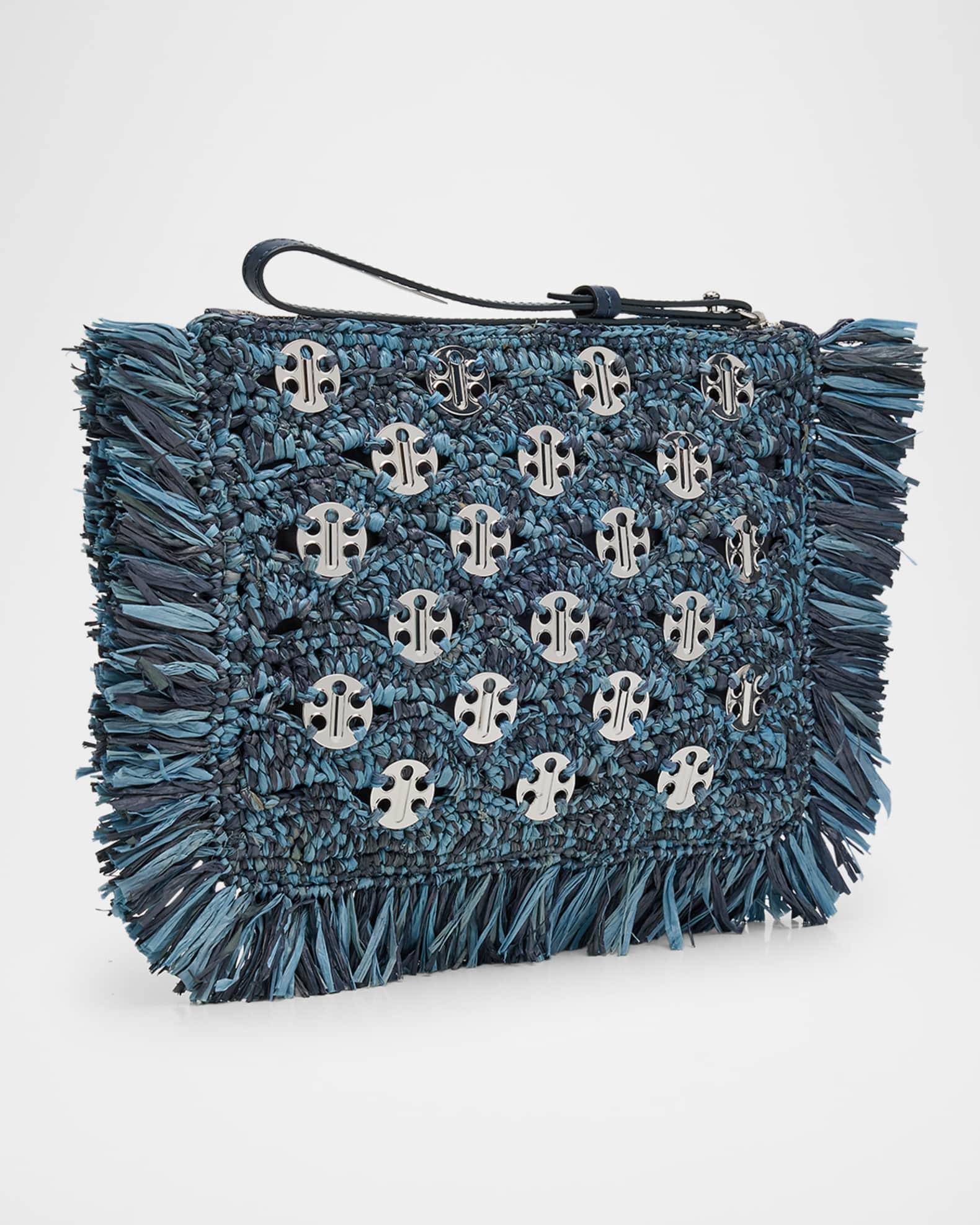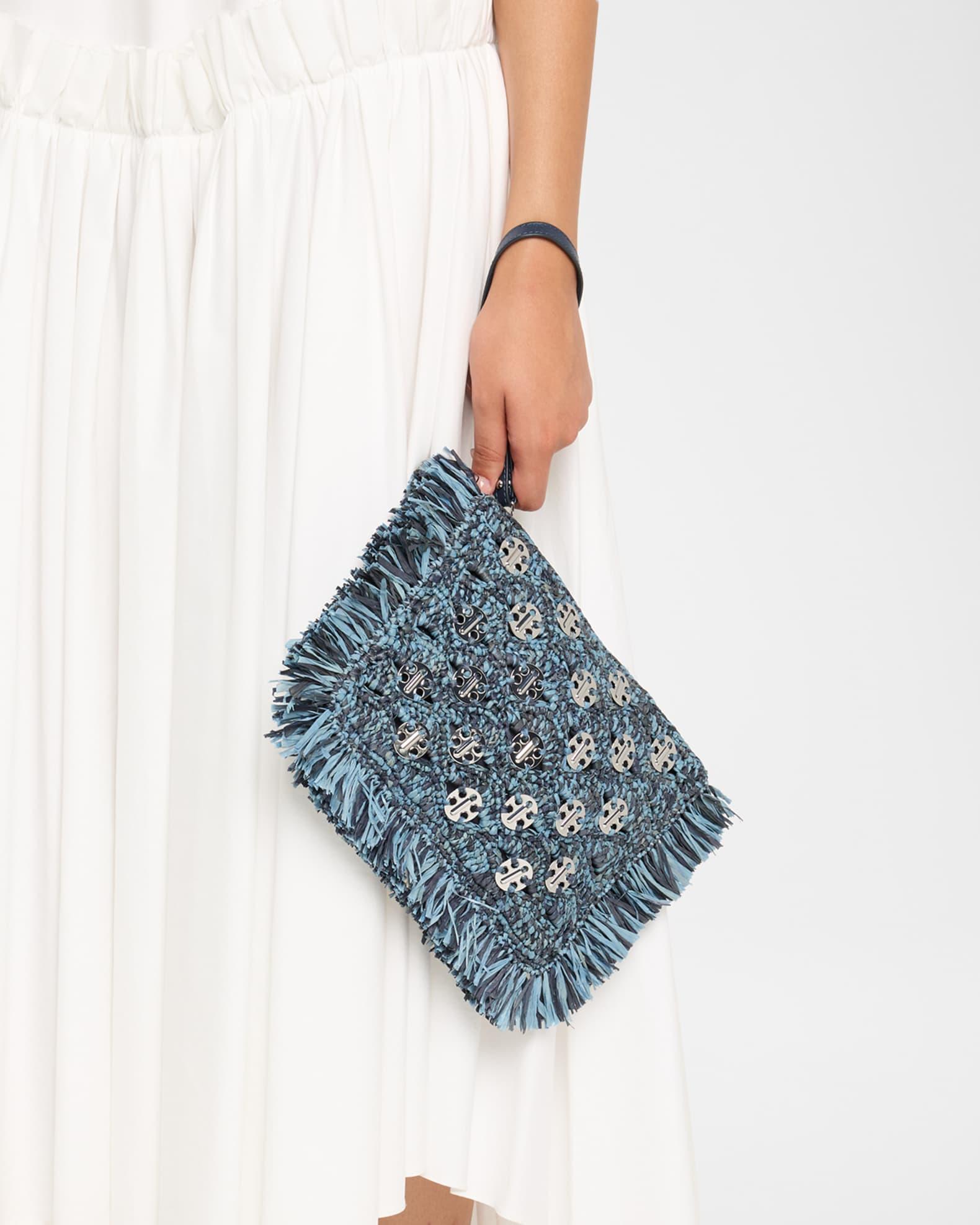 Rabanne pouch bag in denim-effect raffia, detailed with fringe, metallic discs, and leather finishes Zip top with wristlet strap pull Approx. 6.7"H x 9.4"D Imported