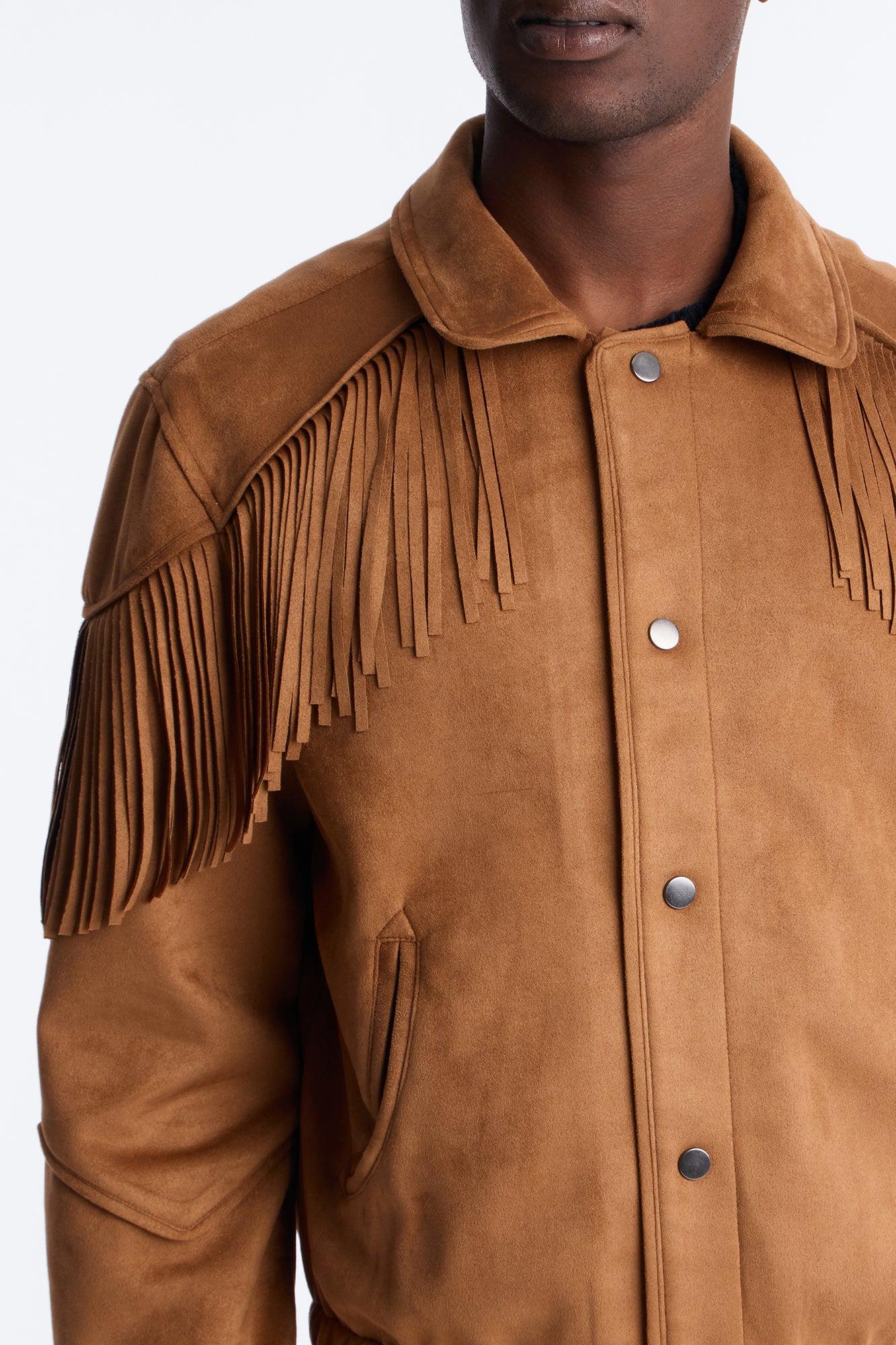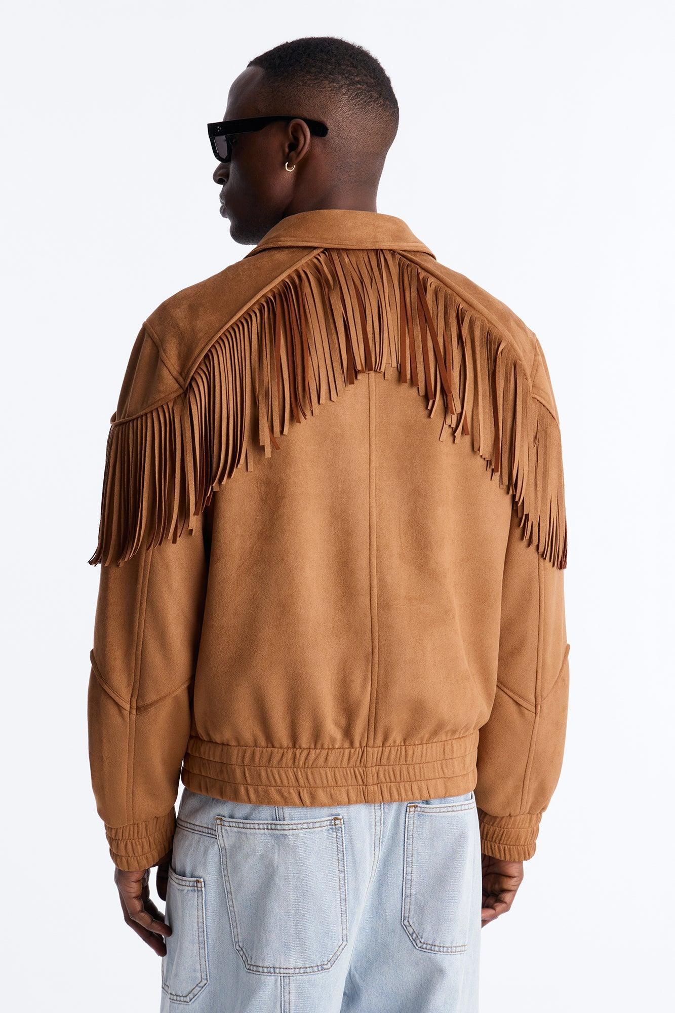 Available In Camel. Bomber Jacket Folded Down Collar Front Full Snap Button Closure Lightweight Faux Suede Textured All Around Fringe Details Side Hand Pocket With Western Details Elastic Hem And Cuffs Long Sleeves Self: 92% Polyester 8% Spandex Imported California Proposition 65WARNING: Cancer and Reproductive Harm - www.P65Warnings.ca.gov.