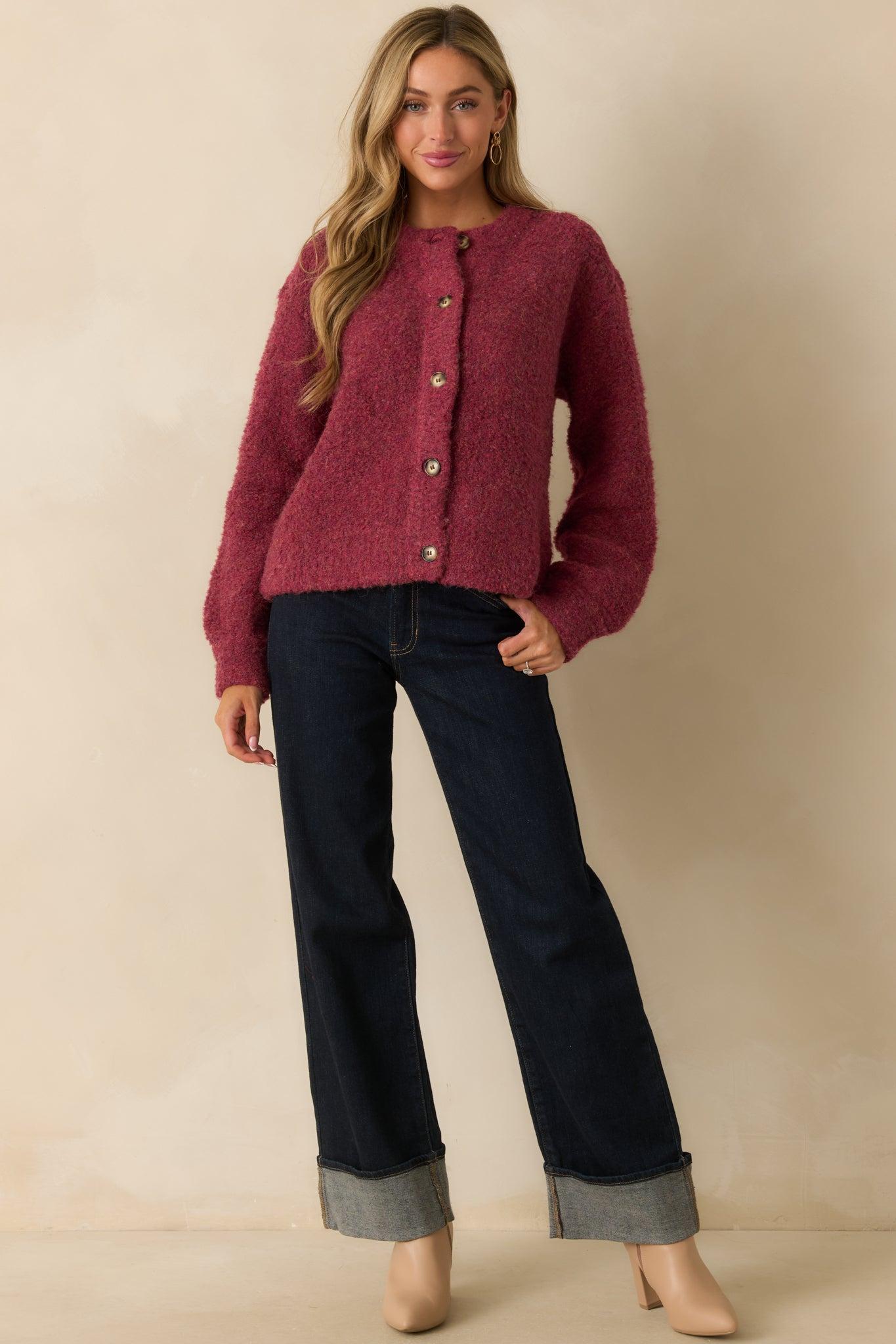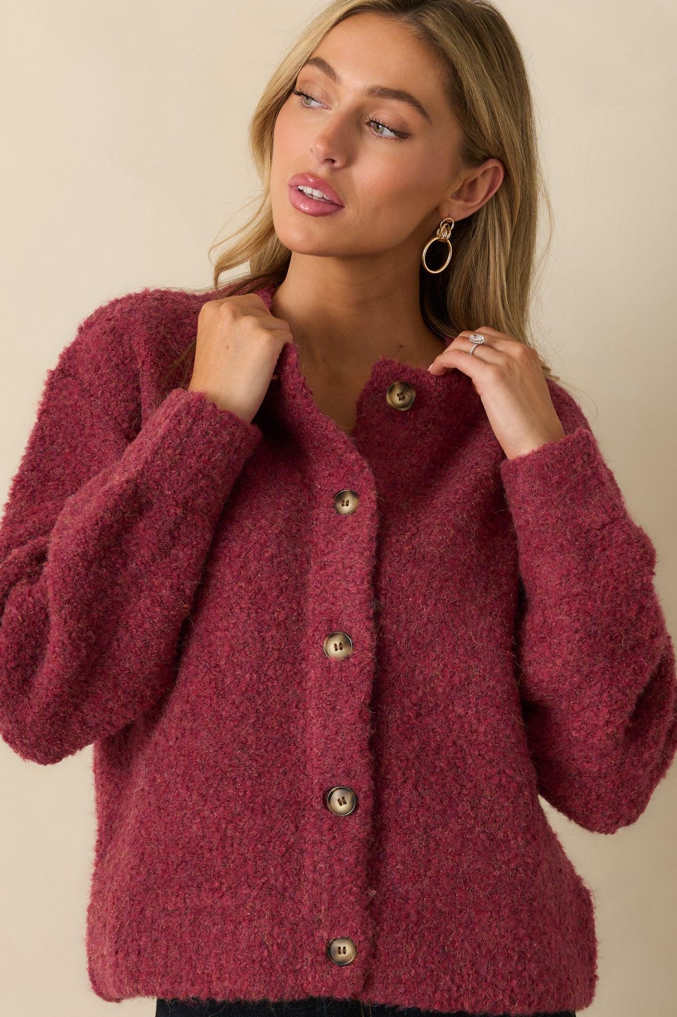 The FRNCH Cranberry Knit Button-Up Selkirk Cardigan brings a touch of understated charm to your cool-weather lineup. With its textured knit and rich cranberry hue, it’s that effortlessly cozy piece that adds warmth and quiet confidence to every outfit. This cranberry cardigan features a soft boucle knit texture with a crew neckline, long sleeves, and a relaxed silhouette, finished with a full front button closure for a cozy yet refined look. 33% Recycled Polyester, 28% Acrylic, 23% Polyester, 12% Wool, & 4% Elastane Unlined Hand Wash Only Manufactured in China Designed in the USA Model is 5'8" and wearing size small