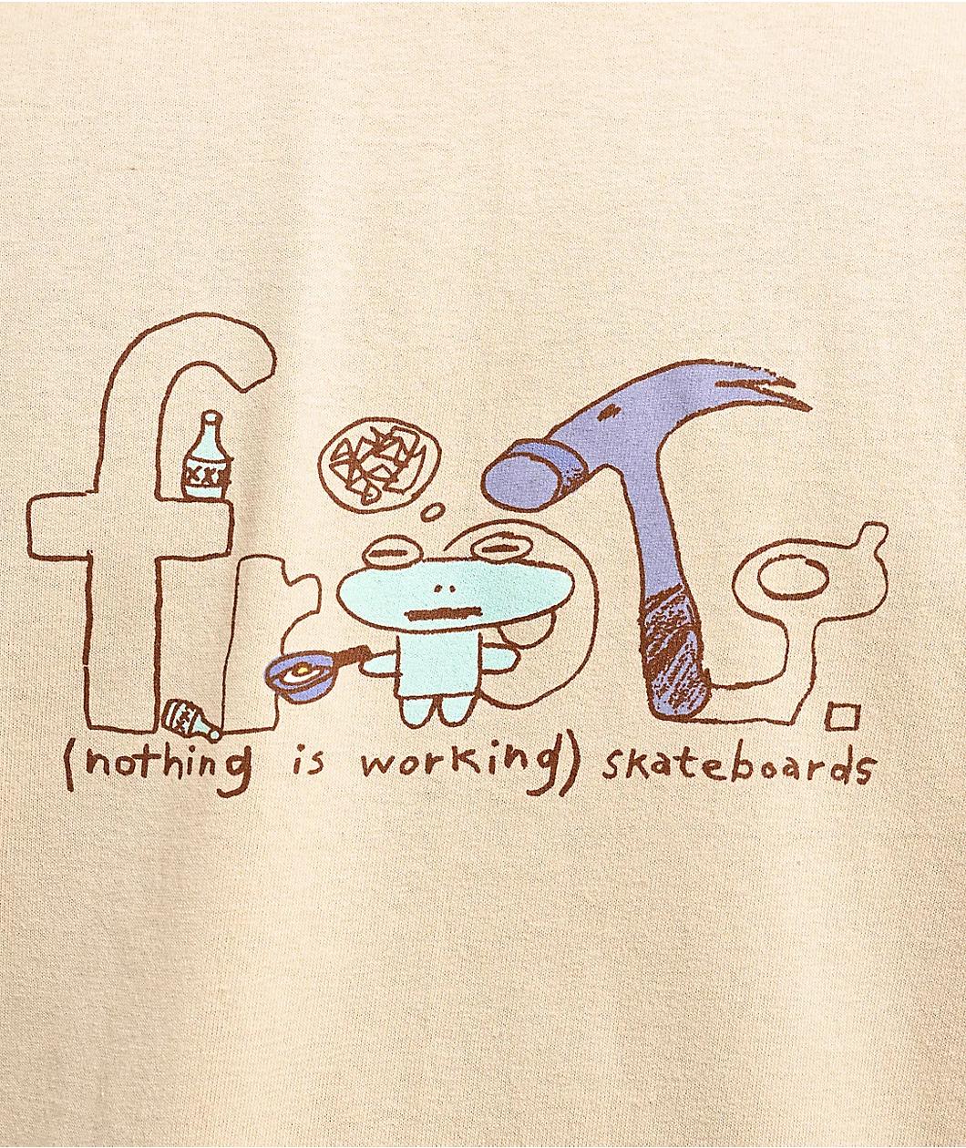 Presented by Frog Skateboards in a natural hue, the Nothing Is Working t-shirt displays doodle artwork screen-printed on the front. Featuring an image of lowercase stencil lettering with a Frog cooking an egg next to bottles and a hammer for a hardwo