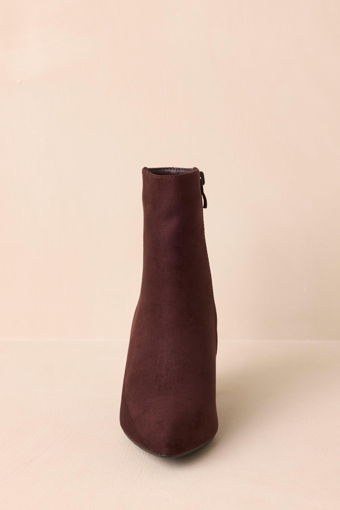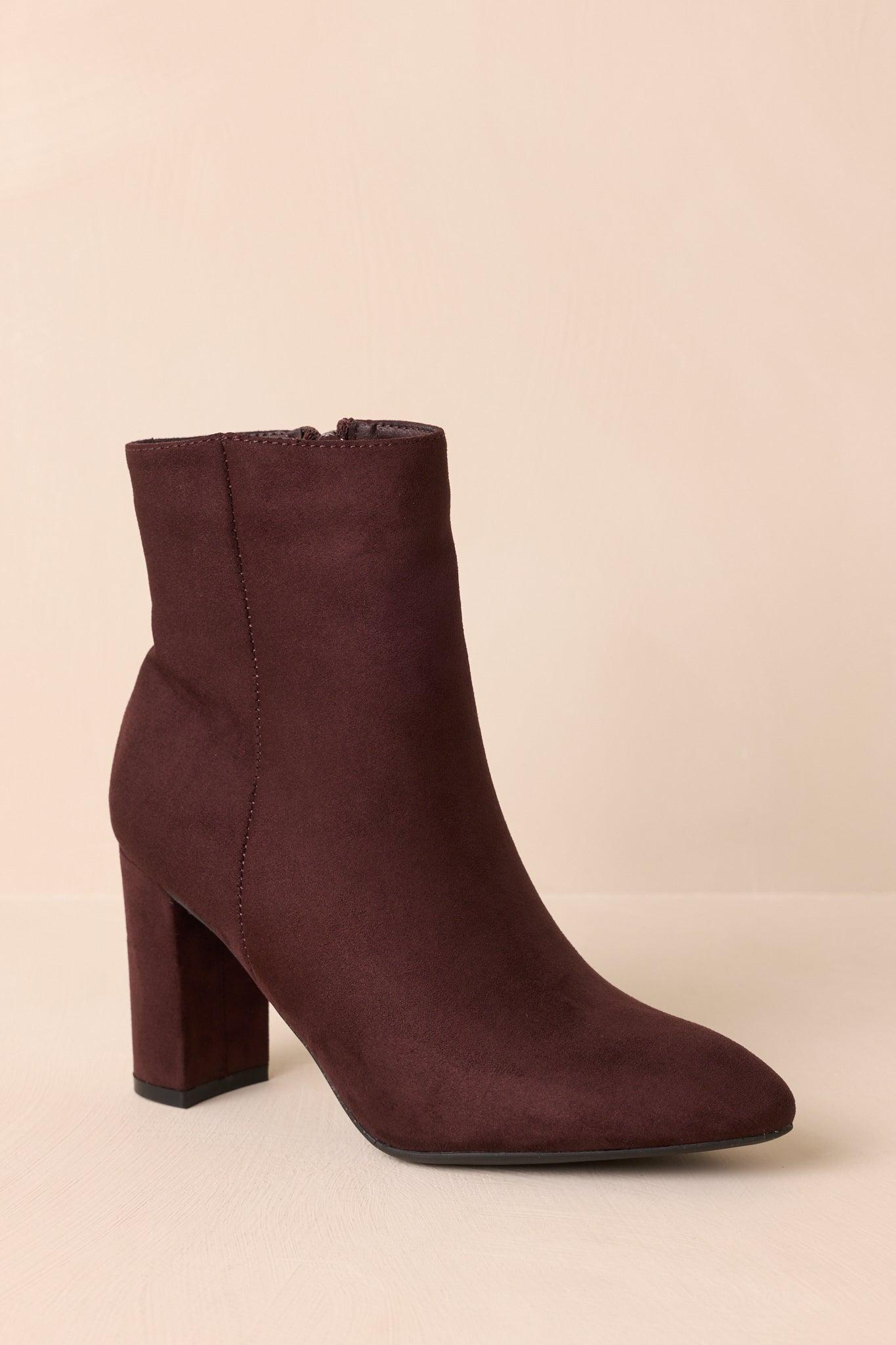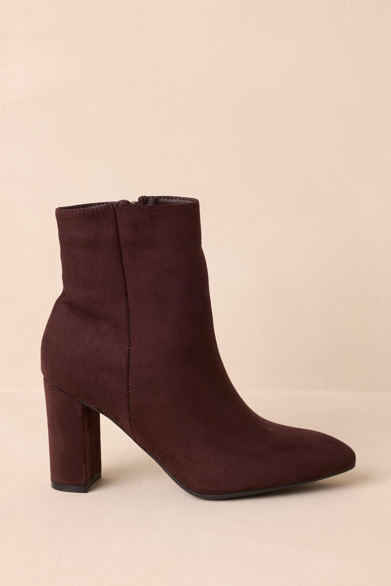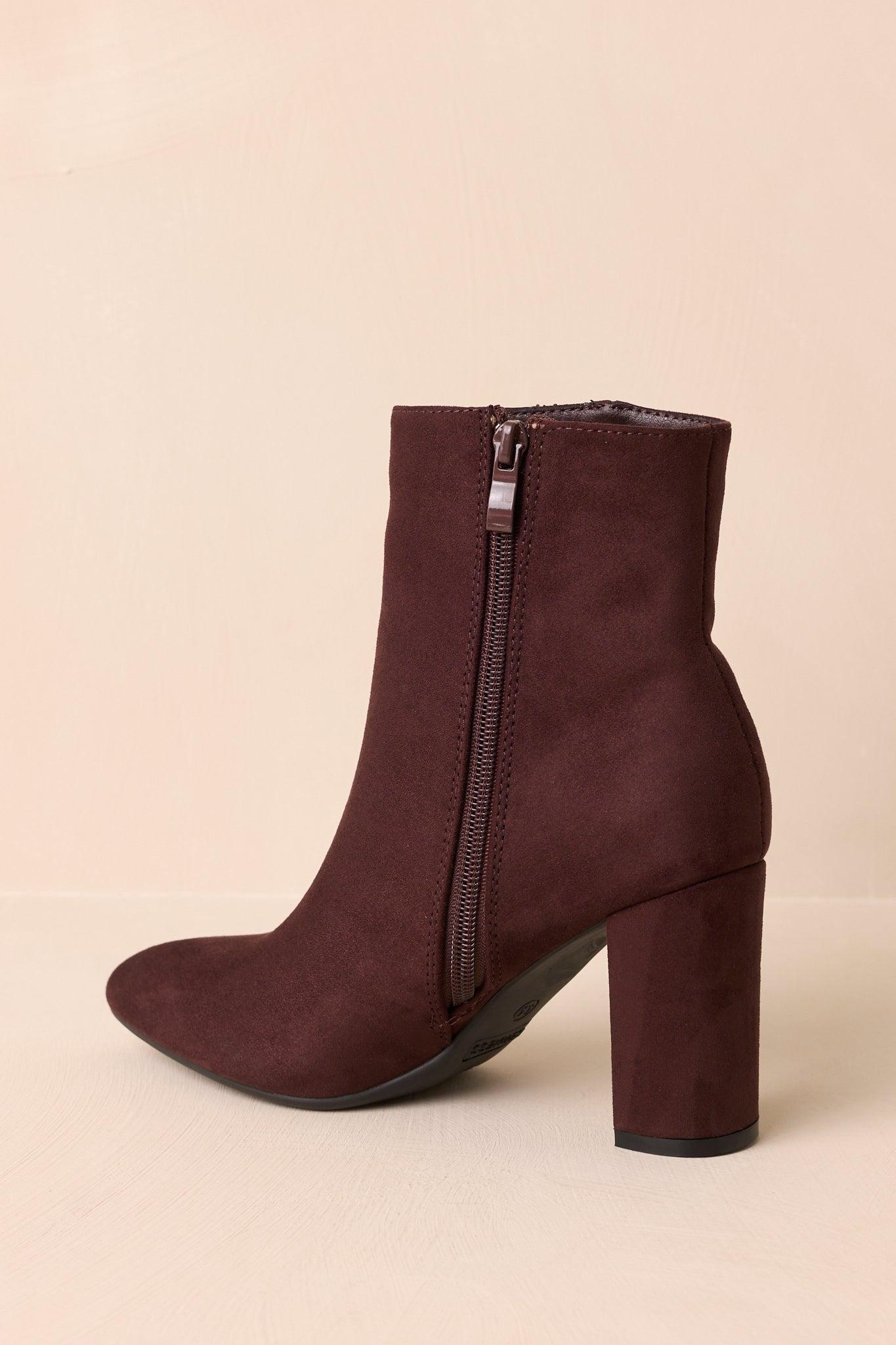 The From Here On Dark Brown Faux Suede Block Heel Ankle Boots give your look a sleek, grounded edge, making them the kind of go-to pair that steps up your style and stands strong no matter where you’re headed. These dark brown ankle boots feature a faux suede material, a pointed toe, outer seam detail, inner functional zipper closure, and a block heel. Heel measures 3.5" Man made materials Non-skid sole Manufactured in China Designed in The USA True to Size, Wide Foot Friendly