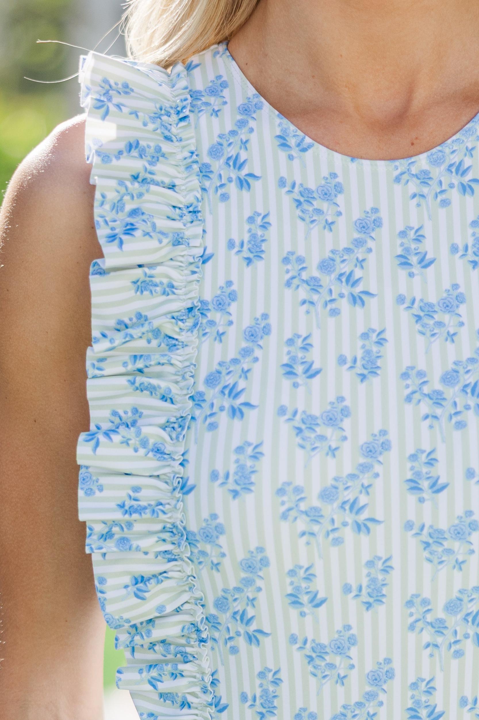 This one-piece is giving all the dainty coastal vibes! The sweet blue floral print and vertical stripes are super flattering, and those ruffled sides? Absolutely dreamy. Whether you’re lounging by the water or diving in, you’ll feel cute and confident all day long! Round neckline Button keyhole back Removable padding Ruffled detailing Floral print Full coverage bottoms Material has a generous amount of stretch Baileigh is wearing the small.