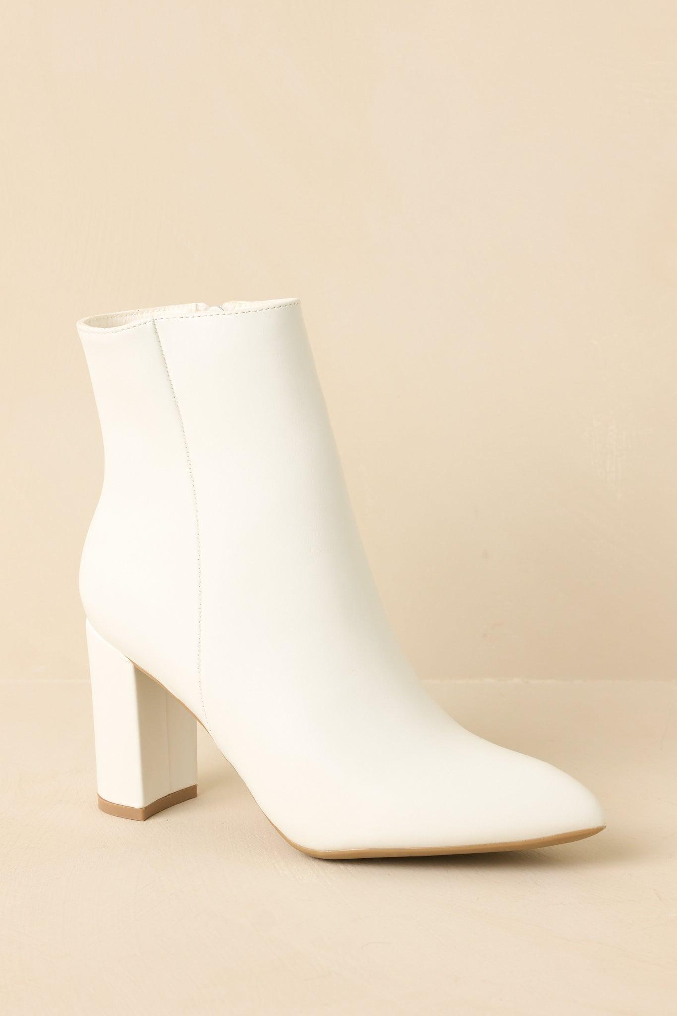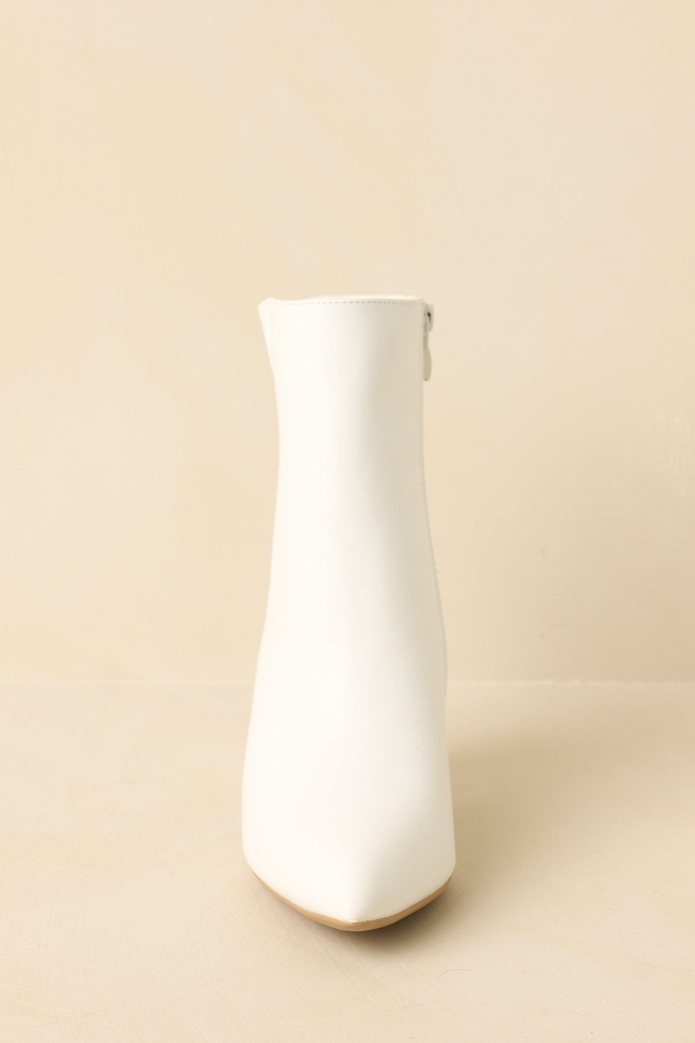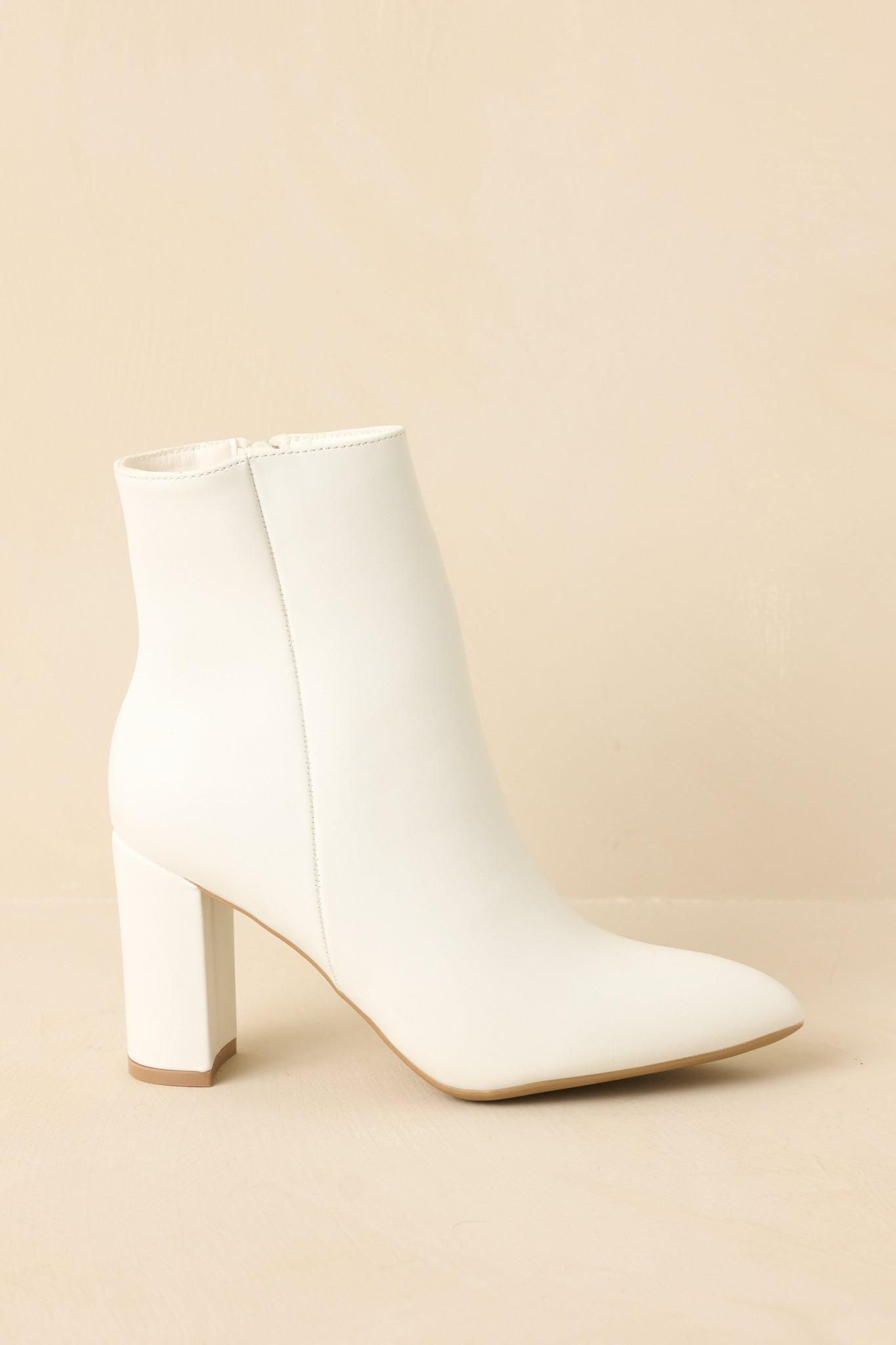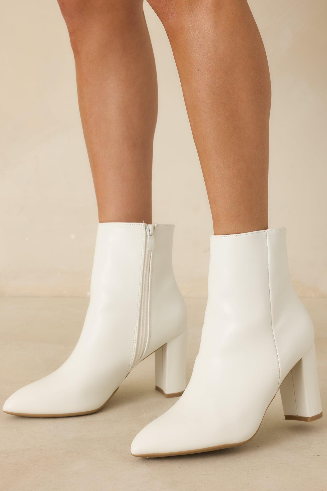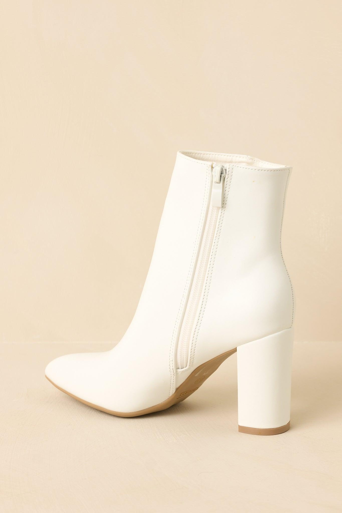 The From Here On White Faux Leather Block Heel Ankle Boots give your look a sleek, grounded edge, making them the kind of go-to pair that steps up your style and stands strong no matter where you’re headed. These white ankle boots feature a pointed toe, outer seam detail, inner functional zipper closure, and a block heel.