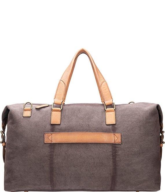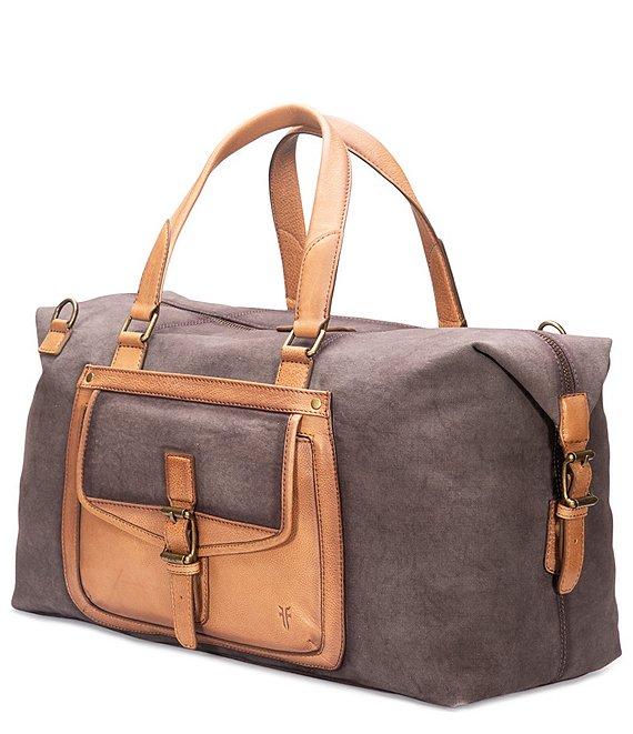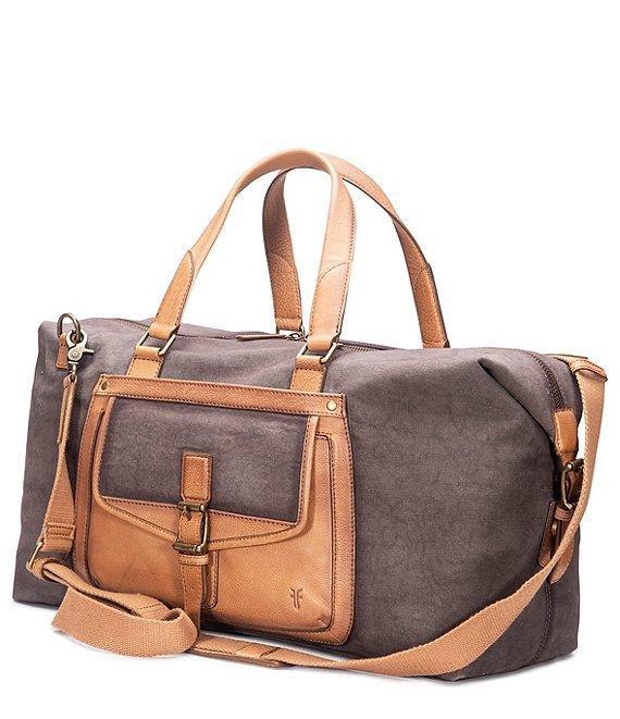 From Frye, this weekender bag features: Denver canvas Leather accents Adjustable straps Slip pocket zip Pocket trolly Sleeve laptop Sleeve organizational pocket Dimensions approx. 12" x 19.25" x 8.5" Approx. 3.75" handle Wipe clean Imported.