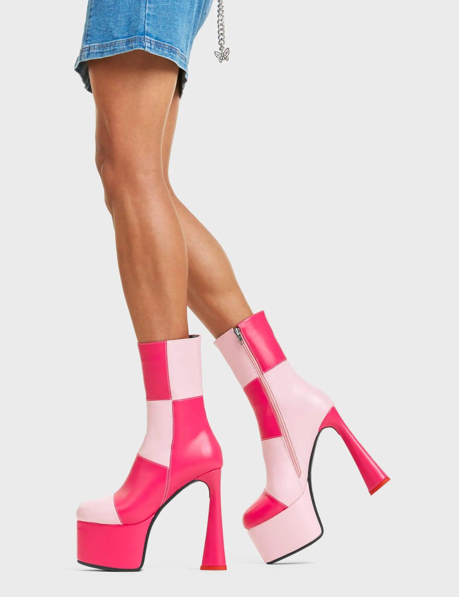NEVER FOLD Fuchsia City Platform Ankle Boots in Pink and Fuchsia faux leather. These platform boots featurex our patch work look design with a Heart shaped heel that included a red heart at the bottom, keeping it nice and classy. Made with eco-friendly materials and 100% cruelty-free, these platform boots are as ethical as they are chic.- Platform Height: 6 CM- Heel Height: 14 CM- Ankle length- Lace up- Heart heel- High Heel- 100% veganSKU: LMF 4470 - PinkPU/FuchsiaPU