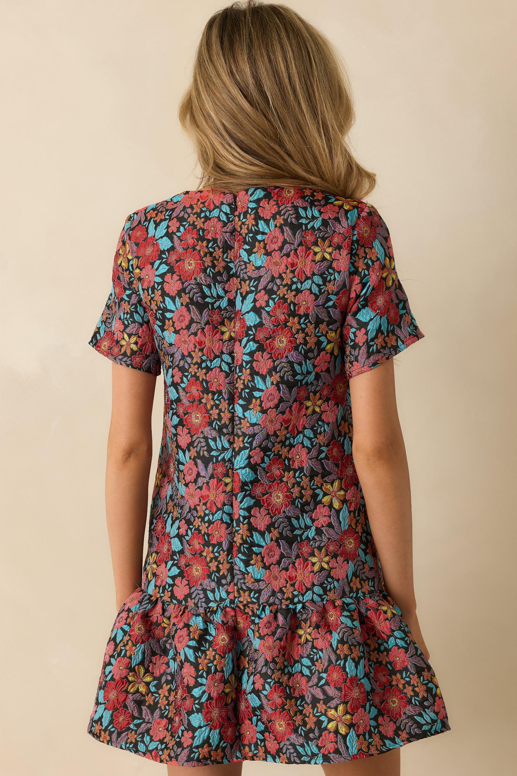 The Full Bloom Ahead Black Multi Floral Jacquard Mini Dress is ready to turn every day into a celebration of color. With its vibrant jacquard florals and playful silhouette, it strikes that perfect balance of bold and feminine. Just add heels or boots and let your style flourish. This black multi floral jacquard mini dress features a crew neckline, short sleeves, side pockets, and a drop waist with a ruffled hem, crafted from a structured woven fabric with dimensional floral detailing. 100% Polyester Lined: 95% Polyester & 5% Spandex Wash Cold Manufactured in China Designed in The USA Model is 5'8" and Wearing a Size Small, Clipped, Model is a True X-Small