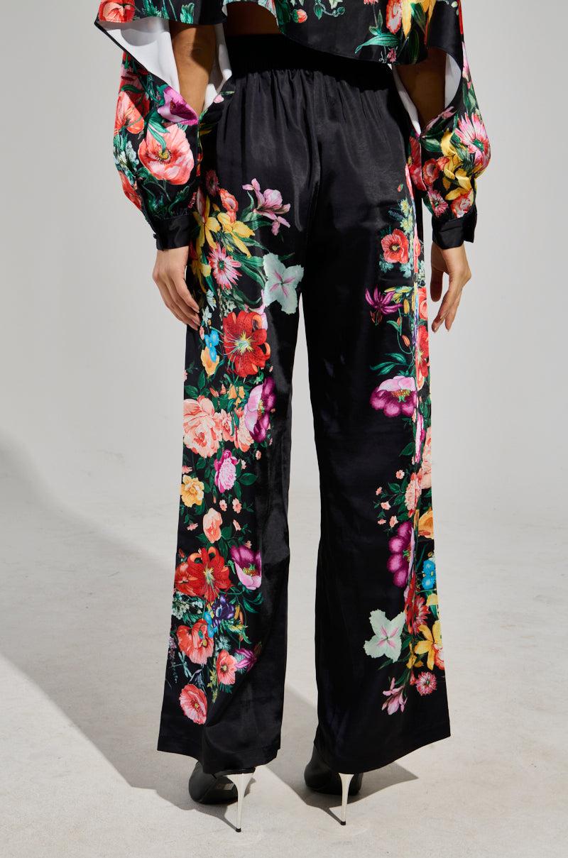 I can buy myself flowers… The AKIRA Label Full Bloom Straight Leg Trousers are crafted from a silky, lightweight satin fabrication and feature a high-rise, relaxed fit, an elasticized waistband with adjustable drawstrings, side seam pockets, and a gorgeous, colorful floral pattern throughout. Style with the coordinating Full Bloom Satin Mock Neck Blouse and a pair of pumps to achieve garden goddess status. - 97% Polyester, 3% Spandex- Some Stretch- Imported (all measurements approximate from size small) - 32” Inseam- 11.5” Rise- Model is 5’10.5” and wearing a size smallProduct ID: 440239