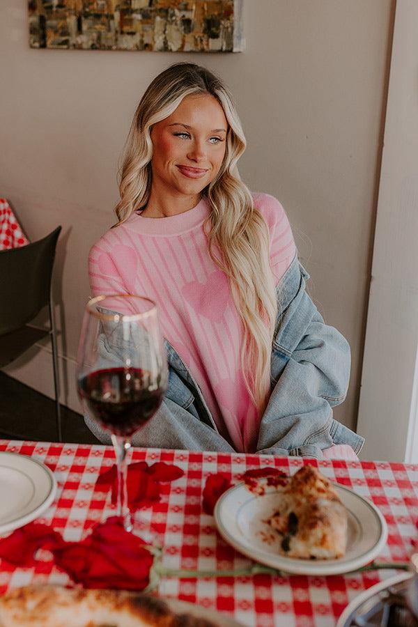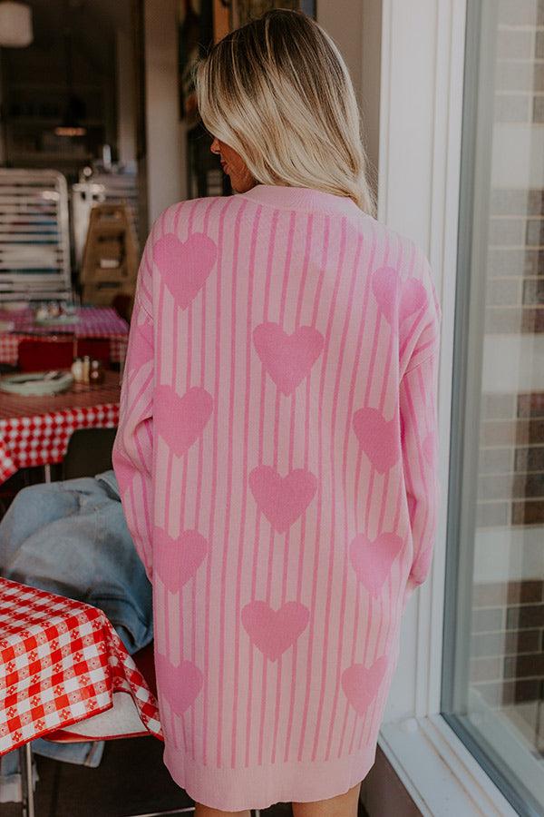- This charming sweater dress is an absolute heart-stealer! Featuring soft knit material with a stripe and heart pattern, it's ideal for anything from galentines day brunch to a coffee date with your sweetheart. - Unlined knit material - A heart and stripe design featuring different pink hues - A ribbed crew cut neckline - Long sleeves with ribbed cuffs - A relaxed silhouette that ends in a ribbed mini dress length hemline