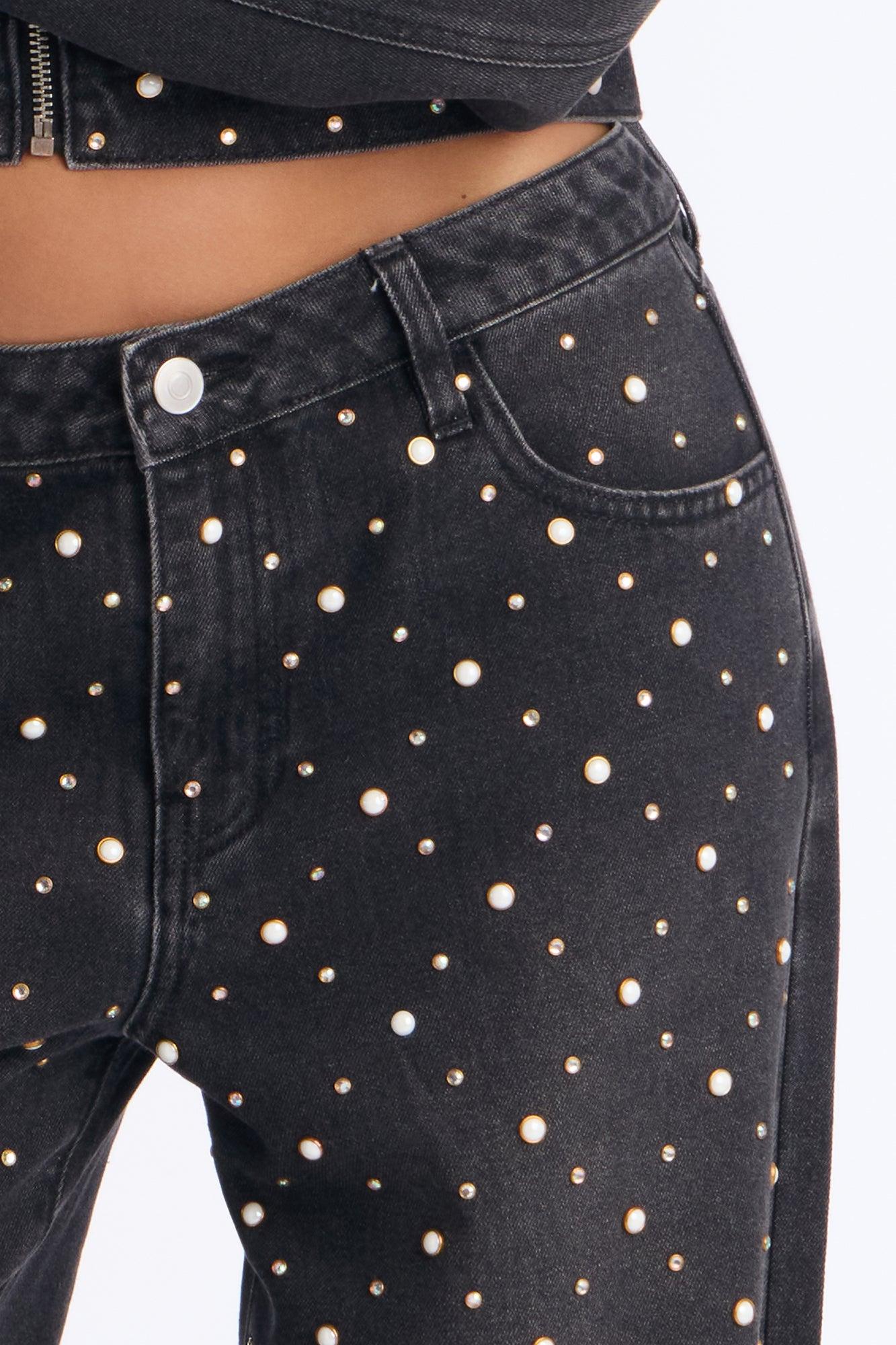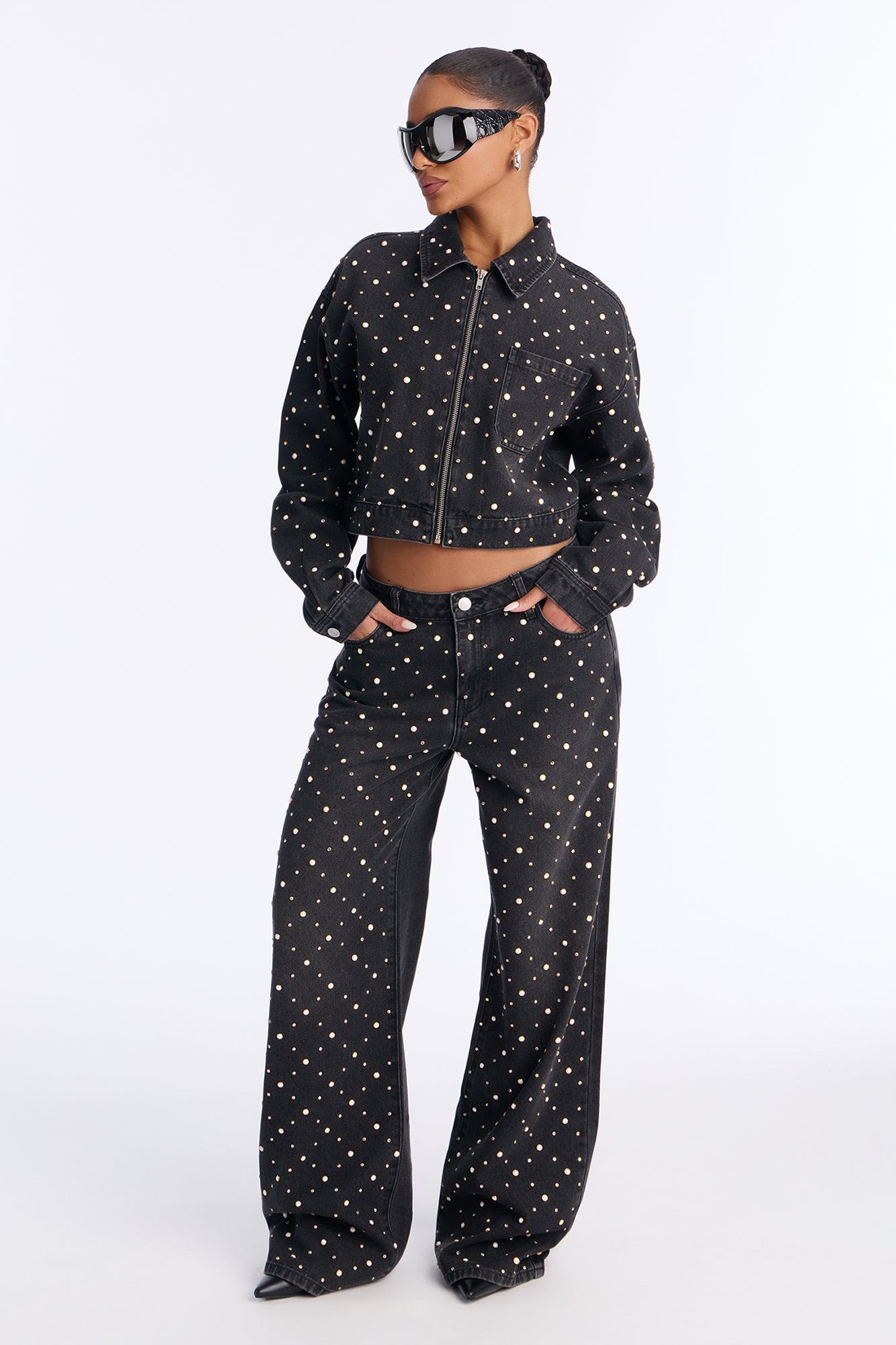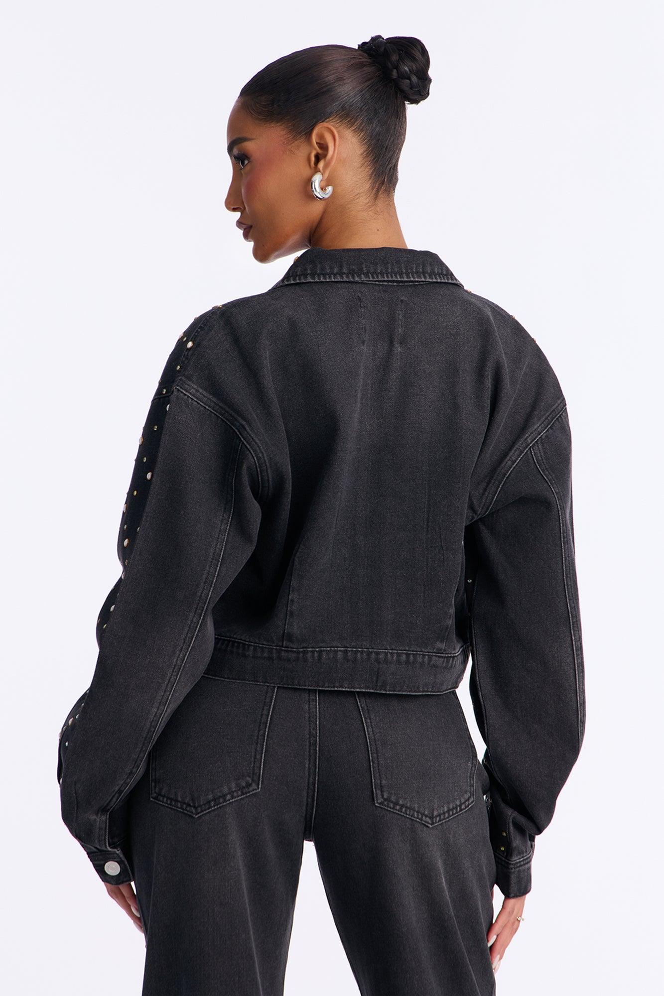 Available In Black Wash. Denim Jacket Pair With Full On Fabulous Embellished Wide Leg Jeans To Complete The Look! Collar Zipper Closure Front Chest Pocket Embellished Non Stretch Disclaimer: Due To The Specialized Wash, Each Garment Is Unique. 74% Cotton 20% Polyester 6% Viscose Imported California Proposition 65WARNING: Cancer and Reproductive Harm - www.P65Warnings.ca.gov.