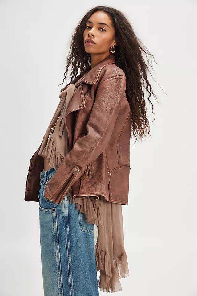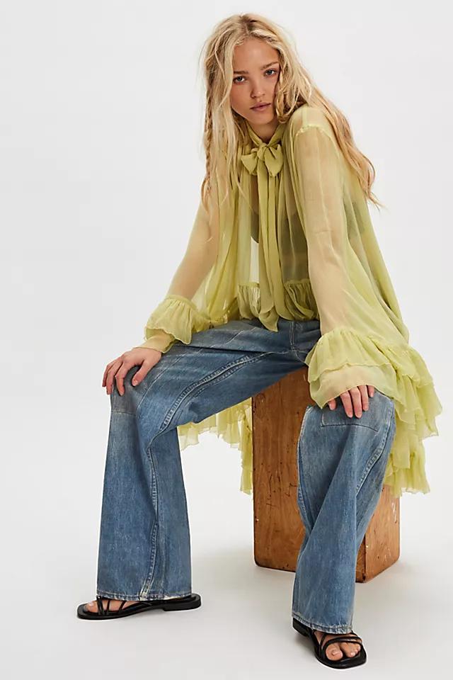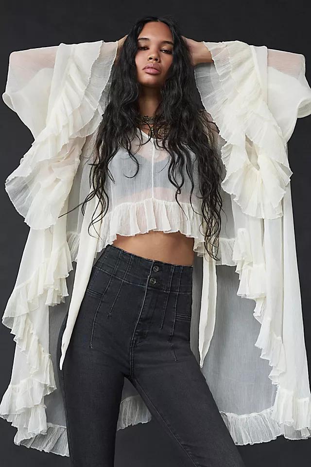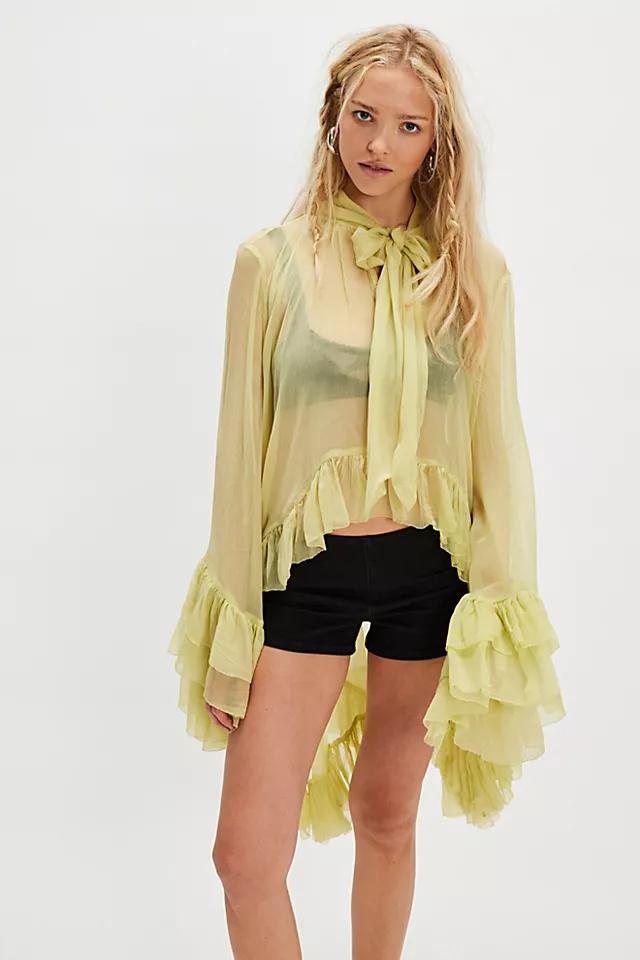 **Features:** Sheer fabrication with a lightweight feel, low scoop-neckline, exaggerated long-sleeves, cascading ruffled trim, defined seam detailing, high-low hem