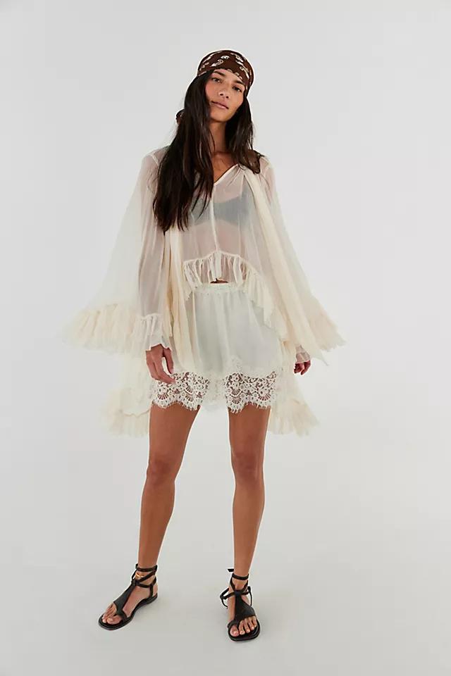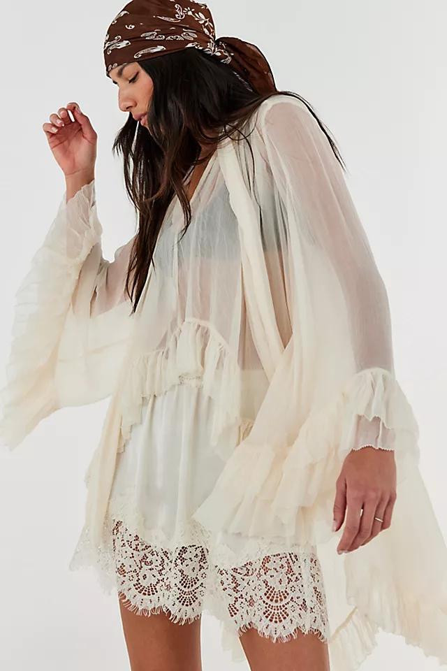 Beautiful and billowy, this top features a sheer fabrication and low scoop-neckline with exaggerated long-sleeves and cascading ruffles.