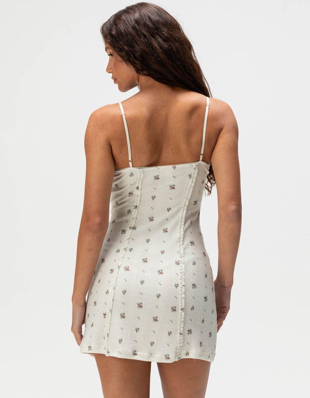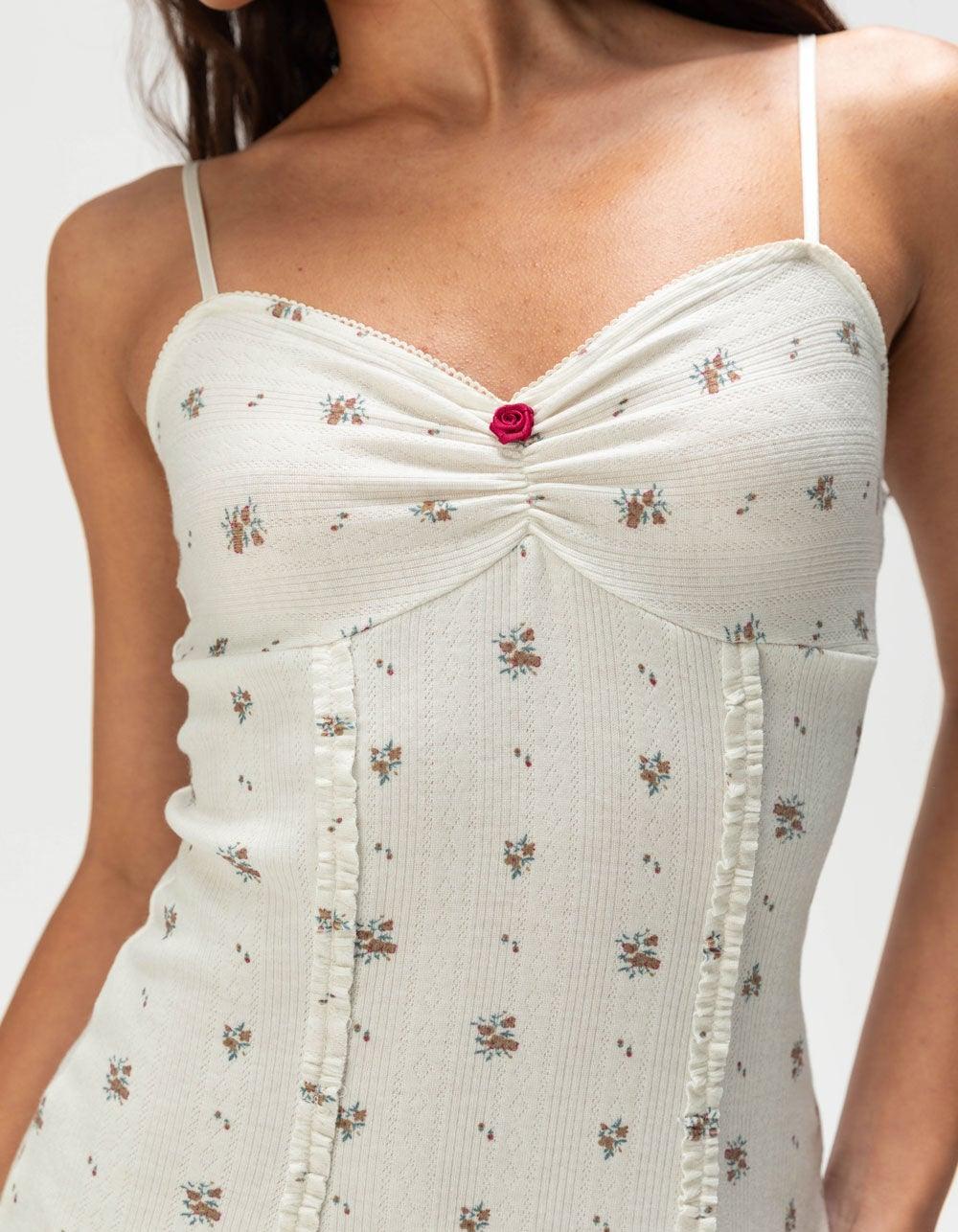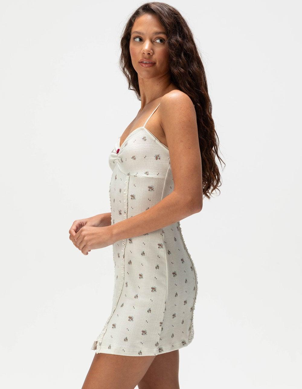 NATURAL. Full Tilt Floral Knit Babydoll Dress. Allover floral print with small slit at front left hem. Adjustable spaghetti straps. Cinching at center front with rosette detail and delicate trim along the top. Super soft fabric that makes this dress so comfortable you will want to wear it all day and night. Approximate length 31.5" 80% Polyester, 14% Rayon, 6% Spandex. Hand wash. Imported.