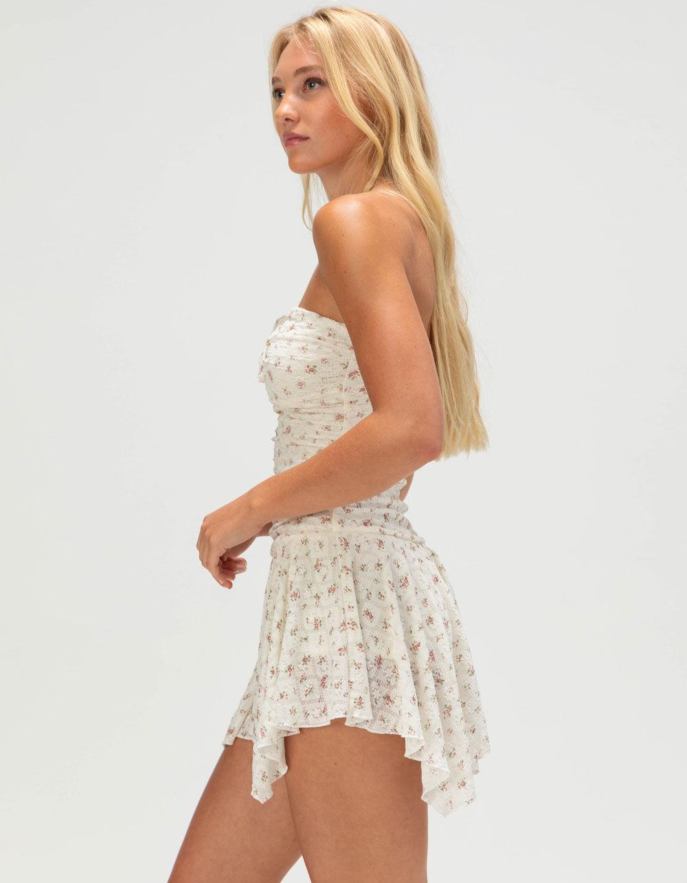 Full Tilt Floral Ruched Tube Dress. The Full Tilt Floral Ruched Tube Dress is your go-to piece for flirty, feminine style. Featuring an allover floral print and delicate lace accents, this sleeveless tube dress combines romantic charm with a flattering fit. The ruched sides hug your curves in all the right places, while the tie detail at the neckline adds a playful touch. Fully lined for comfortable wear, this dress is perfect for date nights, weekend outings, or any time you want to feel effortlessly pretty. 90% Nylon 10% Spandex. Lining: 95% Polyester 5% Spandex. Machine wash. Imported.