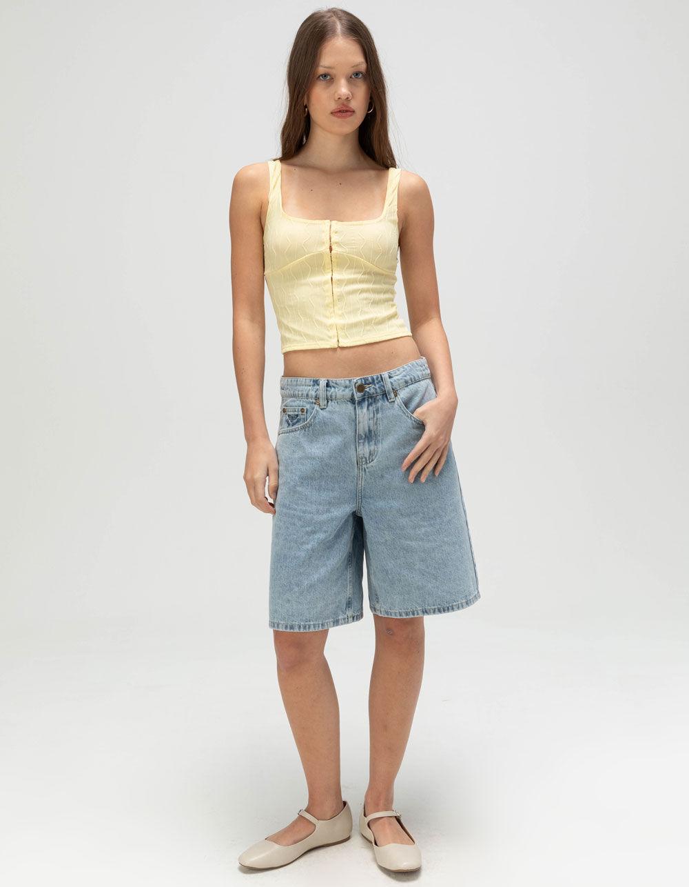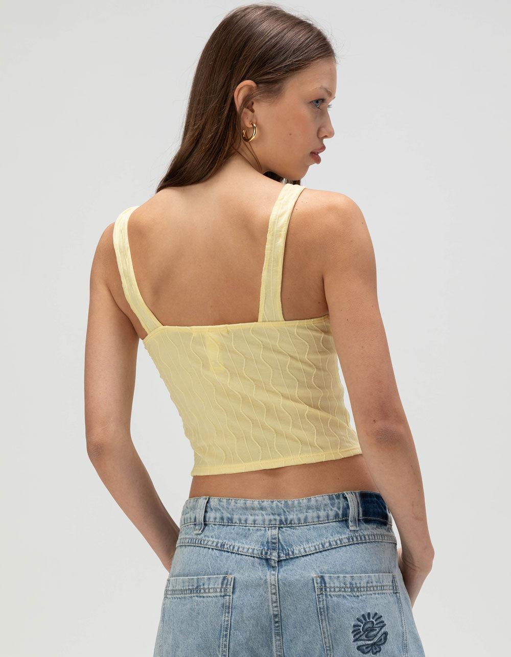 YELLOW. Full Tilt Hook And Eye Texture Tank Top. Combining texture with mesh give a unique look to this tank top. Seam detailing on the front and hook and eye closure. Fully lined. Self: 90% Nylon, 10% Spandex. Lining: 100% Polyester. Hand wash. Imported.