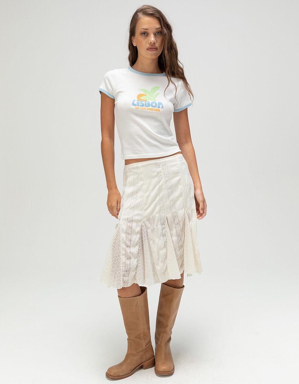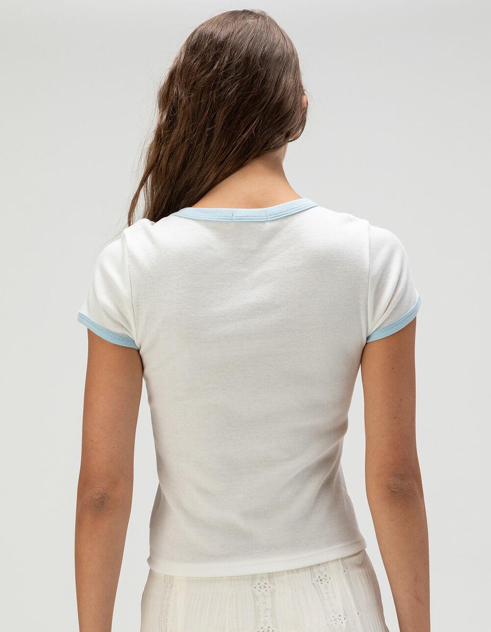 Full Tilt Lisbon Ringer Tee. The Full Tilt Lisbon Ringer Tee brings a laid-back, retro vibe to your wardrobe. This white ringer tee features light blue trim at the neckline and sleeves, adding a pop of color. A sun and palm tree graphic is screened on the front, evoking the perfect coastal feel. With a classic crew neck and short sleeves, this tee is ideal for casual days or pairing with your favorite denim. Made from a cotton-polyester blend, it offers a soft, comfortable fit with a touch of stretch for all-day wear. 50% Cotton 50% Polyester. Machine wash. Imported.