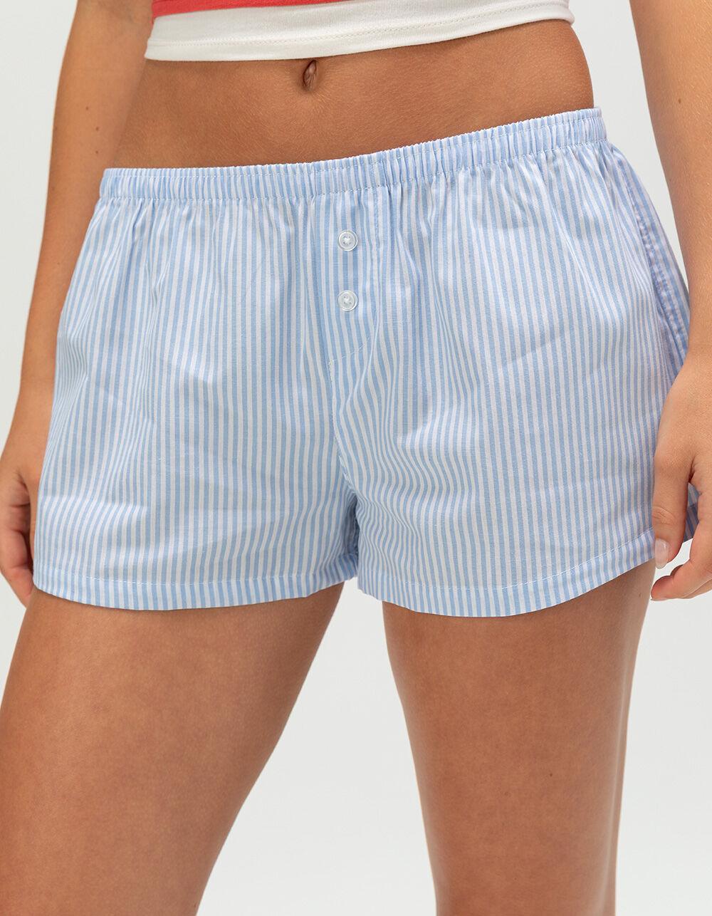 Full Tilt Low Rise Boxer Shorts. Stay cute and comfy in the Full Tilt Low Rise Boxer Shorts, the perfect blend of laid-back style and playful charm. Featuring an allover stripe pattern, these shorts are designed with a flattering low-rise fit and a comfy elastic waistband for easy wear. A faux fly with two decorative buttons adds a vintage-inspired touch, while the approximately 2" inseam keeps the look flirty and relaxed. Whether you're lounging at home or layering under your favorite oversized tee, these boxer shorts bring effortless comfort to your everyday wardrobe. 100% Cotton. Machine wash. Imported.