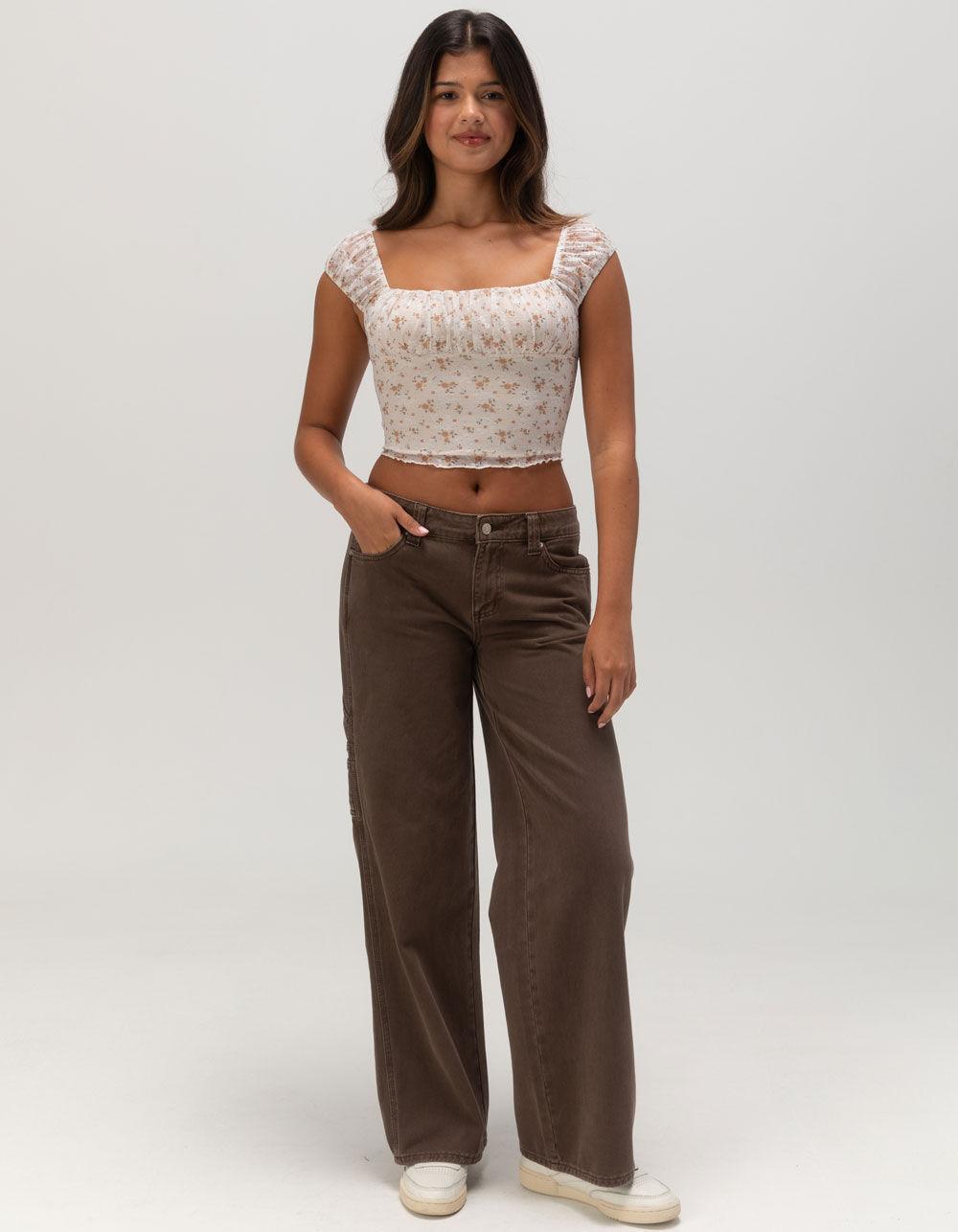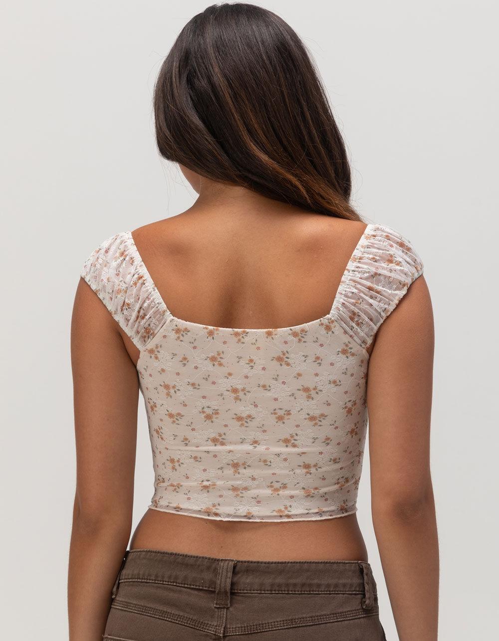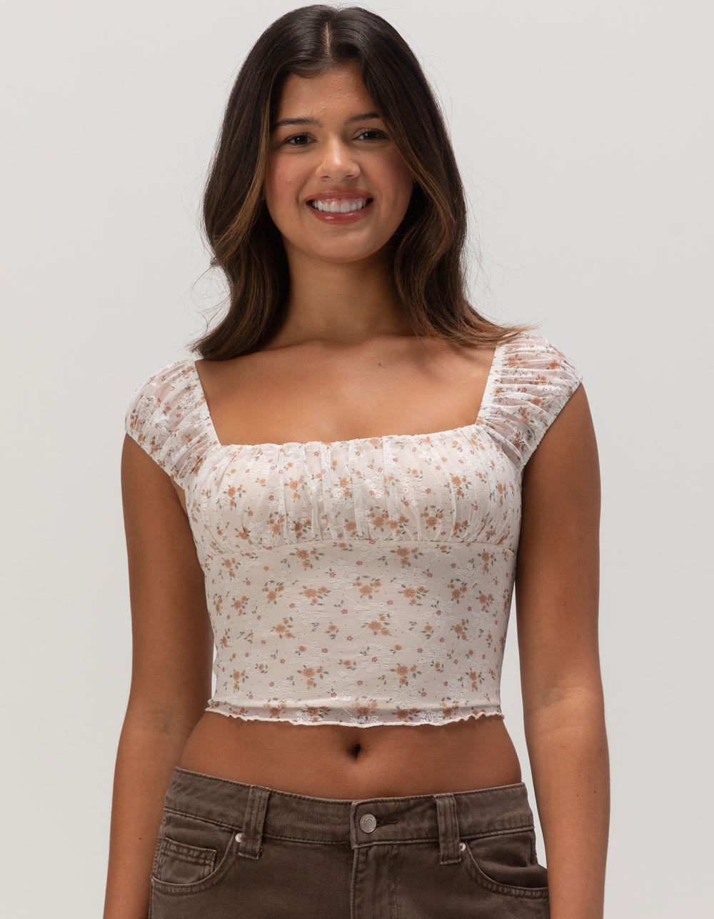 MULTI. Full Tilt Print Rouched Lace Top. Adorned with a beautiful floral print, this top features delicate lace detailing that adds an elegant touch. The ruched design enhances the fit, creating a flattering silhouette. Designed with an elastic neckline, this top can be worn on or off the shoulders, offering multiple styling options. 83% Polyester, 17% Spandex. Lining: 100% Polyester. Hand wash. Imported.
