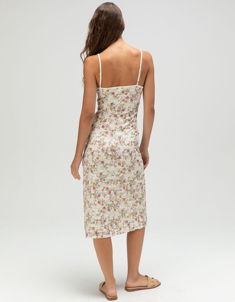 Cream Combo. Full Tilt Printed Lace Midi Dress. Turn heads in the effortlessly elegant Full Tilt Printed Lace Midi Dress. This stunning midi dress features a vibrant allover floral design set against delicate lace and mesh fabric, creating a dreamy, romantic look. The V-neckline and adjustable spaghetti straps offer a flattering, customizable fit, while the fully lined interior ensures comfort and confidence. With its sleeveless design and a graceful approximately 46" length from shoulder to hem, this dress is perfect for everything from garden parties to date nights. Light, airy, and full of feminine charm, it’s a must-have for your dress collection. 95% Polyester 5% Spandex. Lining: 100% Polyester. Machine wash. Imported.