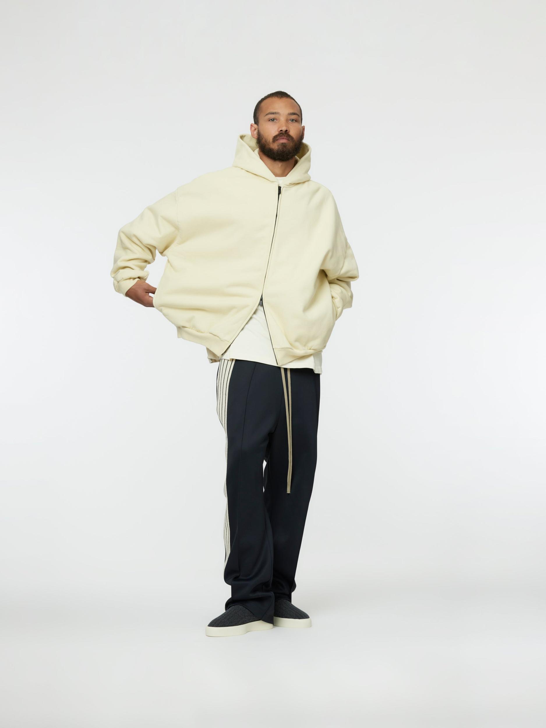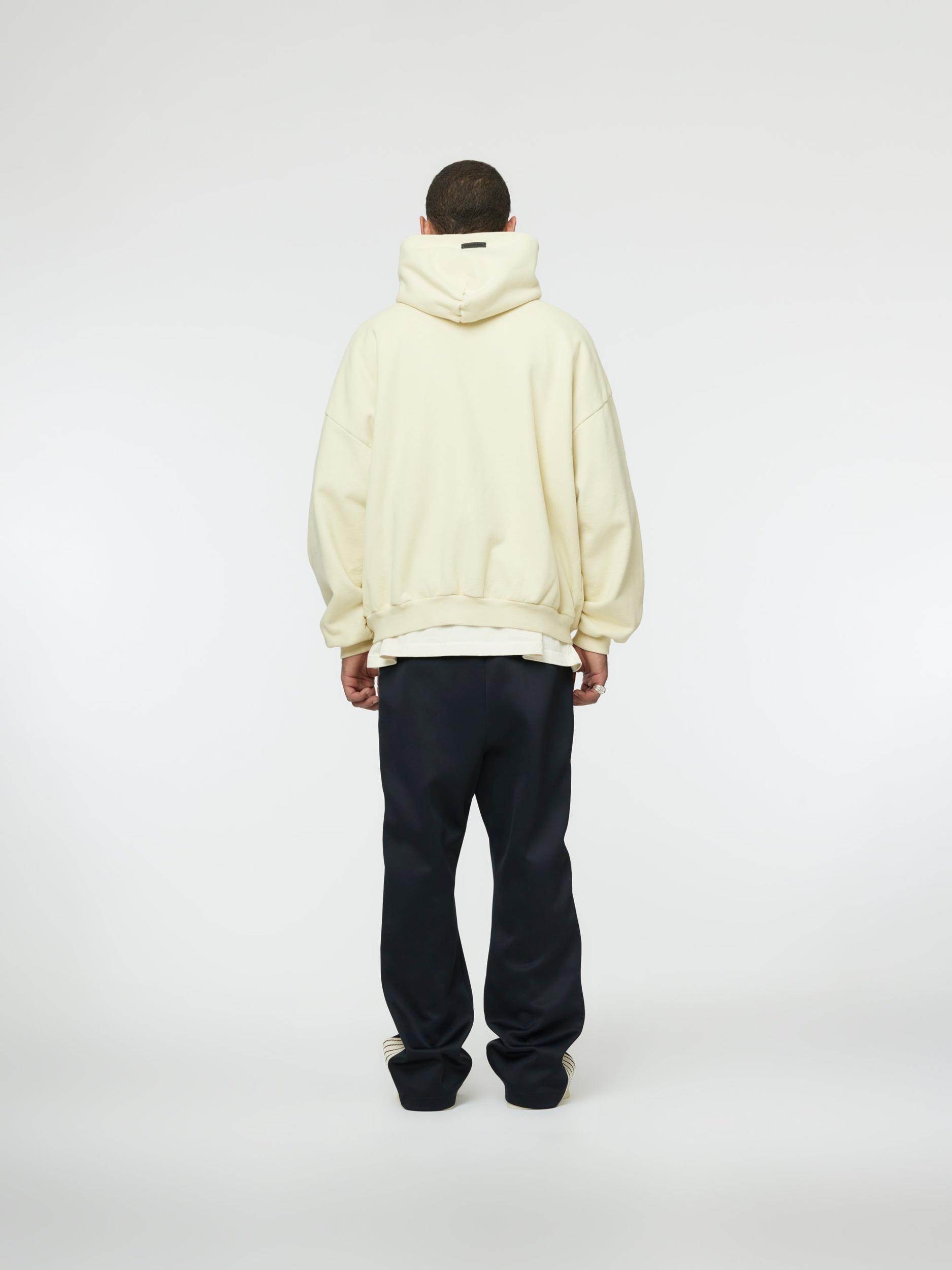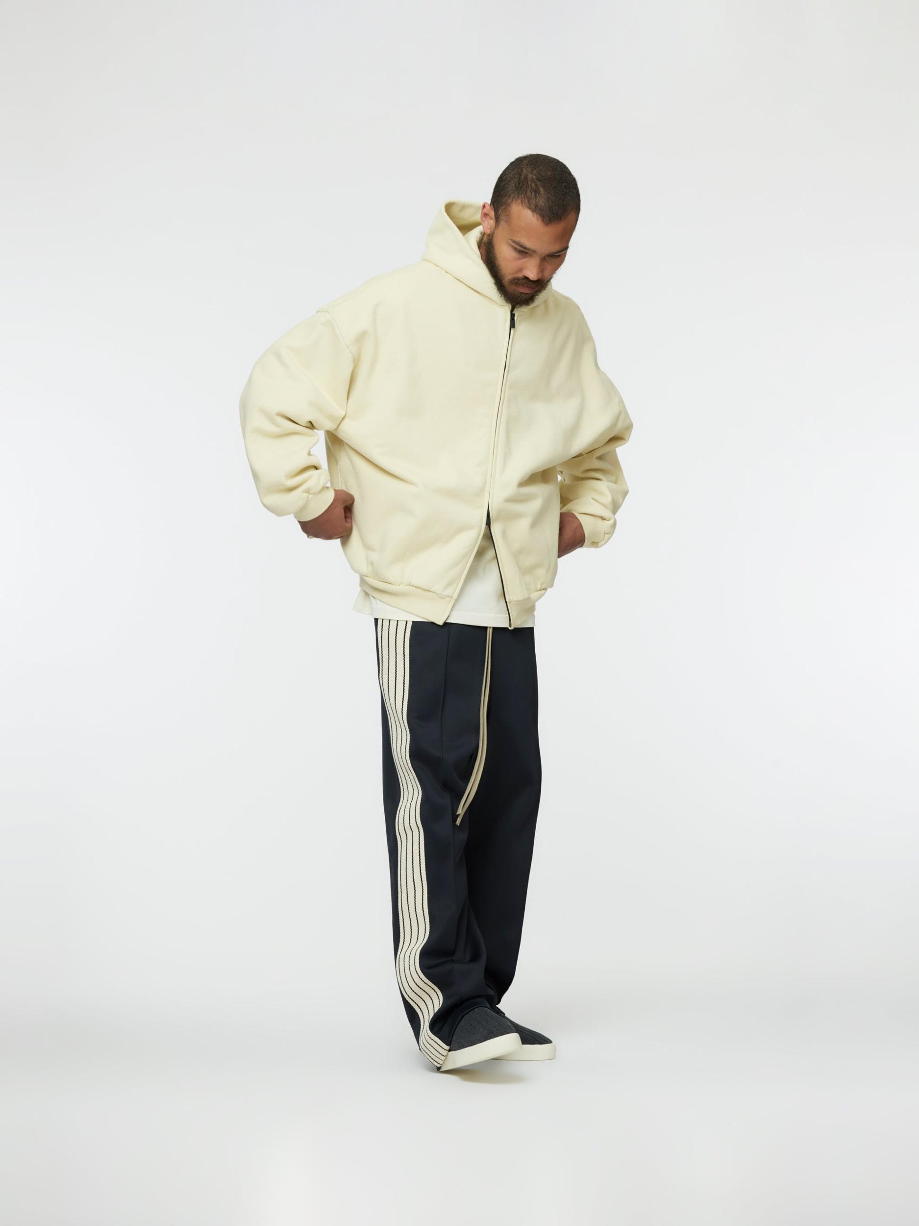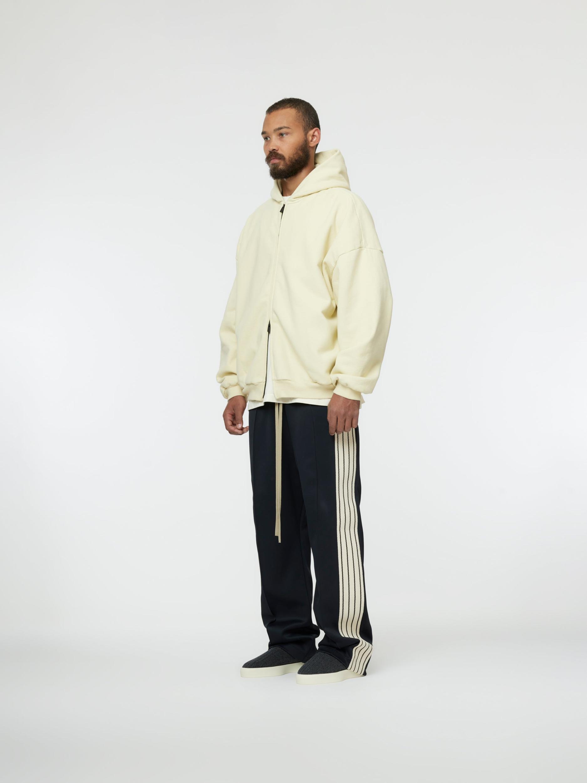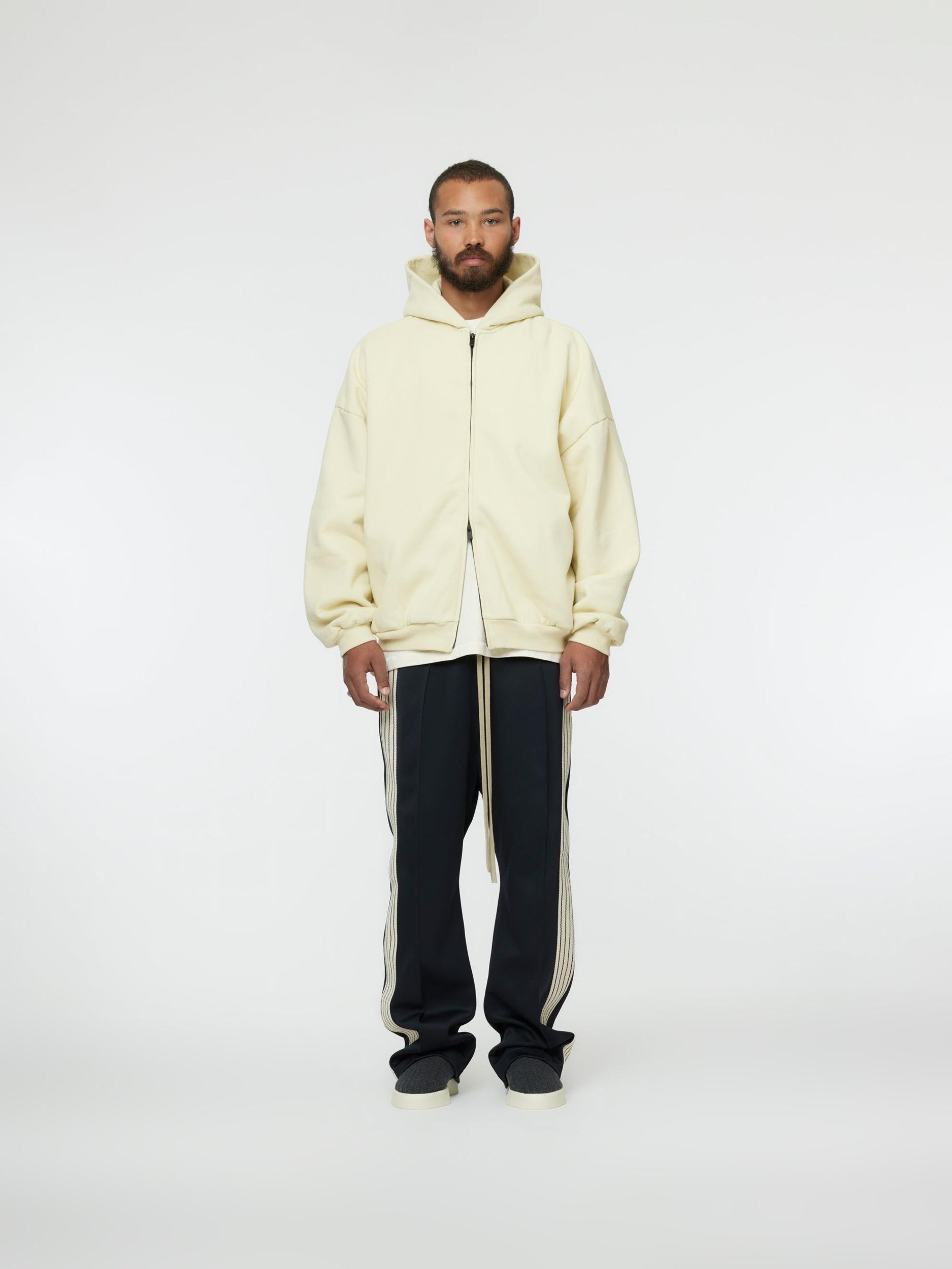 The Full Zip Hoodie is made in the USA from 100% cotton fleece with a vintage wash to contribute depth and softness. The signature Fear of God fit is evident with a relaxed silhouette, dropped shoulders, and a double-layered hood. Additional details include an antique brass zipper front, side pockets, rib-knit cuffs, and waist hem. A leather Fear of God label is stitched on the hood. Model is 6'2 wearing size L