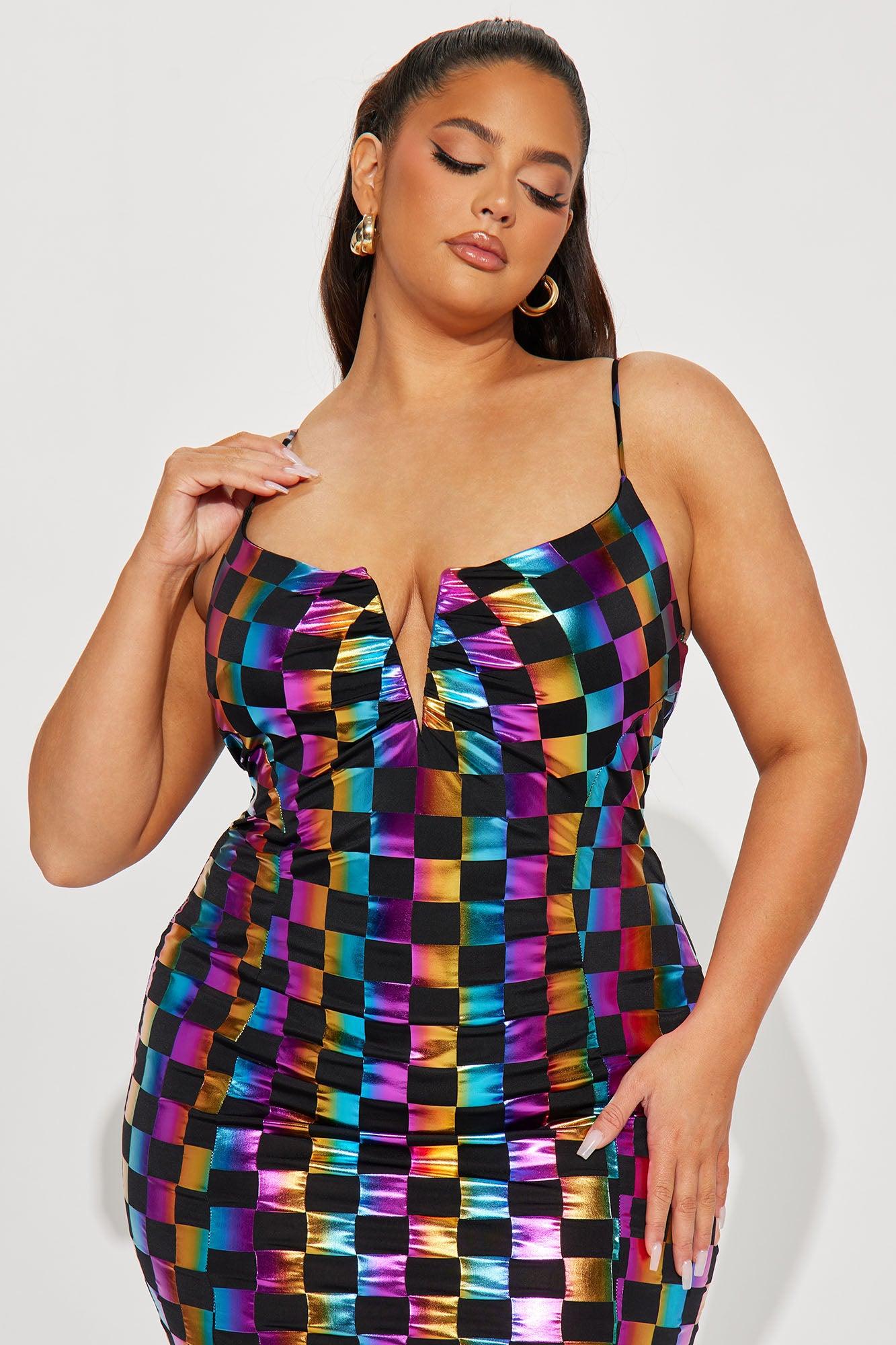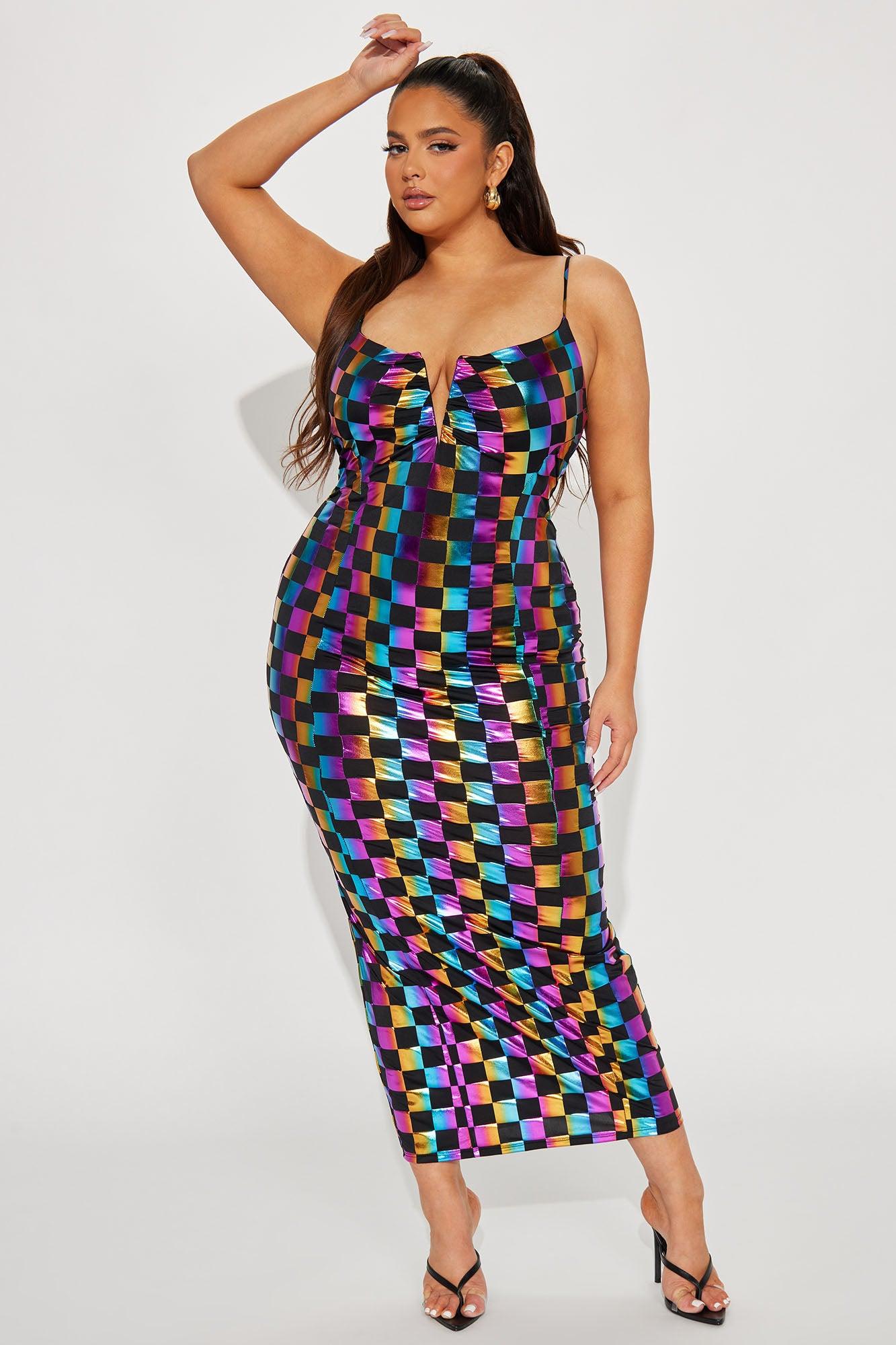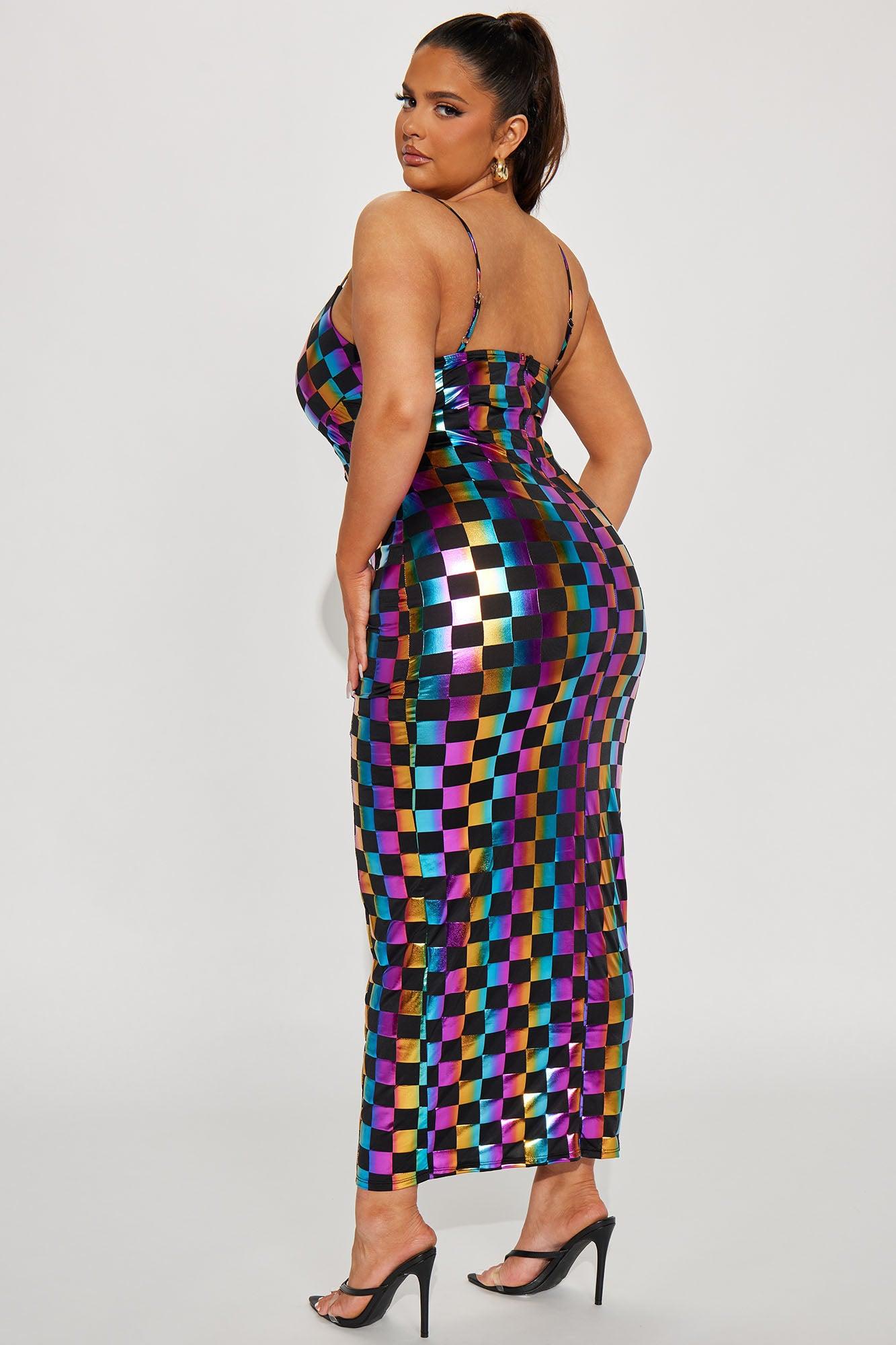 Available In Black. Metallic Maxi Dress Checkered Design Spaghetti Straps Deep V-Neck Stretch Disclaimer Print Placement May Vary Self: 95% polyester 5% Spandex Lining: 100% Polyester Imported